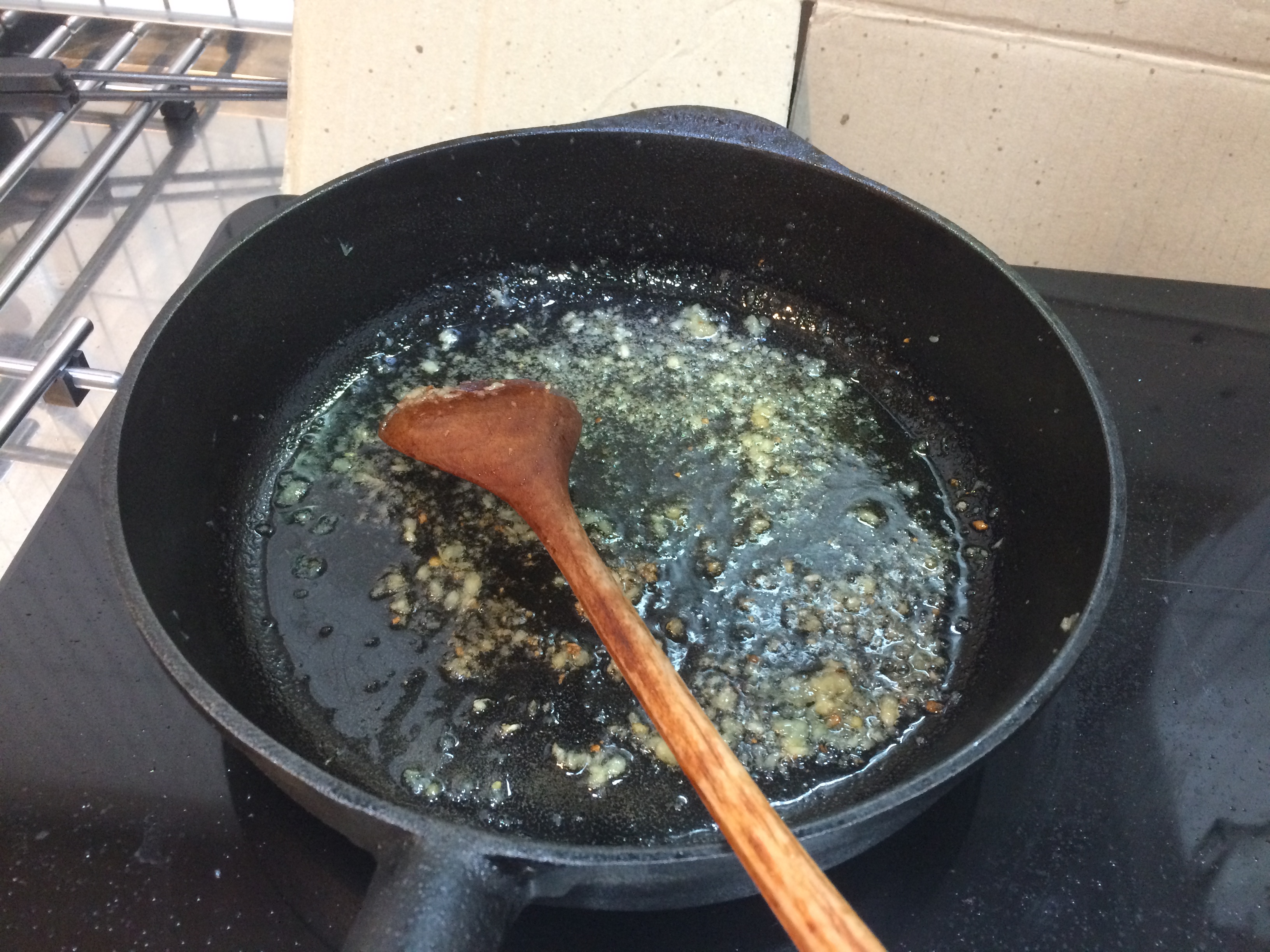 2. 프라이팬에 식용유를 붓고 마늘큐브를 구워준다 노릇해지면 한쪽으로 몰아둔다.