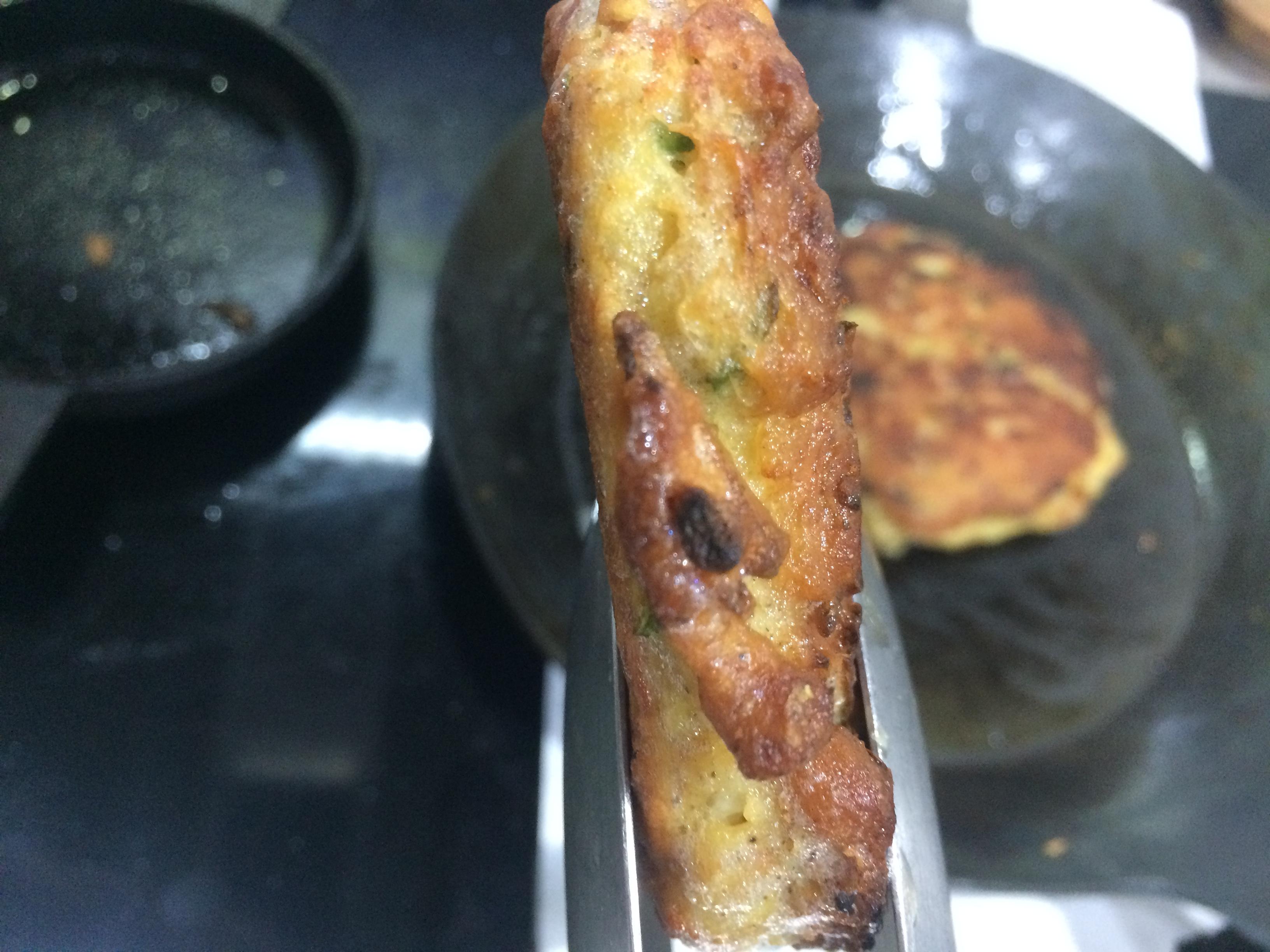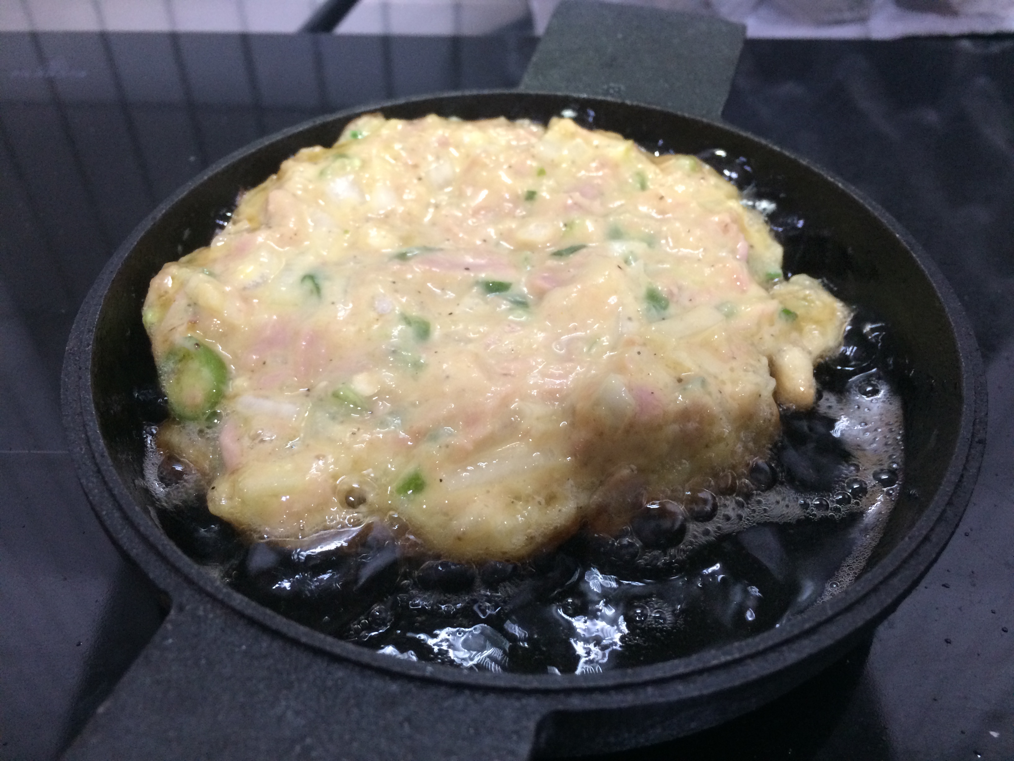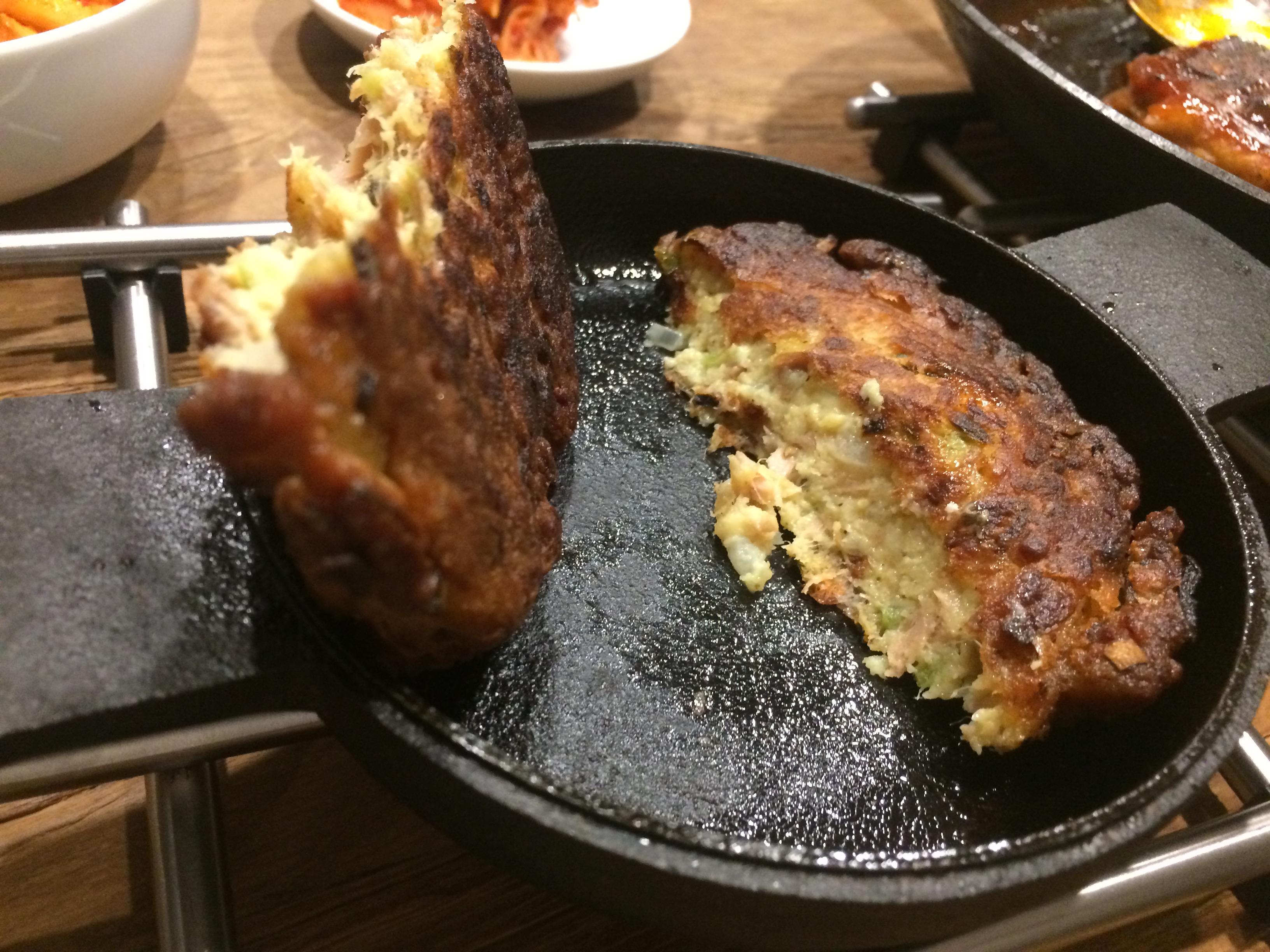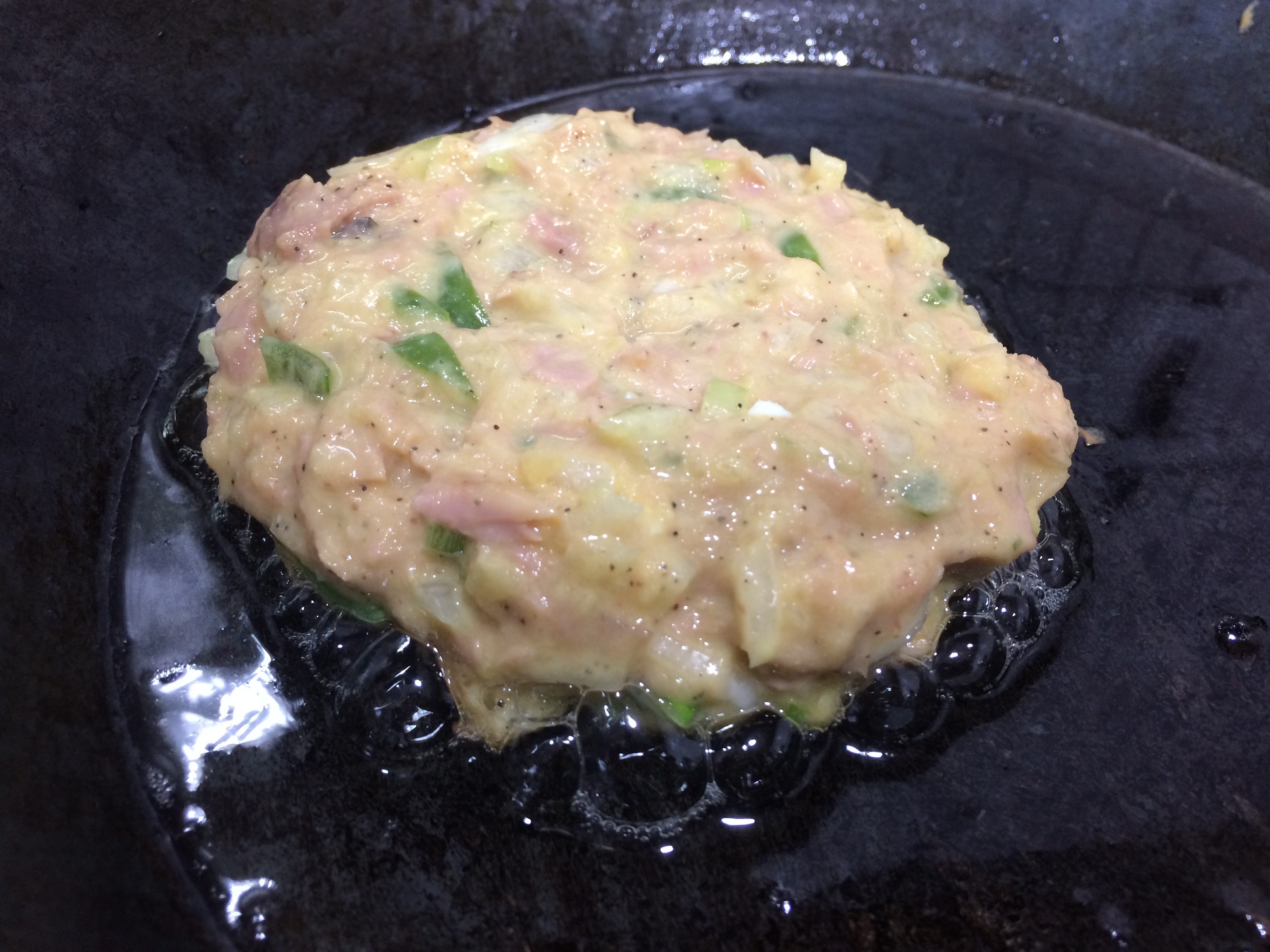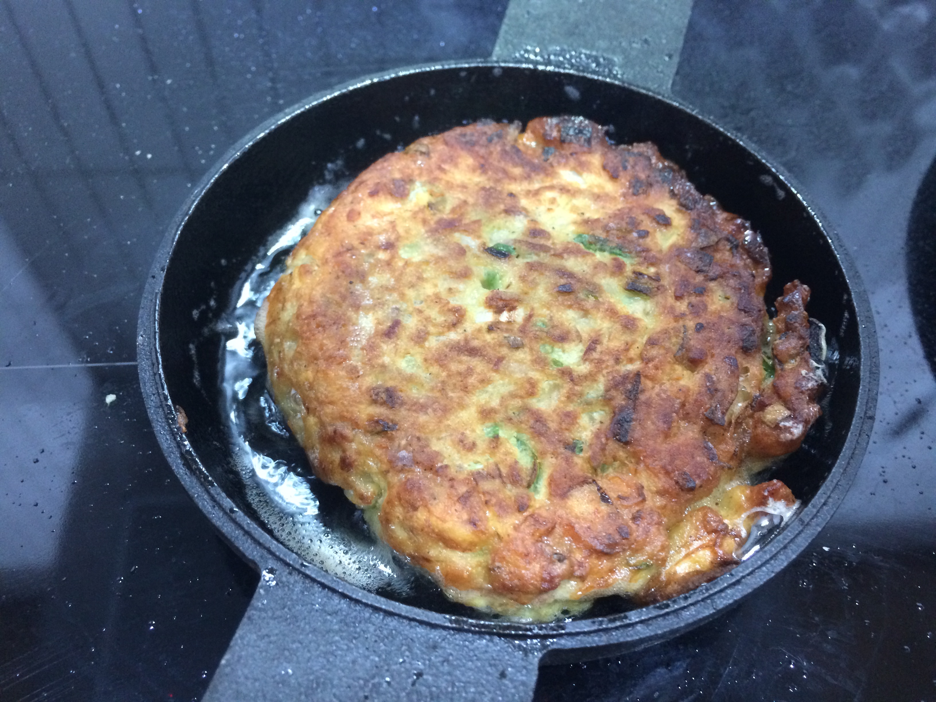 5. 빈 참치캔에 반죽을 가득 평평하게 담아 예열 된 프라이팬에 엎어 모양을 잡고 약 불로 줄여 골고루 튀기듯이 익힌다.