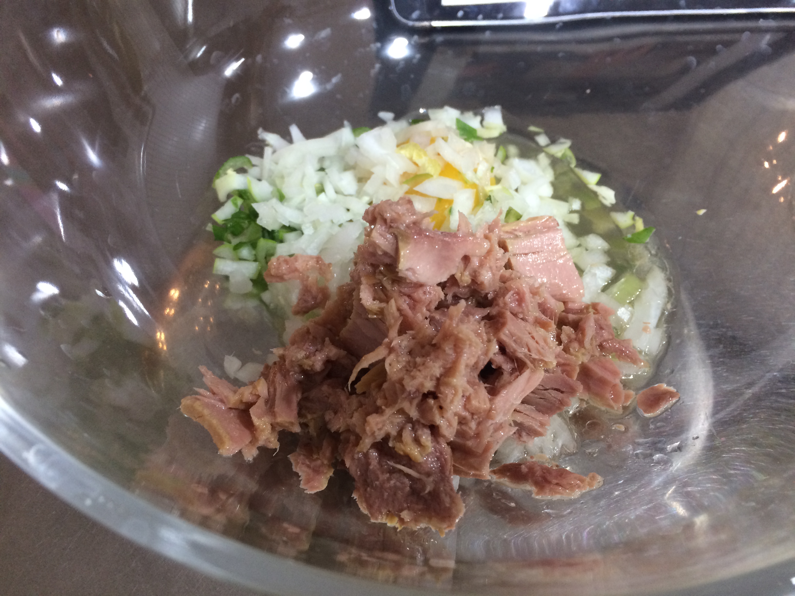 2. 볼에 참치 살코기와 다져서 준비해둔 양파, 대파, 간마늘, 청양고추, 달걀을 넣어 골고루 섞는다.