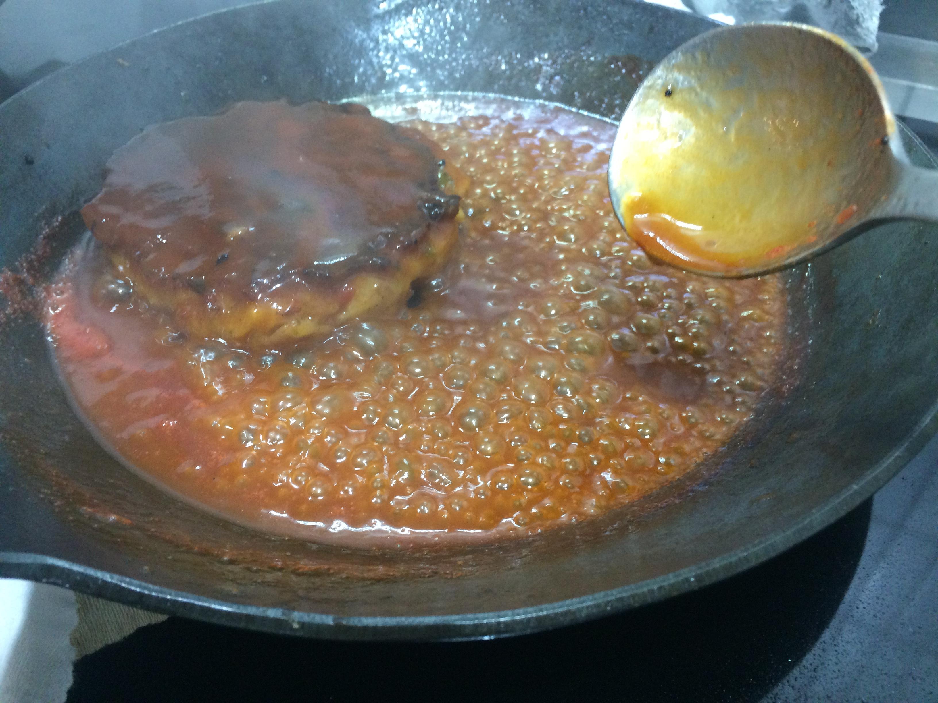 10. 졸일 때 함박 스테이크를 한 번 정도 뒤집어 주며 소스의 농도가 돈가스 소스 정도가 되면 불을 끈다.