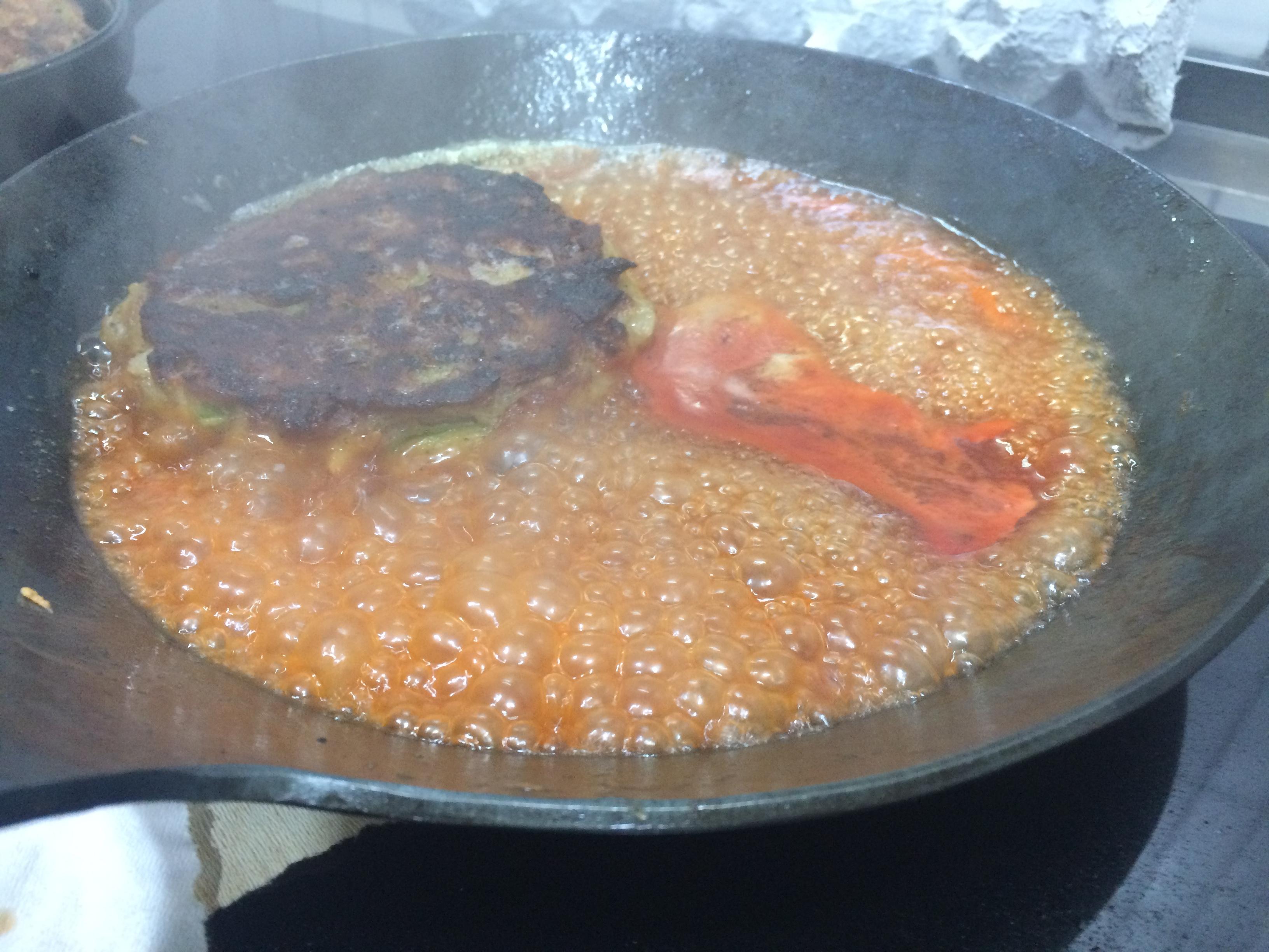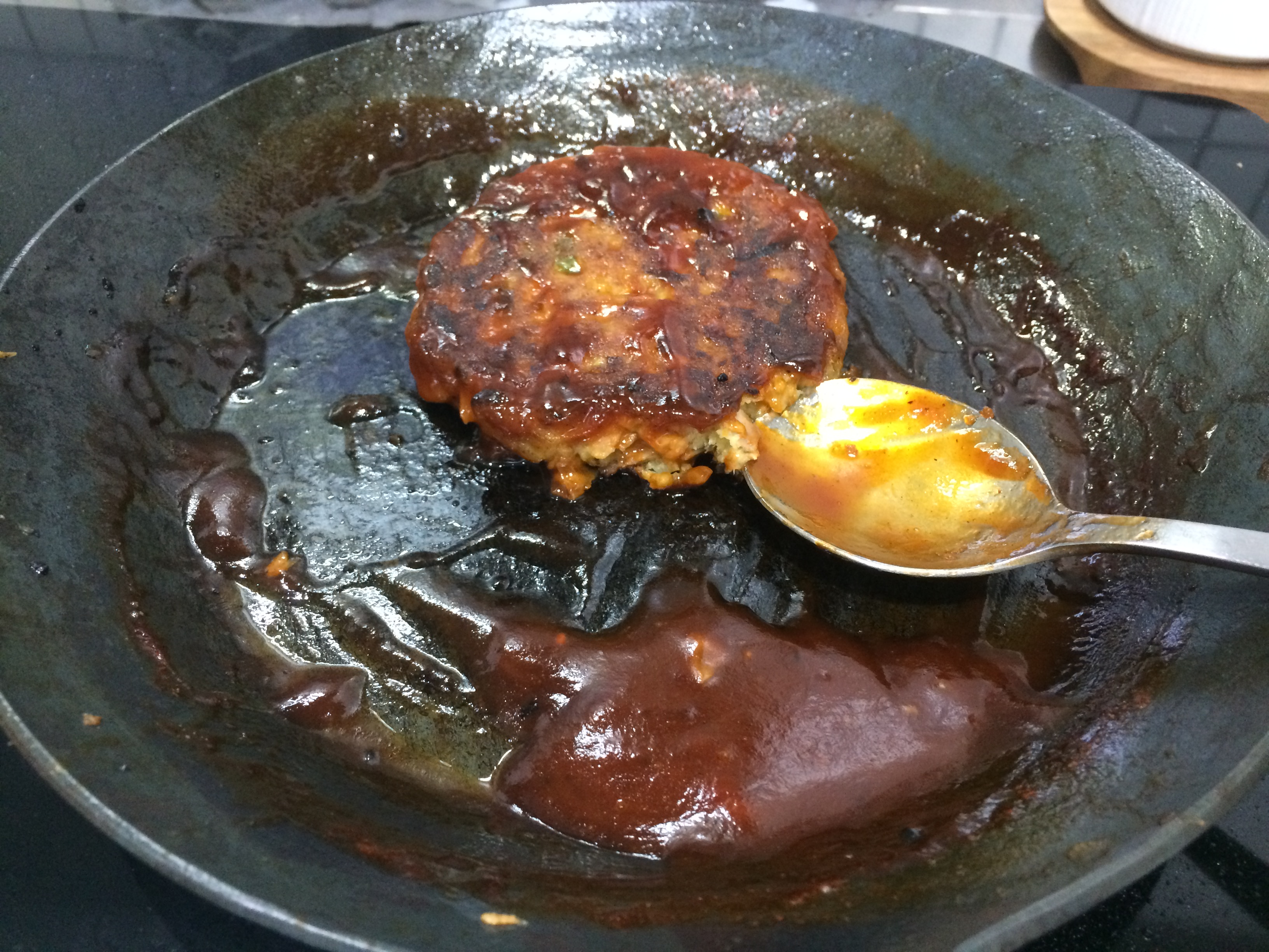 9. 프라이팬 한 쪽에 만들어둔 소스재료를 부어 참치 함박 스테이크와 함께 중 불에 졸인다.