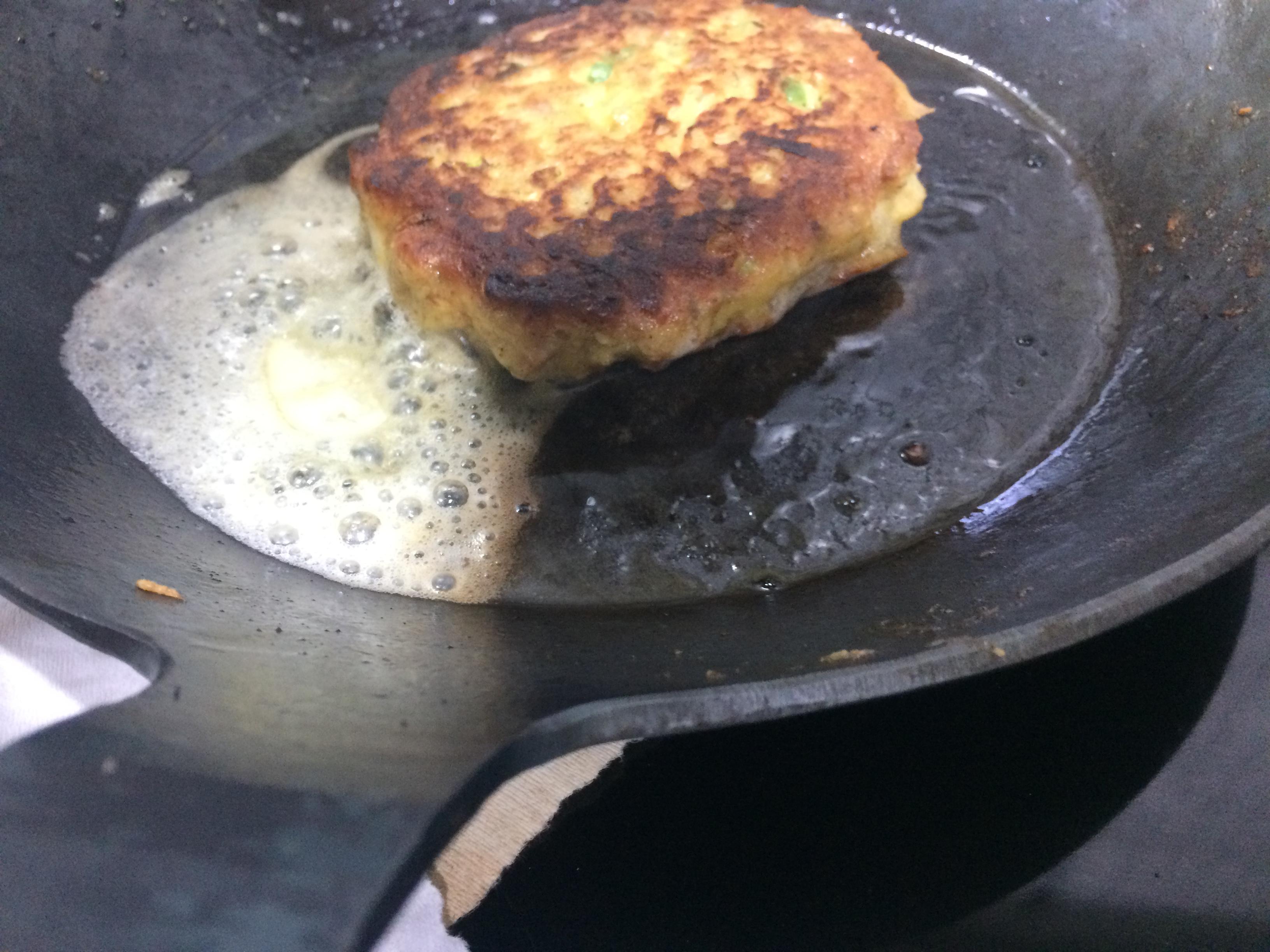 8. 참치 함박 스테이크의 양면이 노릇해지면 버터를 넣고 프라이팬을 돌려가며 버터향을 골고루 입힌다.