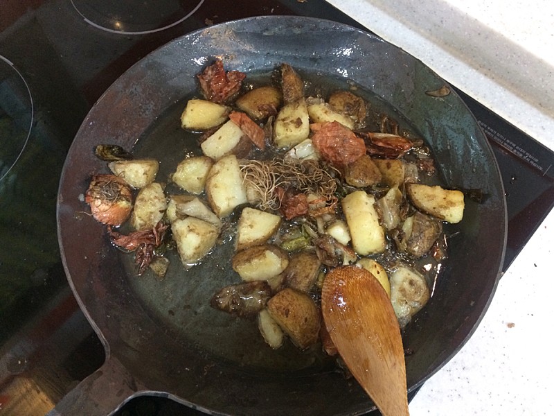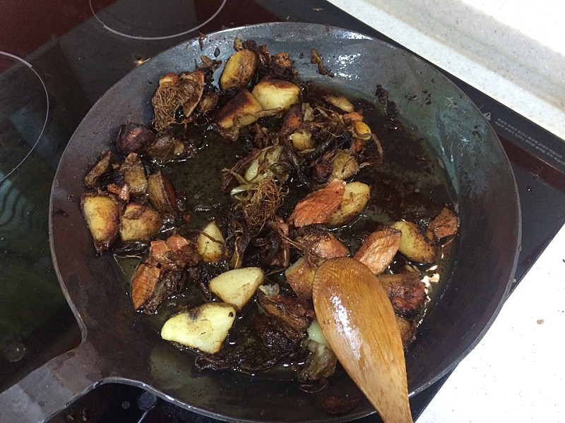 3. 감자 나 파 뿌리넣고 볶아주기 - 오래.. 찌꺼기가 될때까지 ㅎㅎㅎ (약불에)