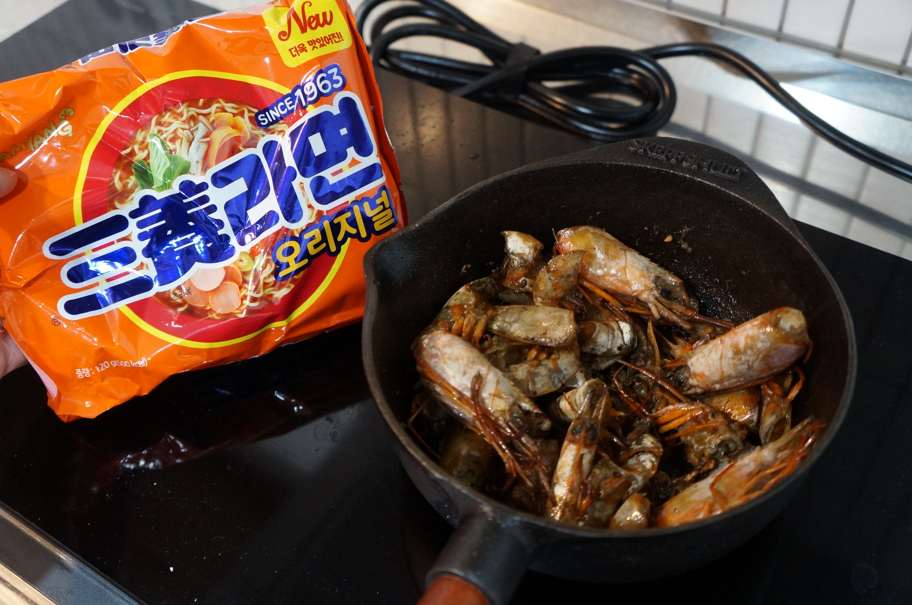 전체적으로 톤이 어둡네.. 육수는 새우머리!! 이제 라면 타임