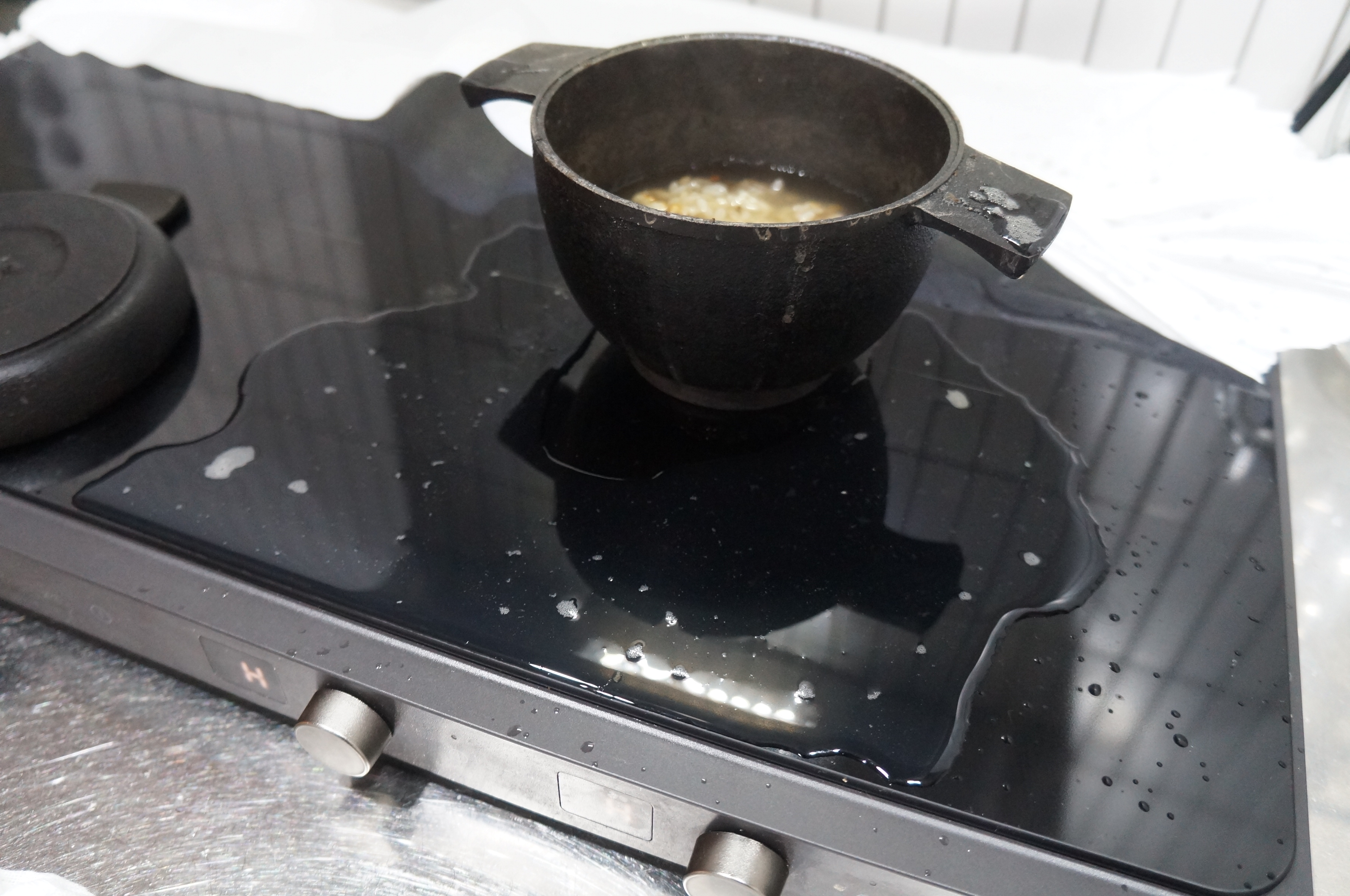 물 쌀 1:1 넣기전 침기름 시즈닝(반스푼 넣고 발라준다)