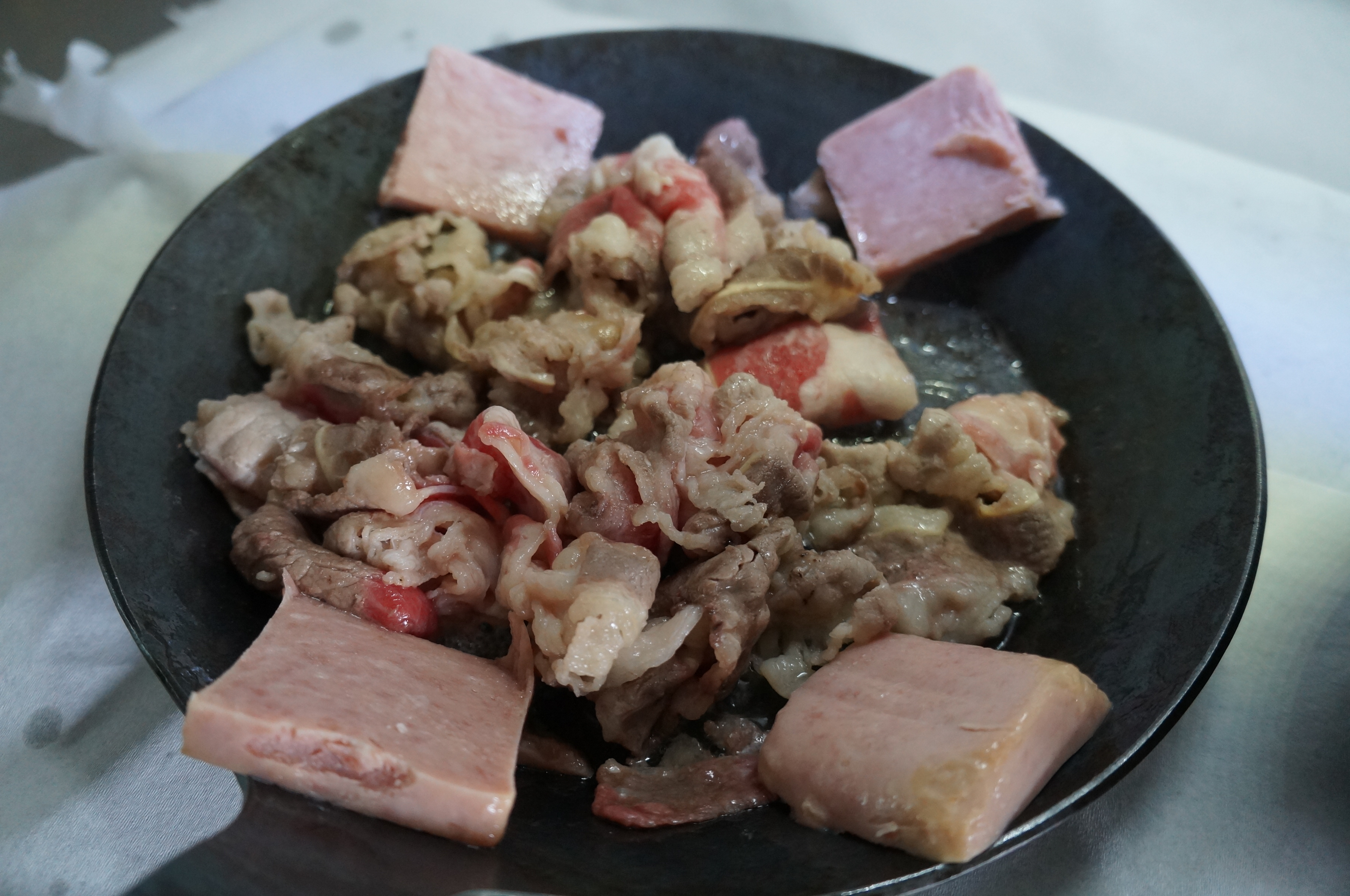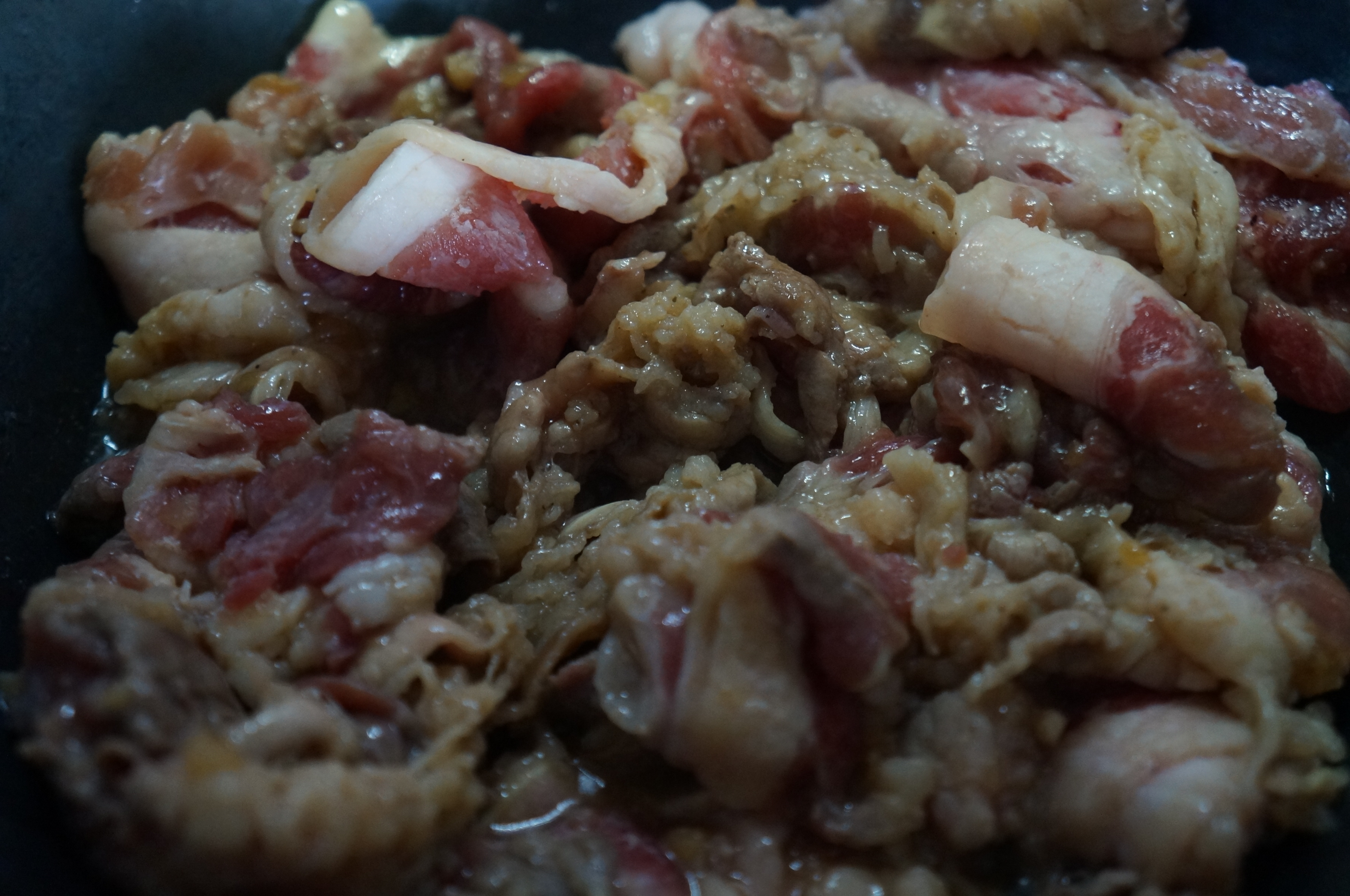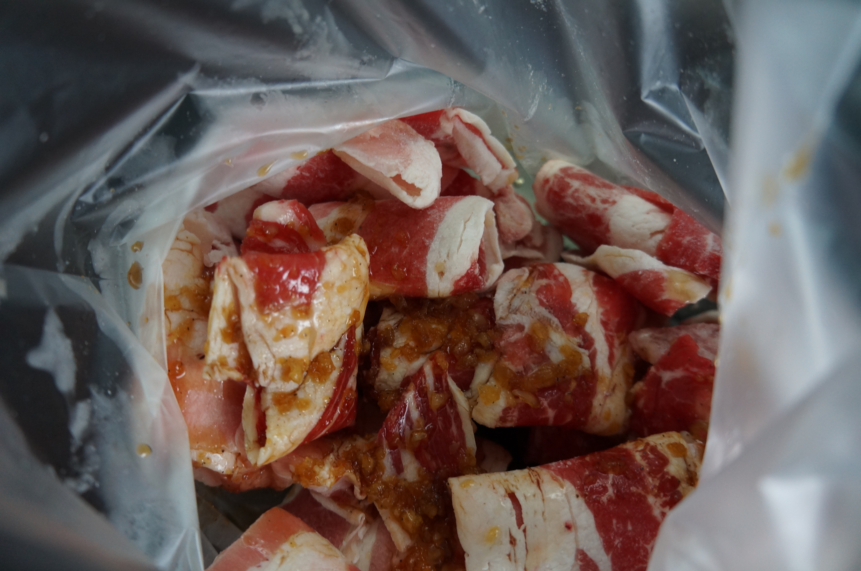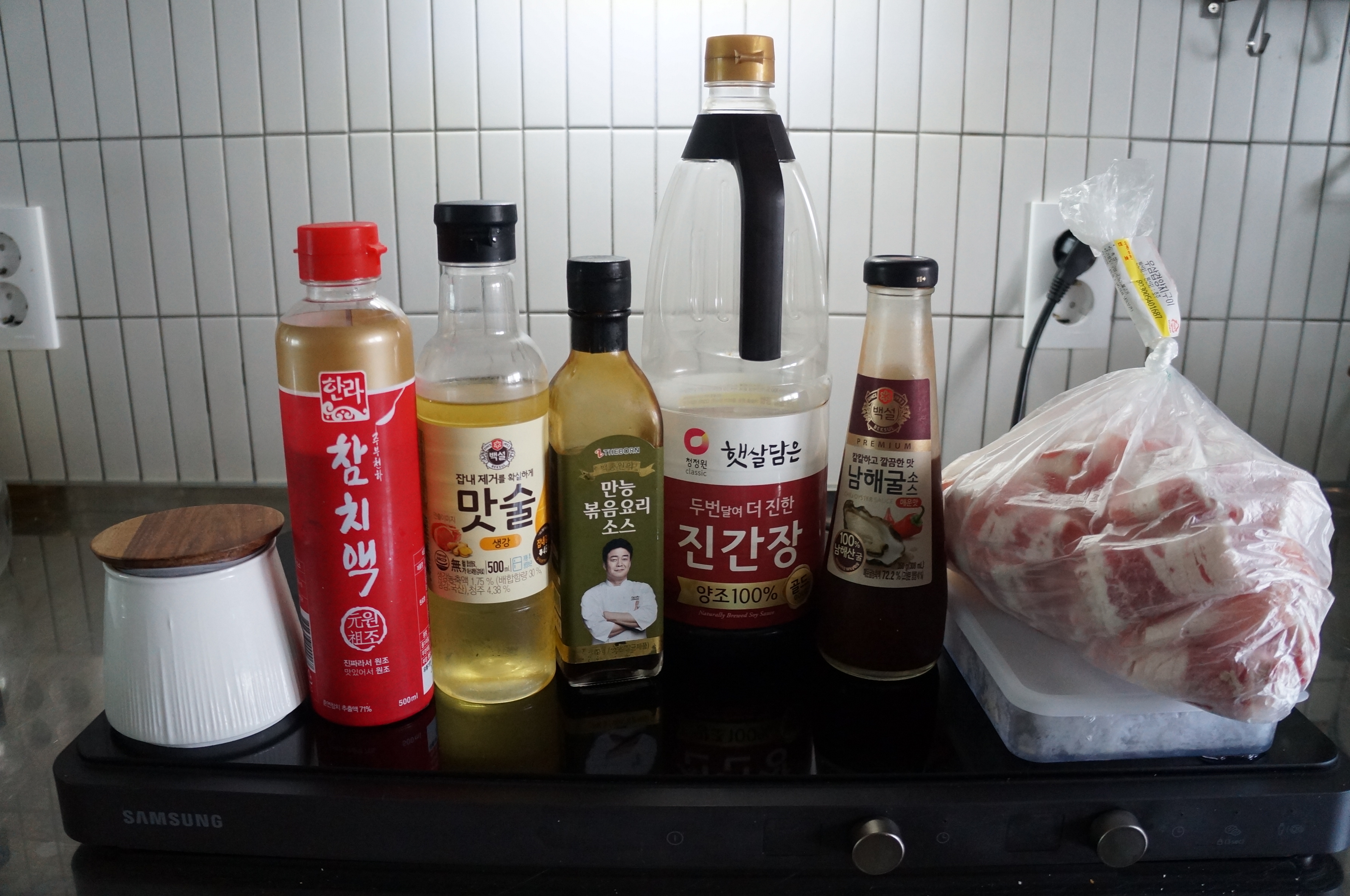 염지를 위한 재료들 설탕 참치액 맛술 볶음소스 진간장 굴소스 삼겹살 마늘