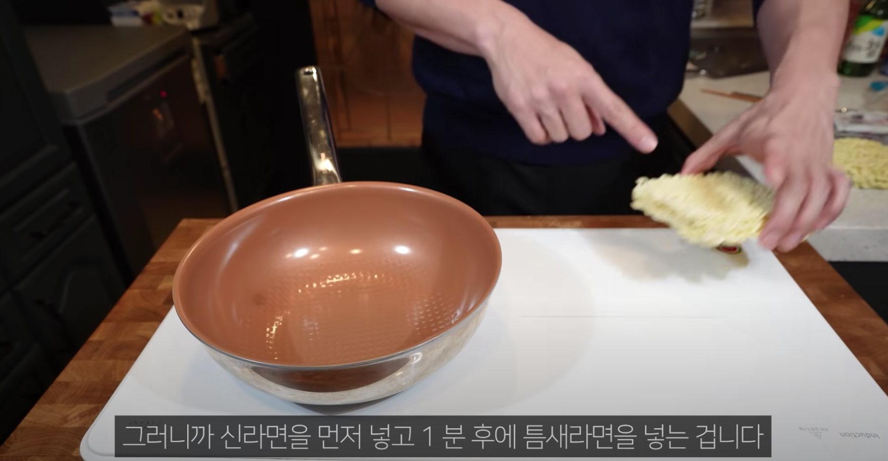 틈새라면의 포인트는 신라면이 1분더 끓여야 함으로 먼저 면을 넣는다 - 1분간격 ㅋ