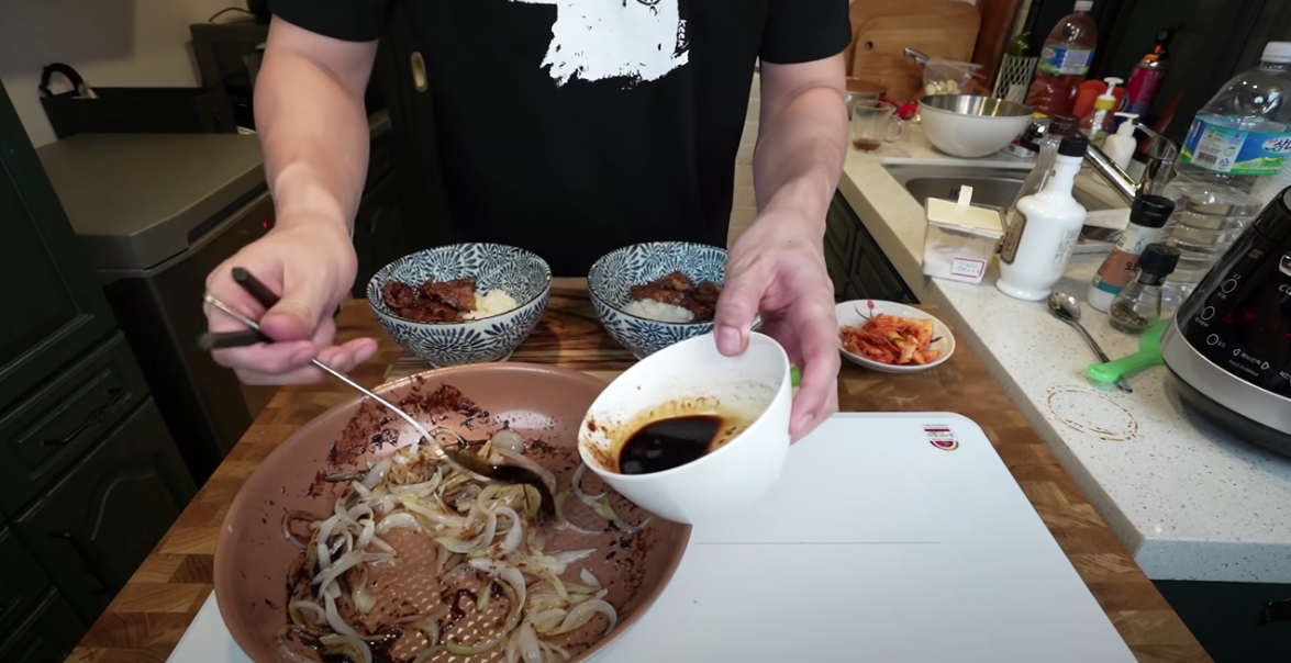 6. 김치 밑반찬으로 따로 꺼내놓기 7. 그릇에 밥을 담는다. 8. 밥 위에 맛있게 구워진 고기를 올린다. 9. 양파를 다시 굽는다. 양념장을 넣고 졸인다. 10. 반 남아있는 밥 위 공간에 양파를 올린다. 11. 가운데 계란 노른자, 대파 약간, 참깨 약간 뿌린다.