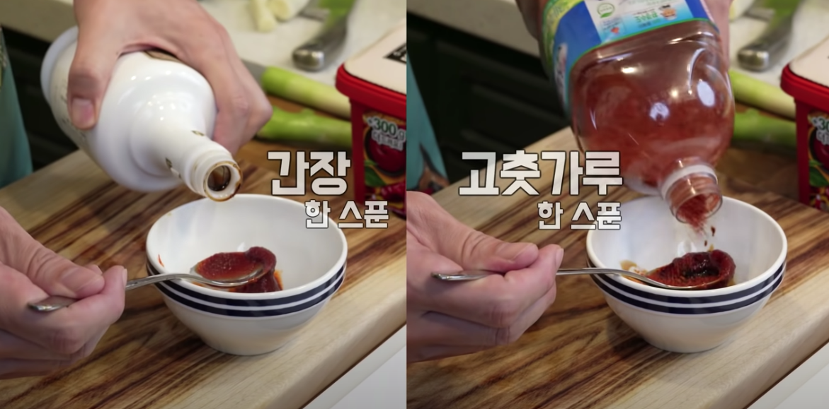 4. 다진 파, 청양고추, 간마늘, 간장(히게타), 물 조금, 설탕, 후추, 고춧가루, 참기름, 깨를 섞어서 양념장을 만든다