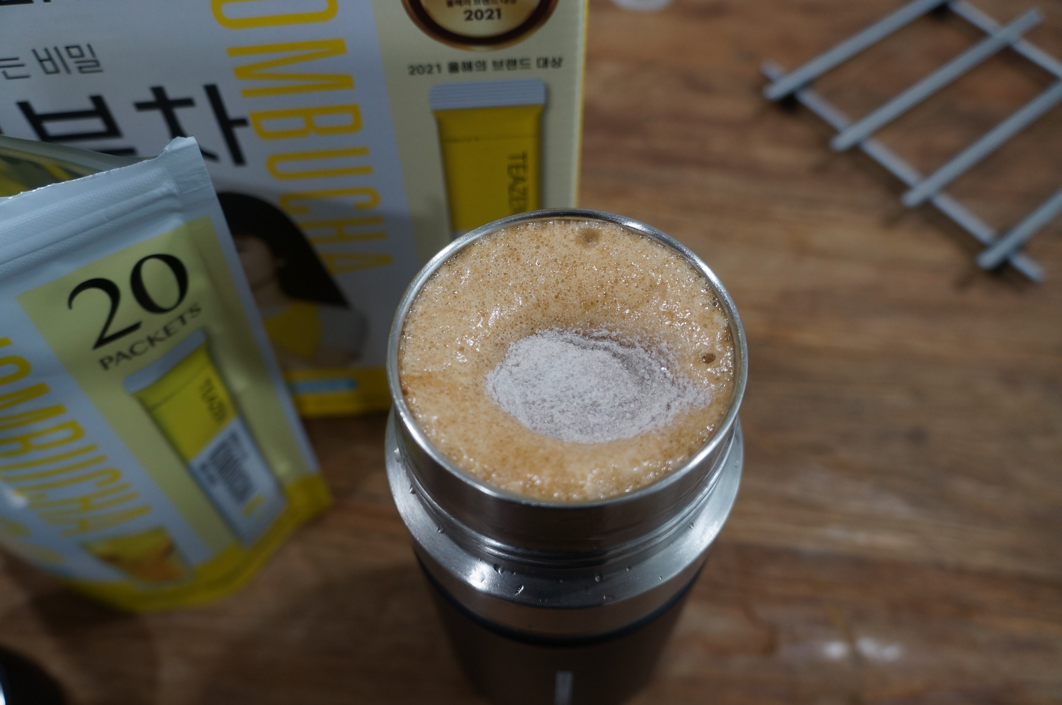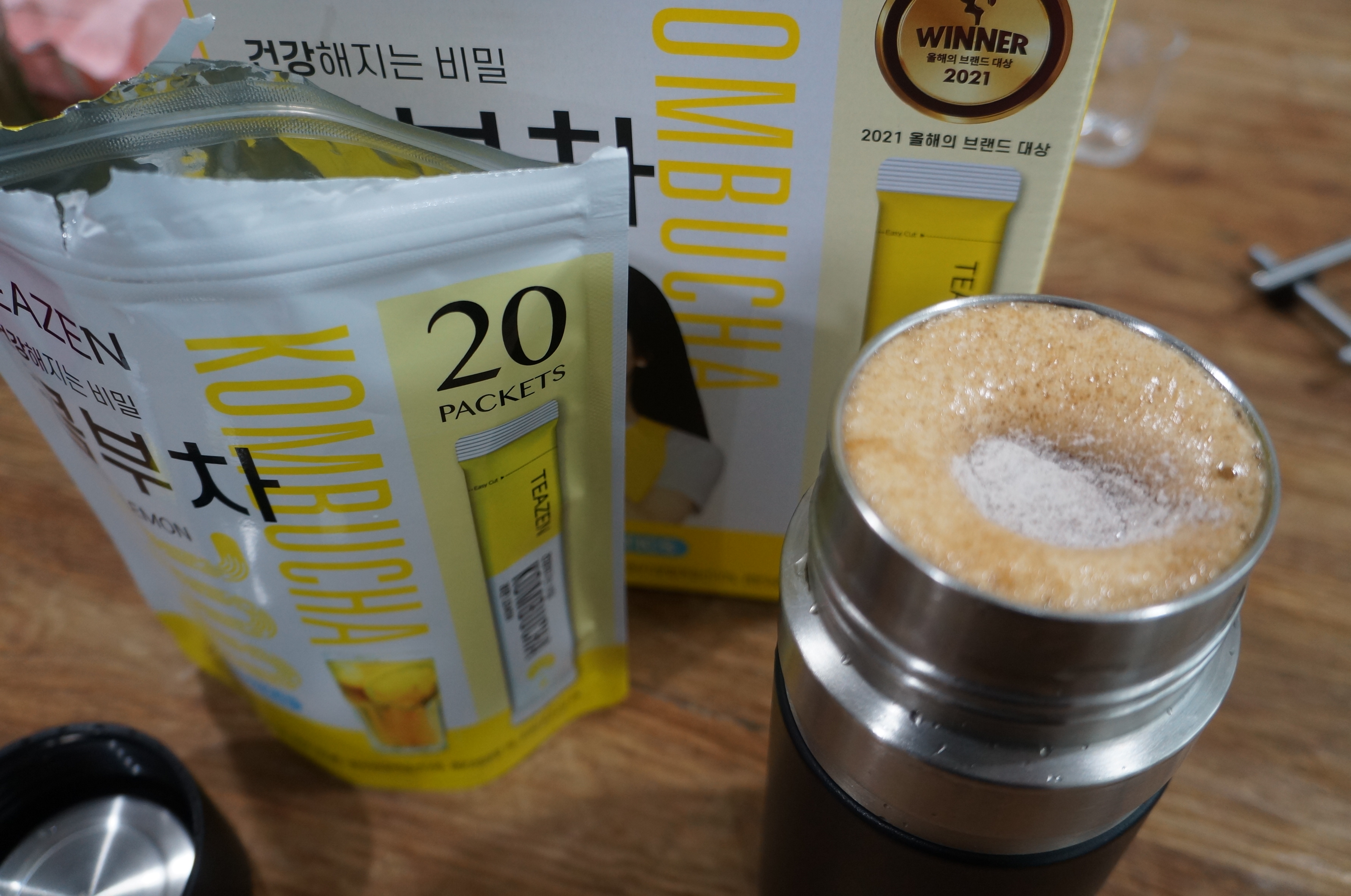 콤부차뜻은 설탕을 넣은 홍차나 녹차에 유익균인 아세트산 박테리아를 넣어 발효시킨 음료.