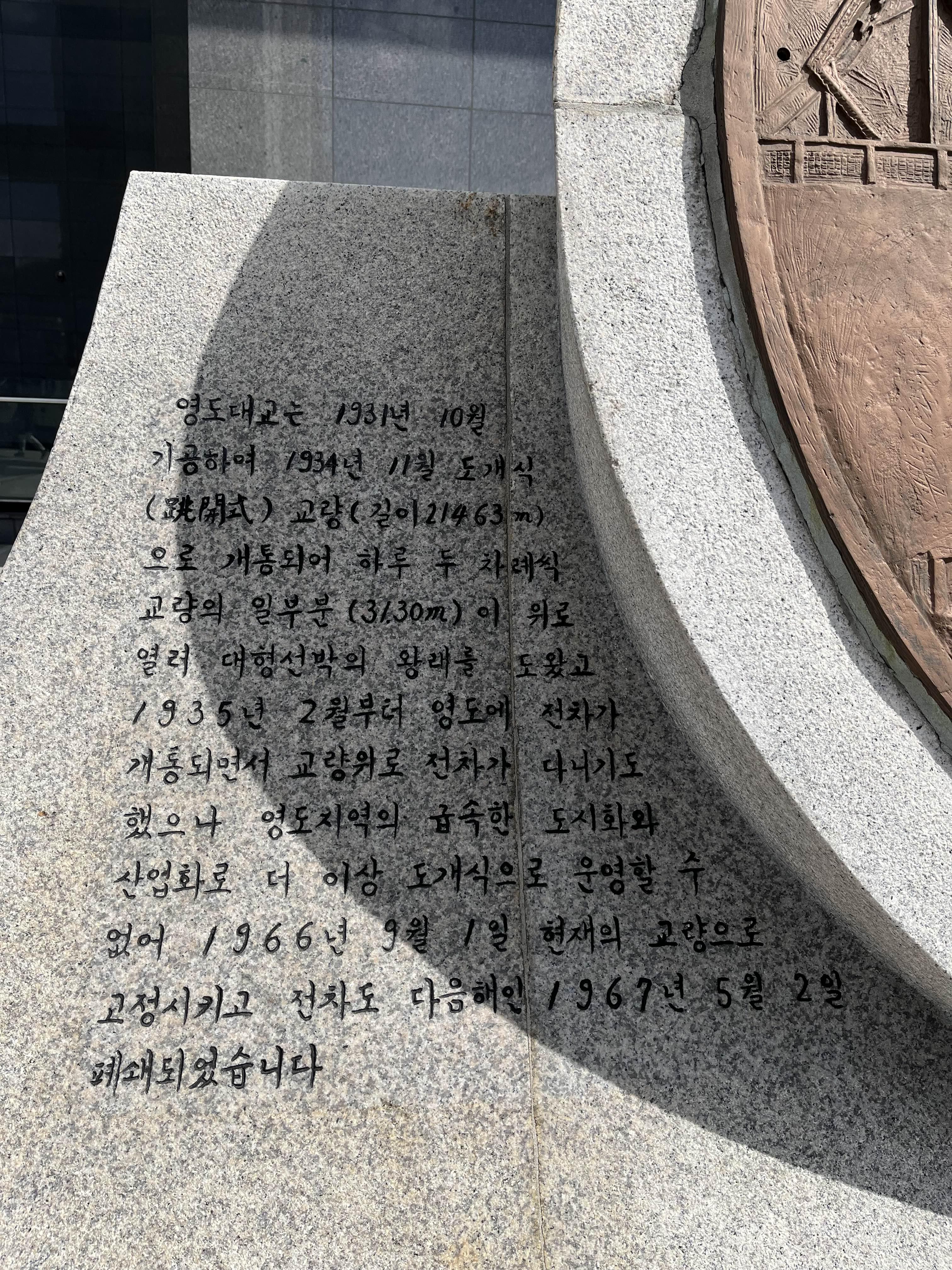 영도대교는 1931년 10월 기공하여 1934년 11월 도개식 교량으로 개통되어 하루 두 차례씩 교량의 일부분이 위로 열려 대형선박의 왕래를 도왔고, 1935년 2월부터 영도에 전차가? 개통되면서 교량위로 전차가 다니기도 했으나... 영도지역의 급속한 도시화와 산업화로 더 이상 도개식으로 운영할 수 없어 1966년 9월1일 현재의 교량으로 고정시키고 전차도 다음해인 1967년 5월2일 폐쇄되었습니다.