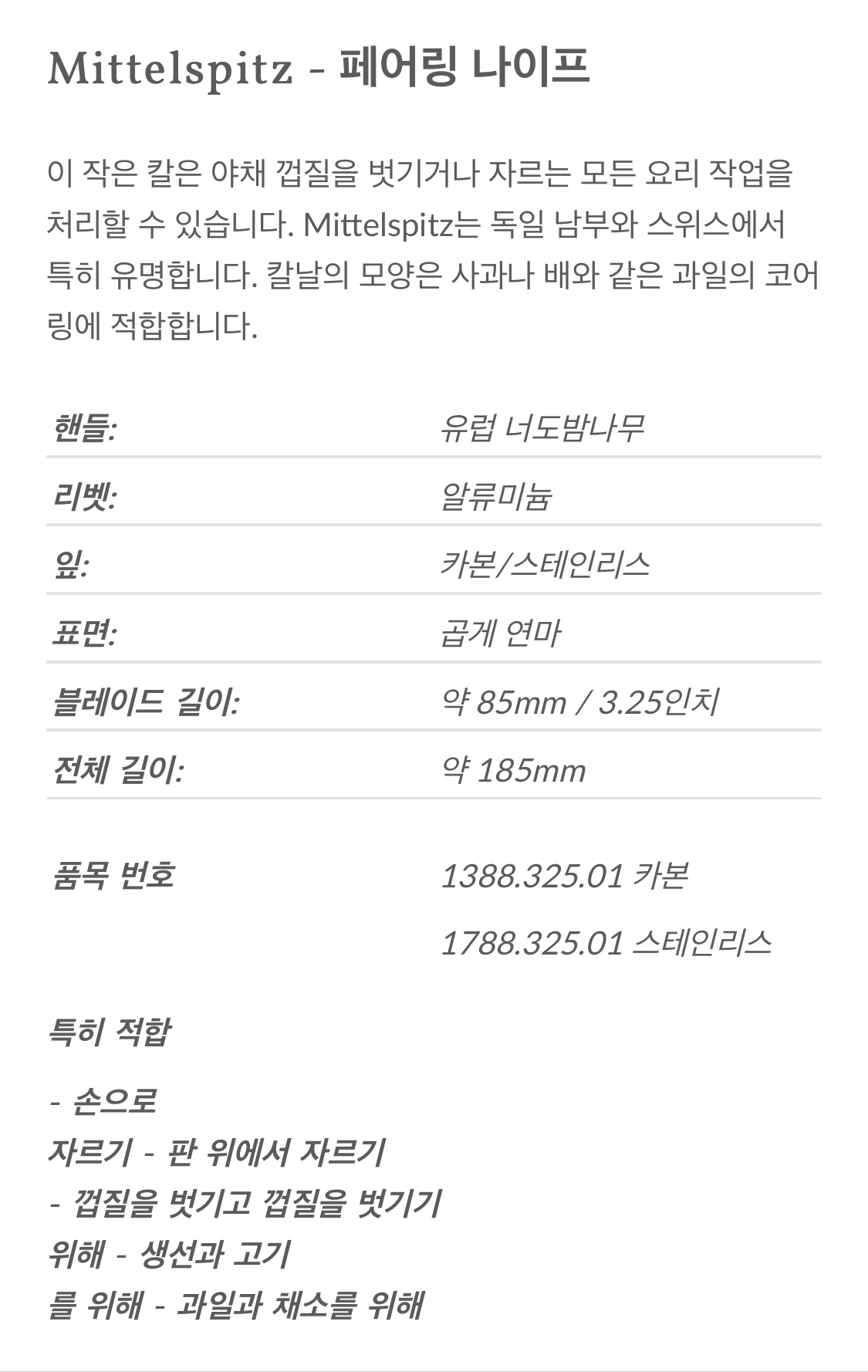 모델넘버 핸들 종류까지 상세히 설명되어 있다. 나의 과도(페어링 나이프) 상세 설명 ㅋ