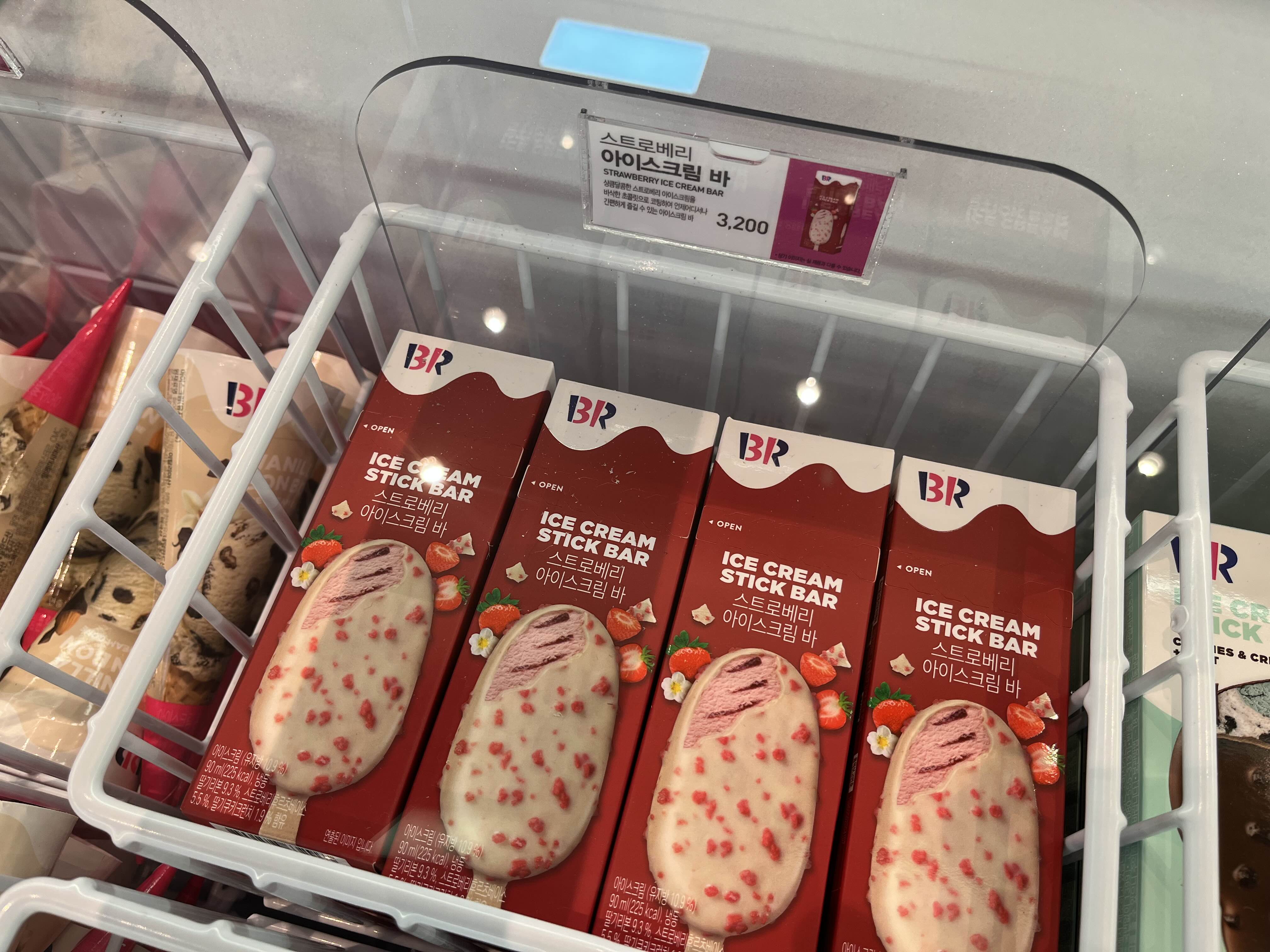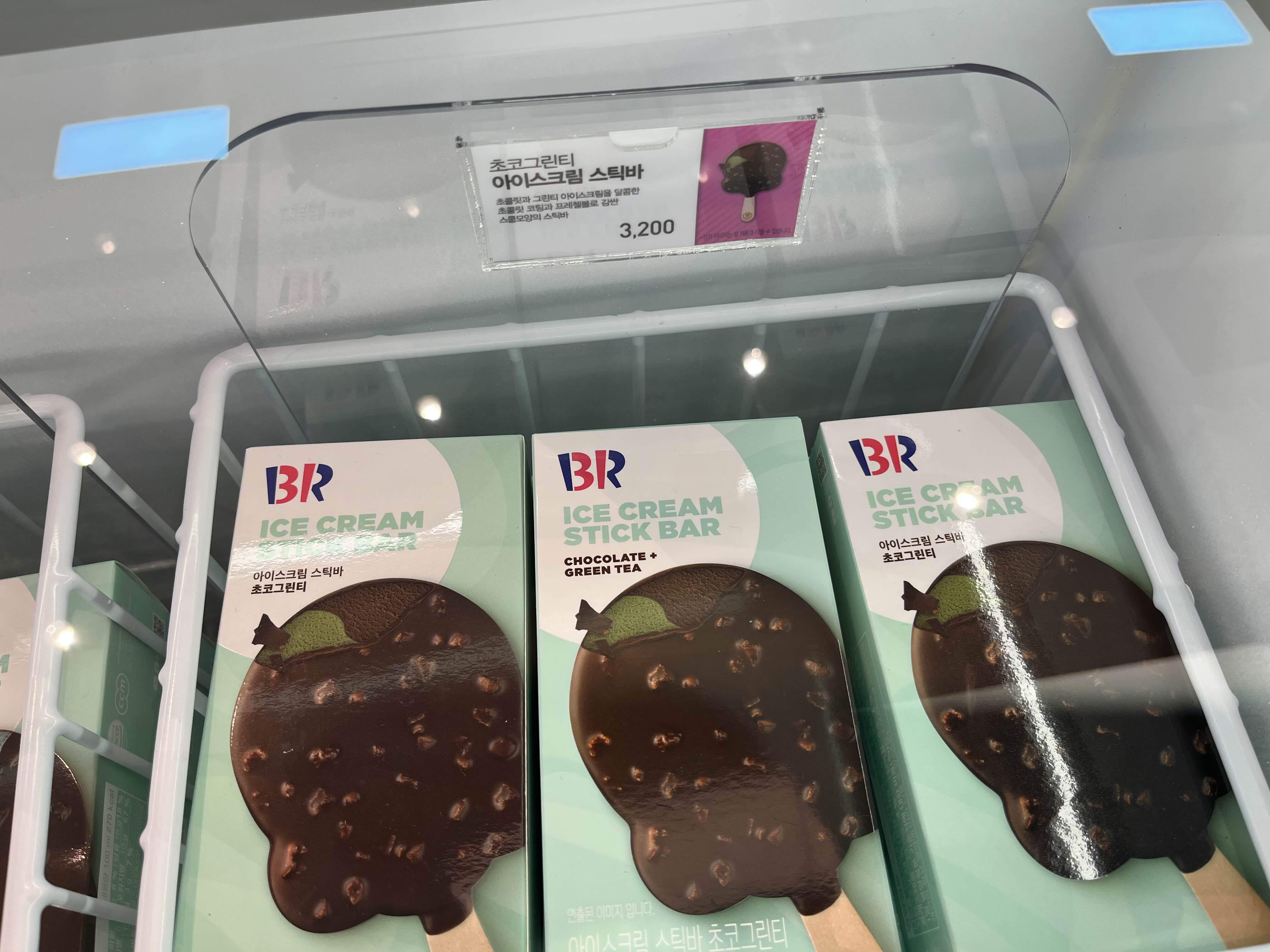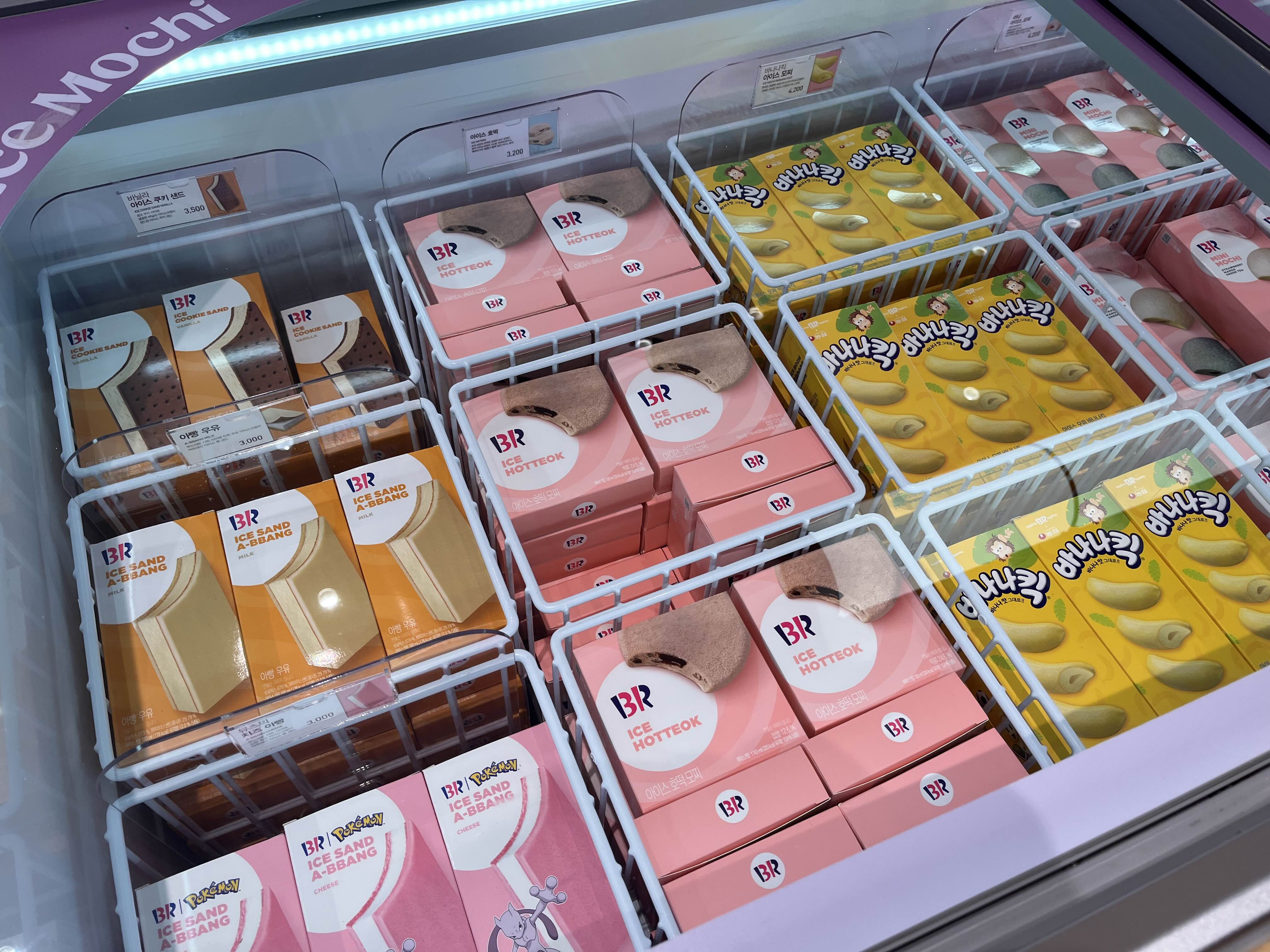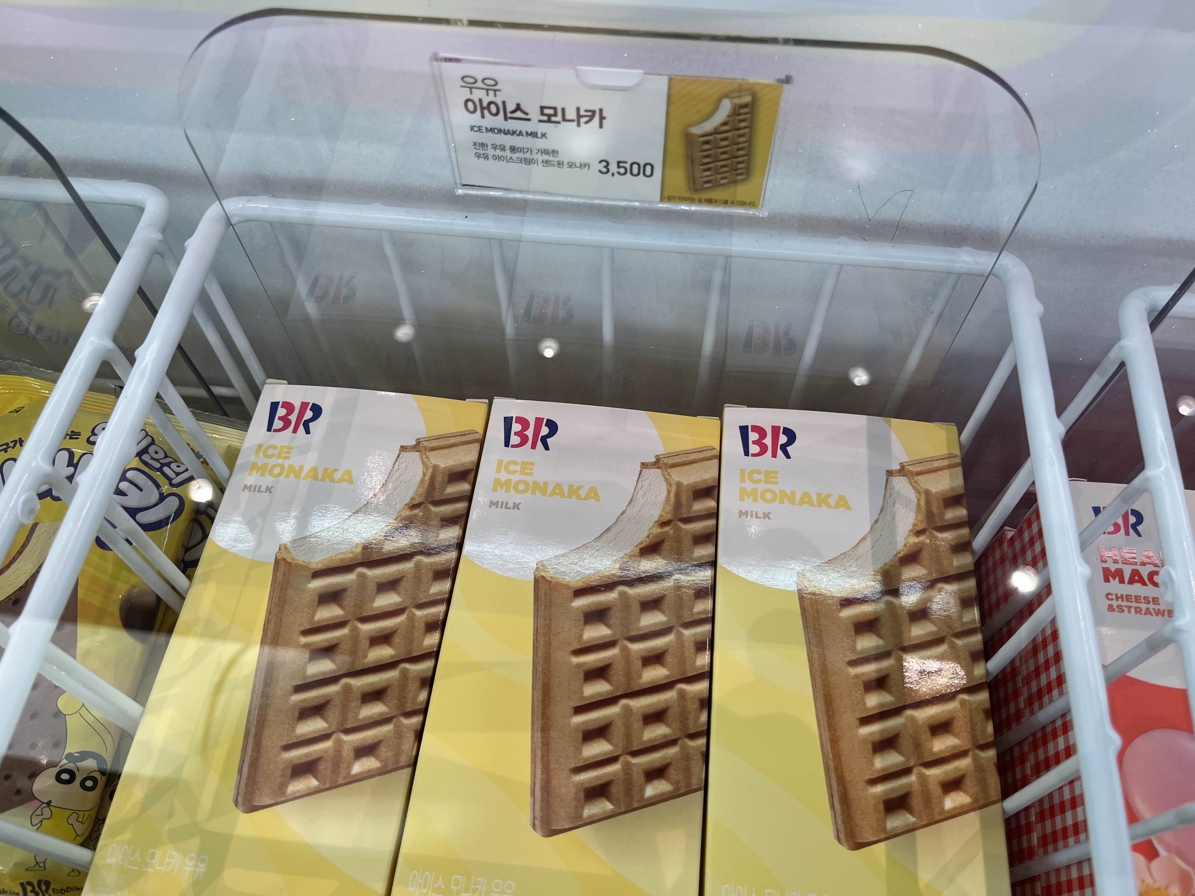 노랑 냉장고 위 칸에 있는 미니 아이스케이크 이곳에는 배스킨라빈스 플로우 에서만 구할 수 있는 아이스크림이 있다고 한다!