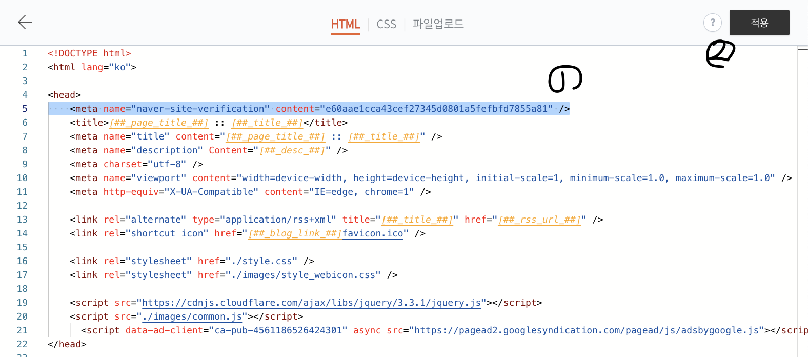 검정색으로 표시한 Head / Head 사이에 넣어주면 끝!! 위그림의 우측 부분에 첫줄에 넣어주었다. 원래 5번은 없던내용 이지만 붙여넣기 완료!!