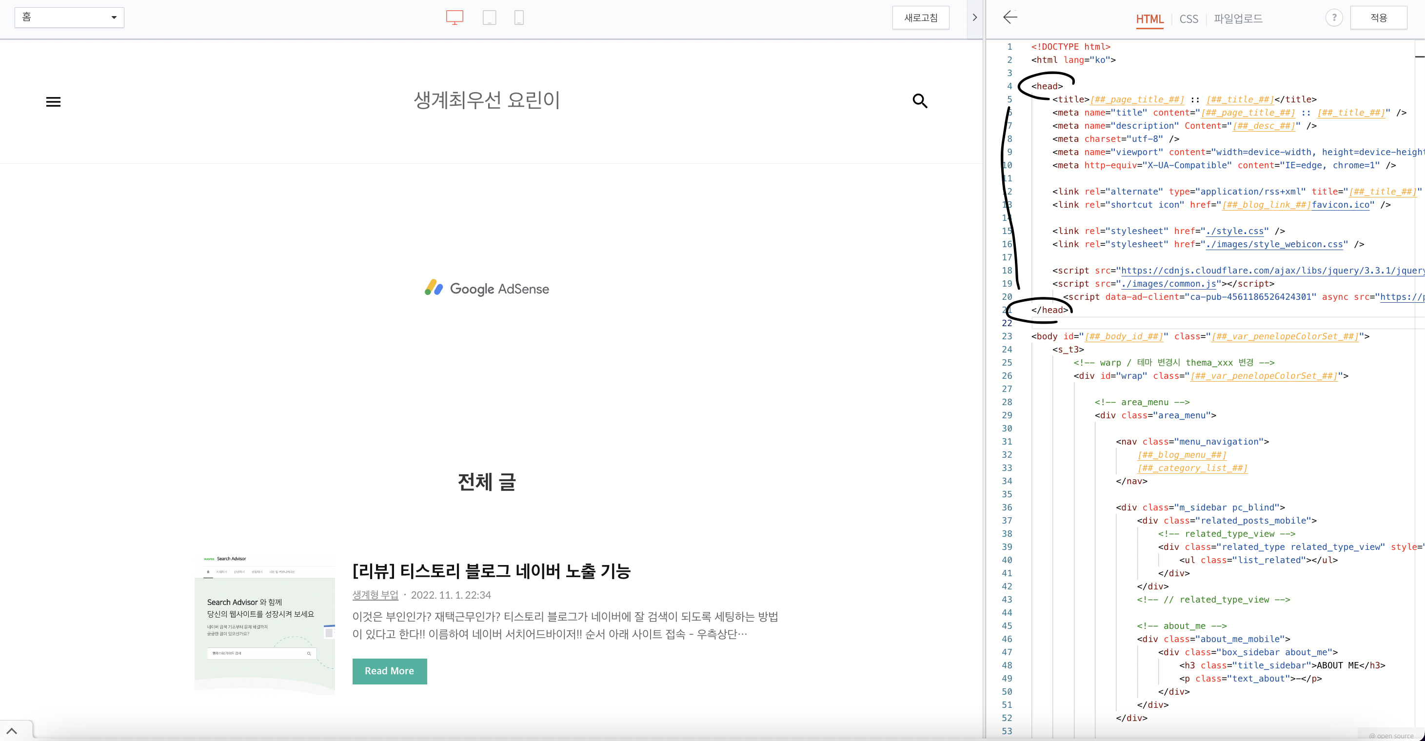 2. 티스토리에 넣고 - 스킨편집에서 HTML편집