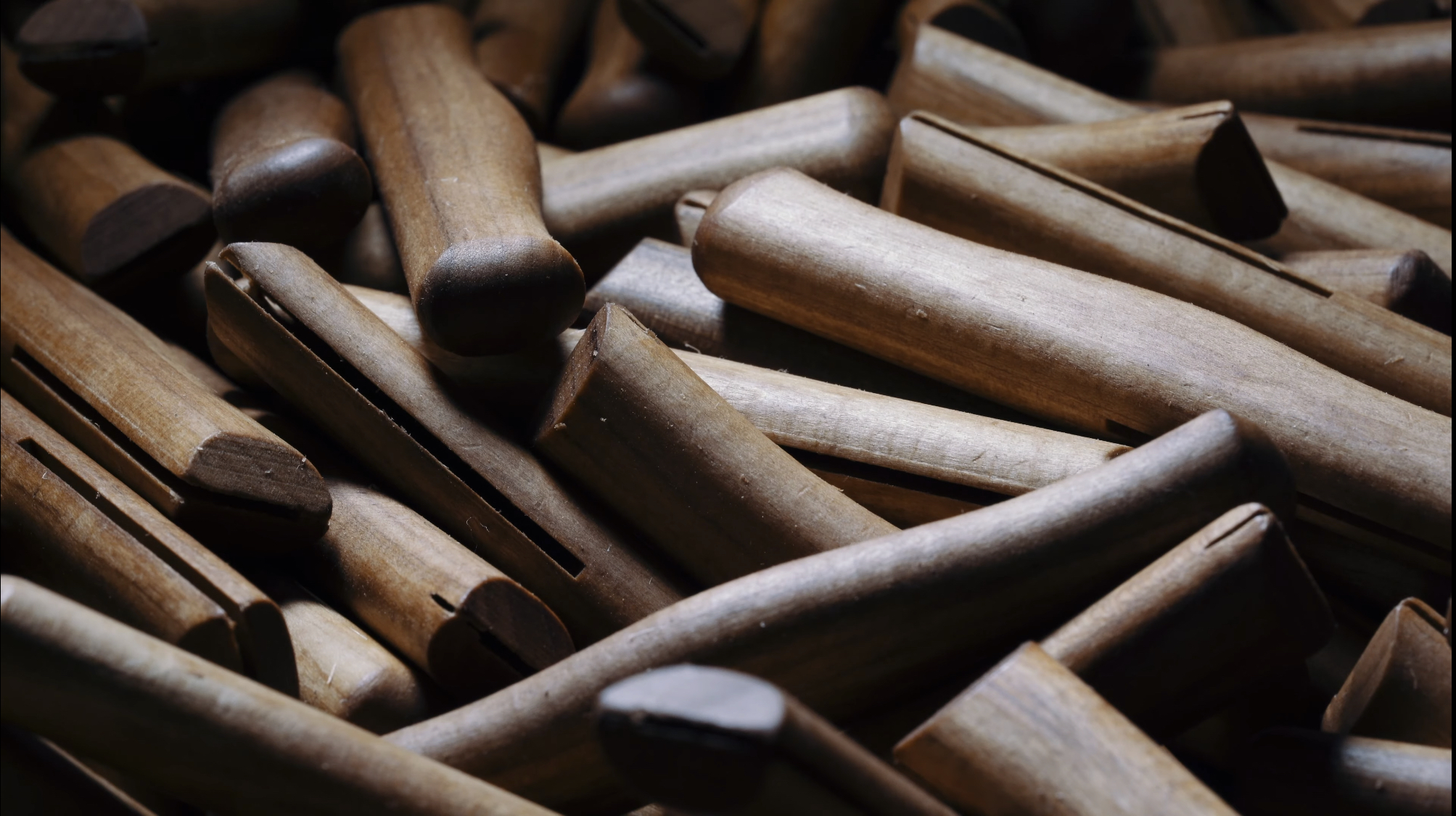 호두나무호두 손잡이의 경우 뿌리 또는 뿌리 근처의 줄기에서 조각을 가공합니다. 목재는 바덴과 프랑스에서 옵니다.