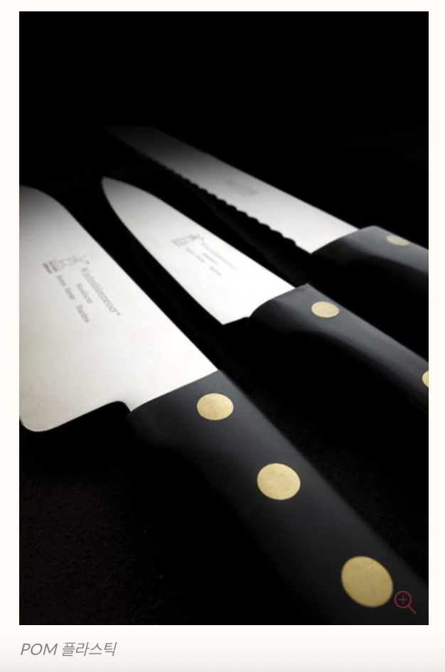 높은 안정성과 치수안정성, 부드러운 그립감으로 칼자루 소재로 매우 적합합니다. -40°C ~ +175°C의 온도에 강합니다. 따라서 냉장실이나 뜨거운 스토브에 두는 것은 큰 해를 끼치 지 않습니다.
