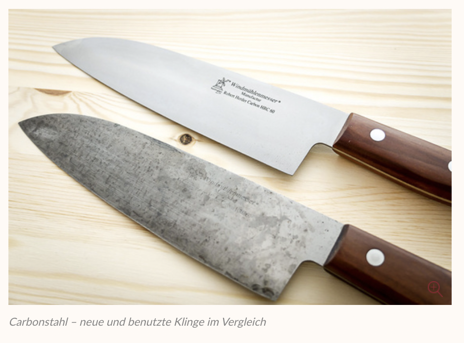 새칼과 중고칼의 비교. (동일모델) 제품의 나이프 로고를 자세히 보면 ROSTFREI (독일어 : 스테인레스) 가 있고 / 없고의 차이로 탄소강 제품인지 아닌지 알 수 있다.