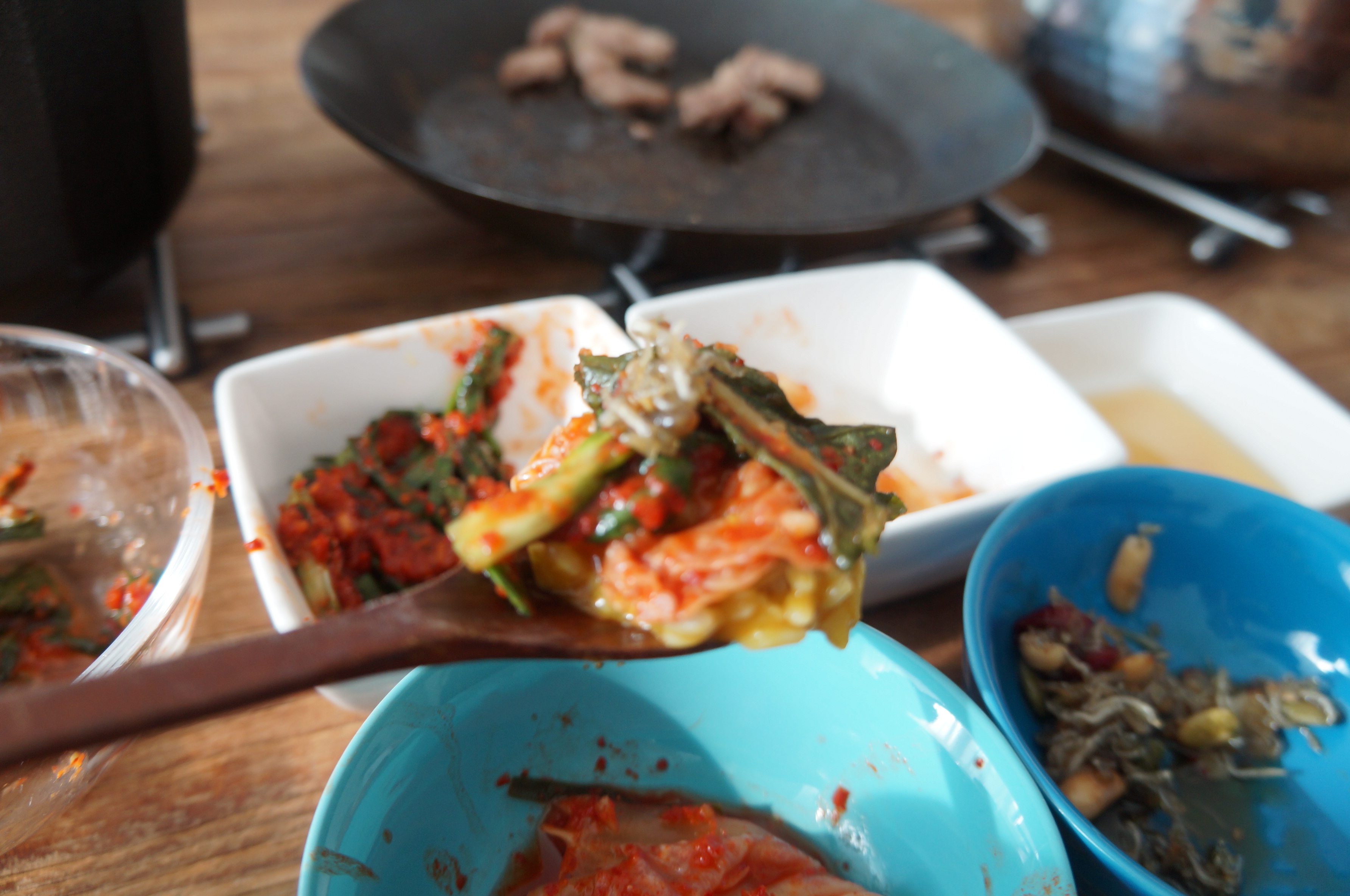 오늘의 한상 항공샷 옹기종기 모여있는 솥과 철팬 그리고 김치4종