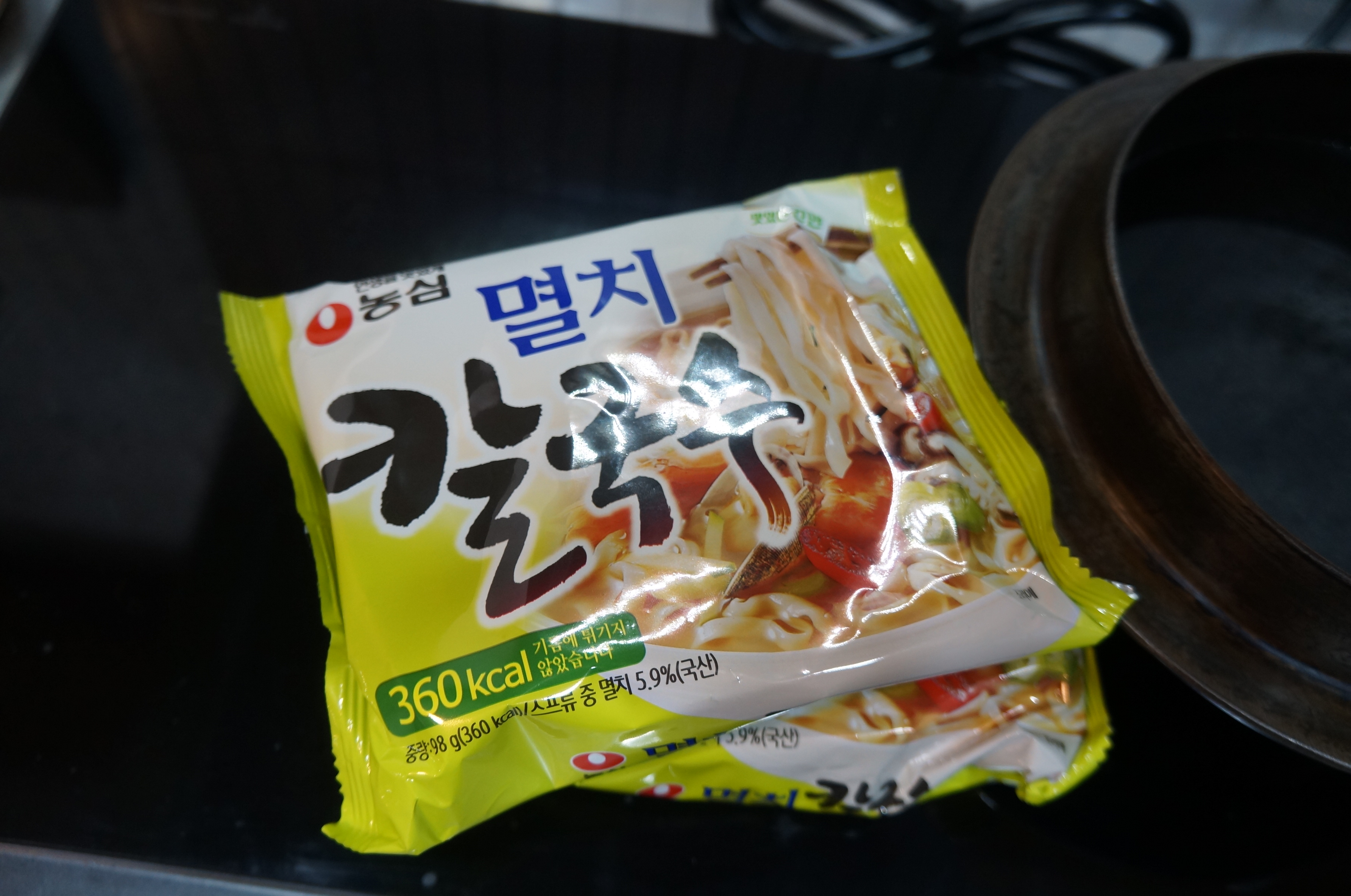 준비물 : 멸치 칼국수, 무쇠솥, 그리고 우삼겹 + 알배추 !! 가장중요할수도 있다 ㅎㅎ농심 멸치 칼국수 5개입