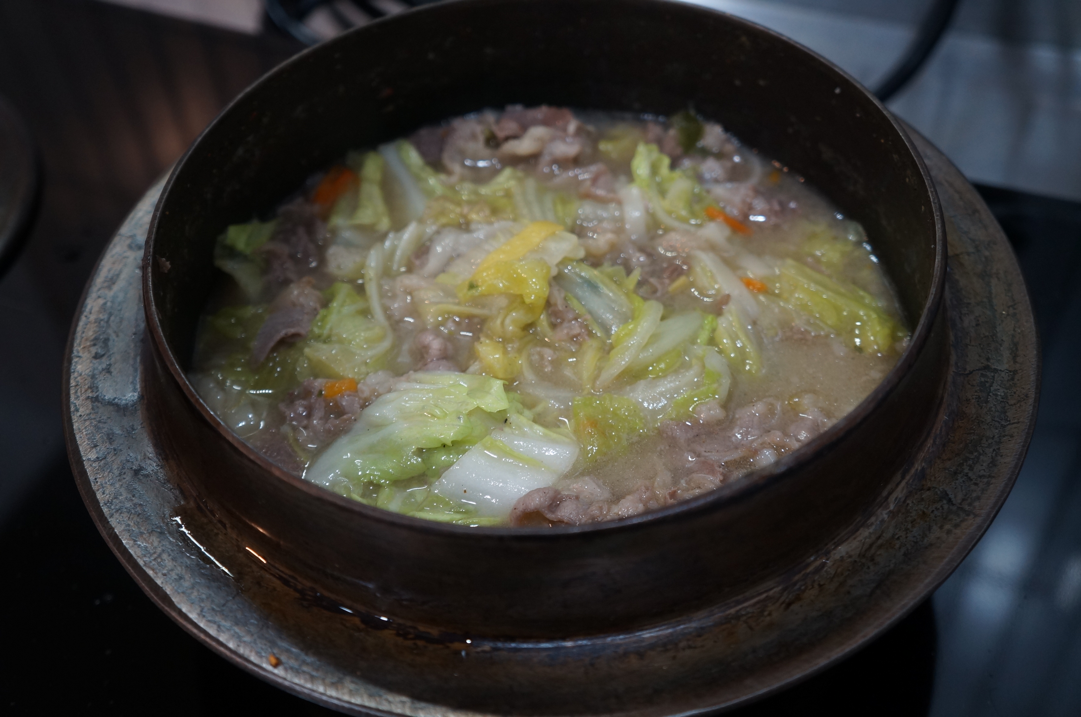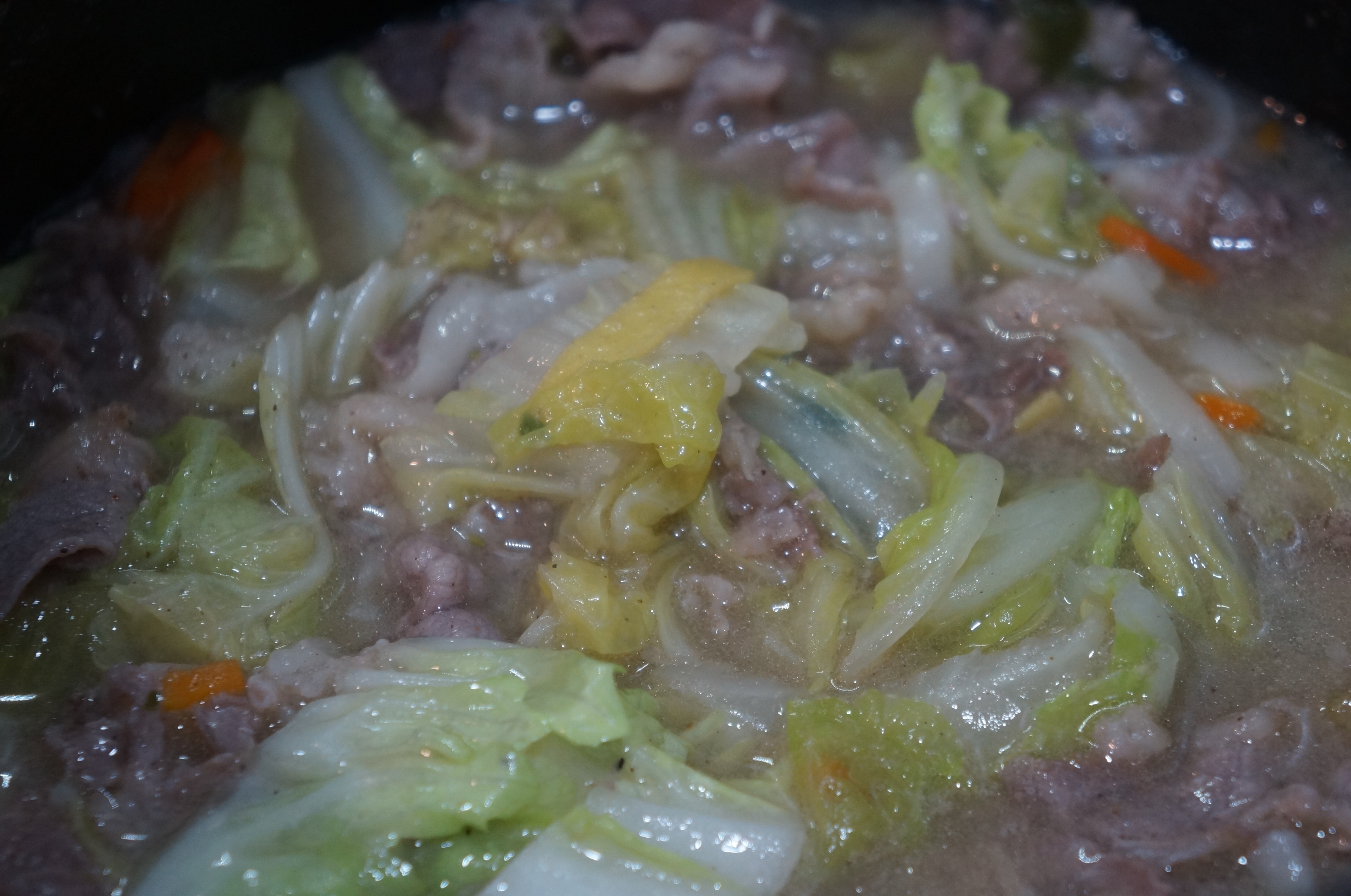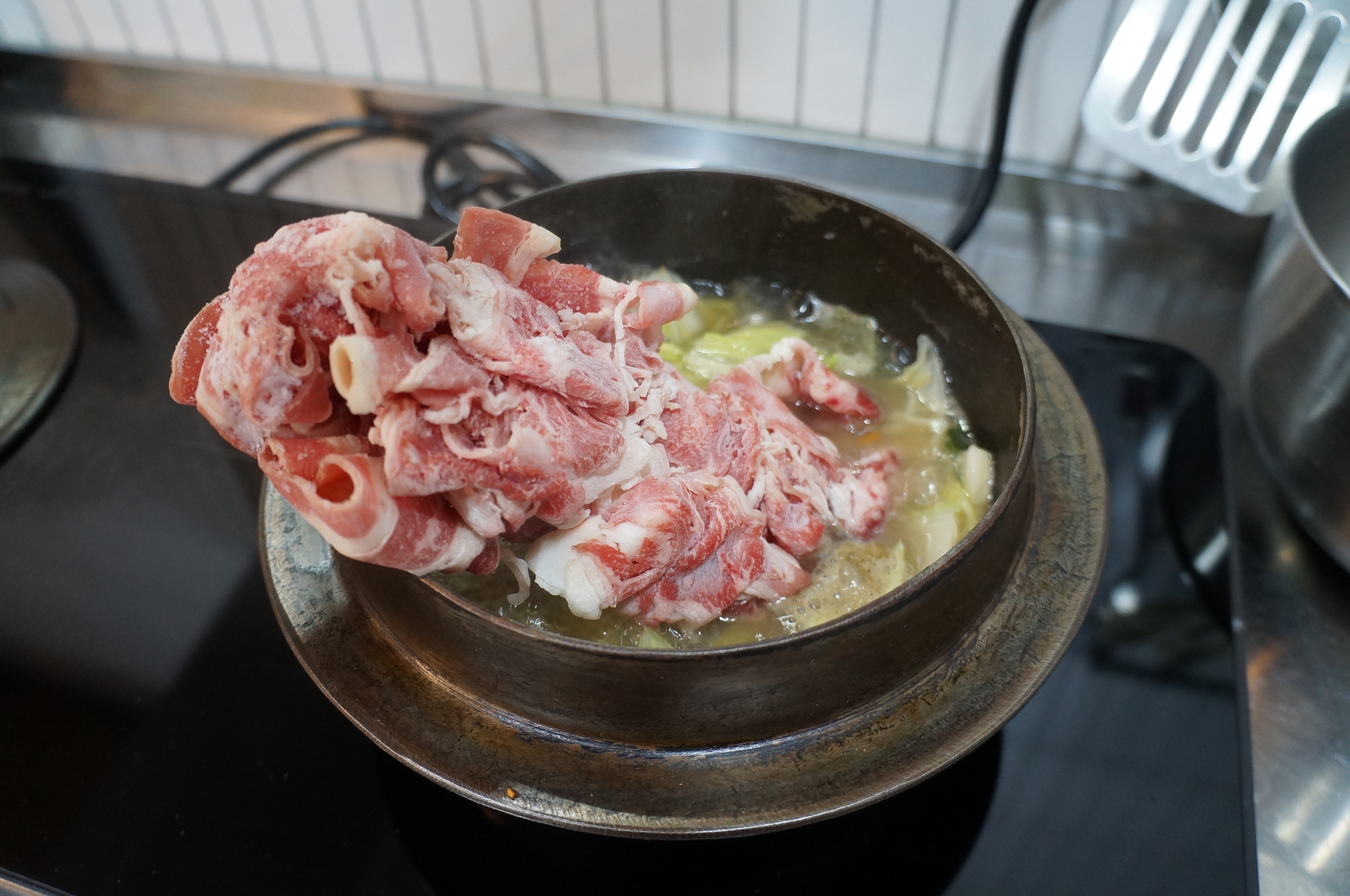 알배추 그리고 적당량의 우삼겹을 때려 넣어주고 / 양배추가 거의 익어서 부드러워지는 시점에 고기를 넣는다!