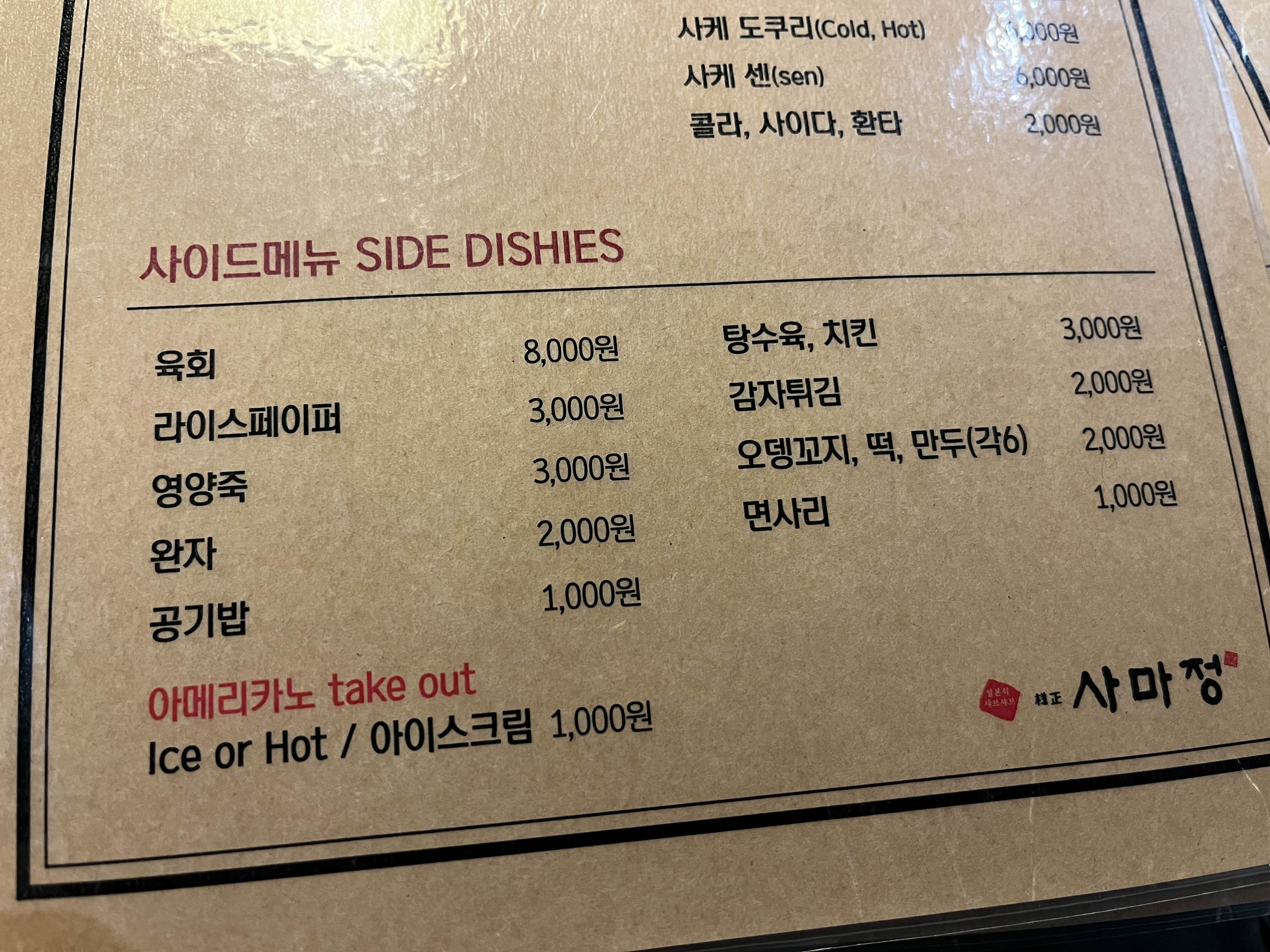 사마정 메뉴 사이드메뉴