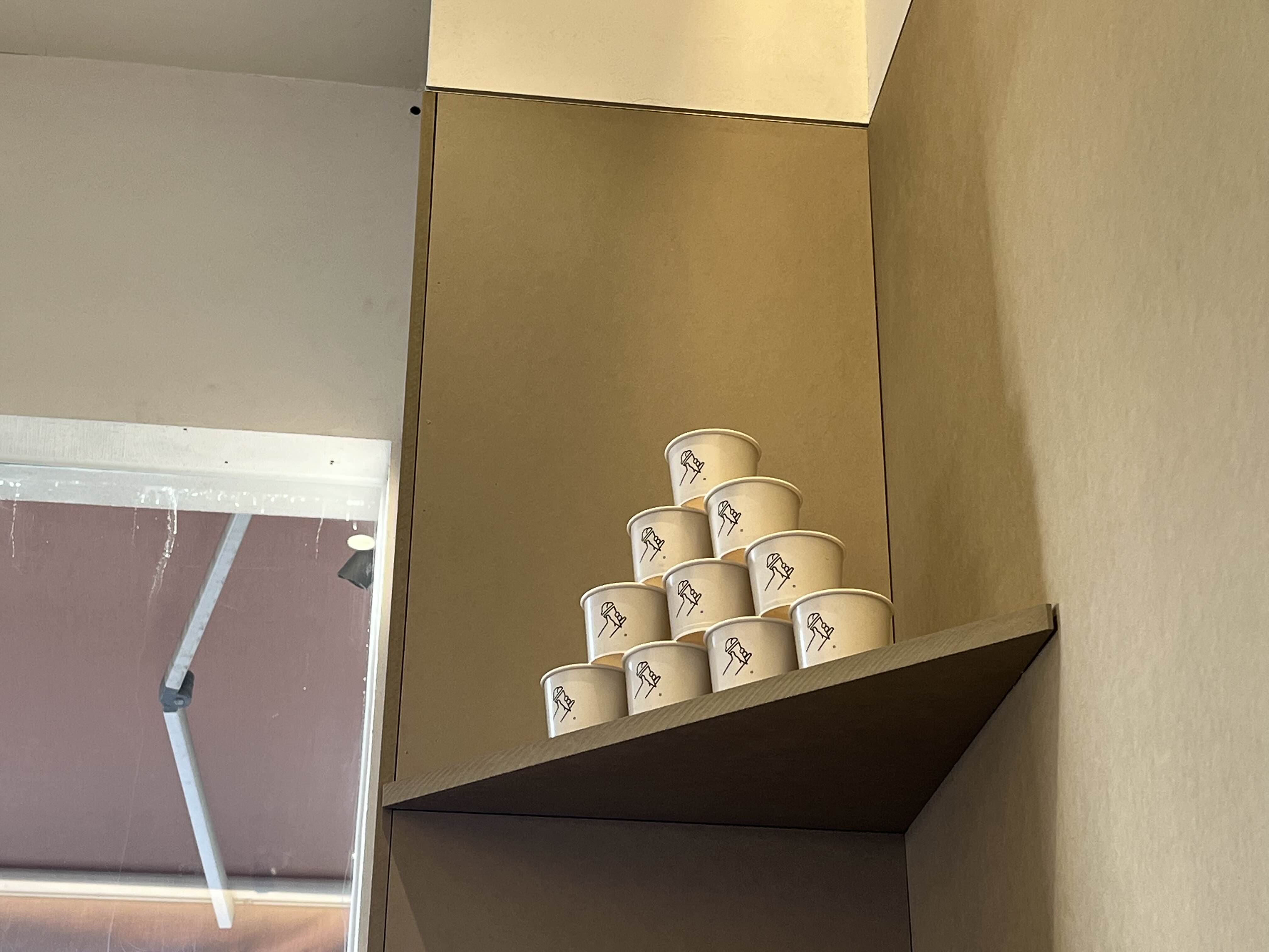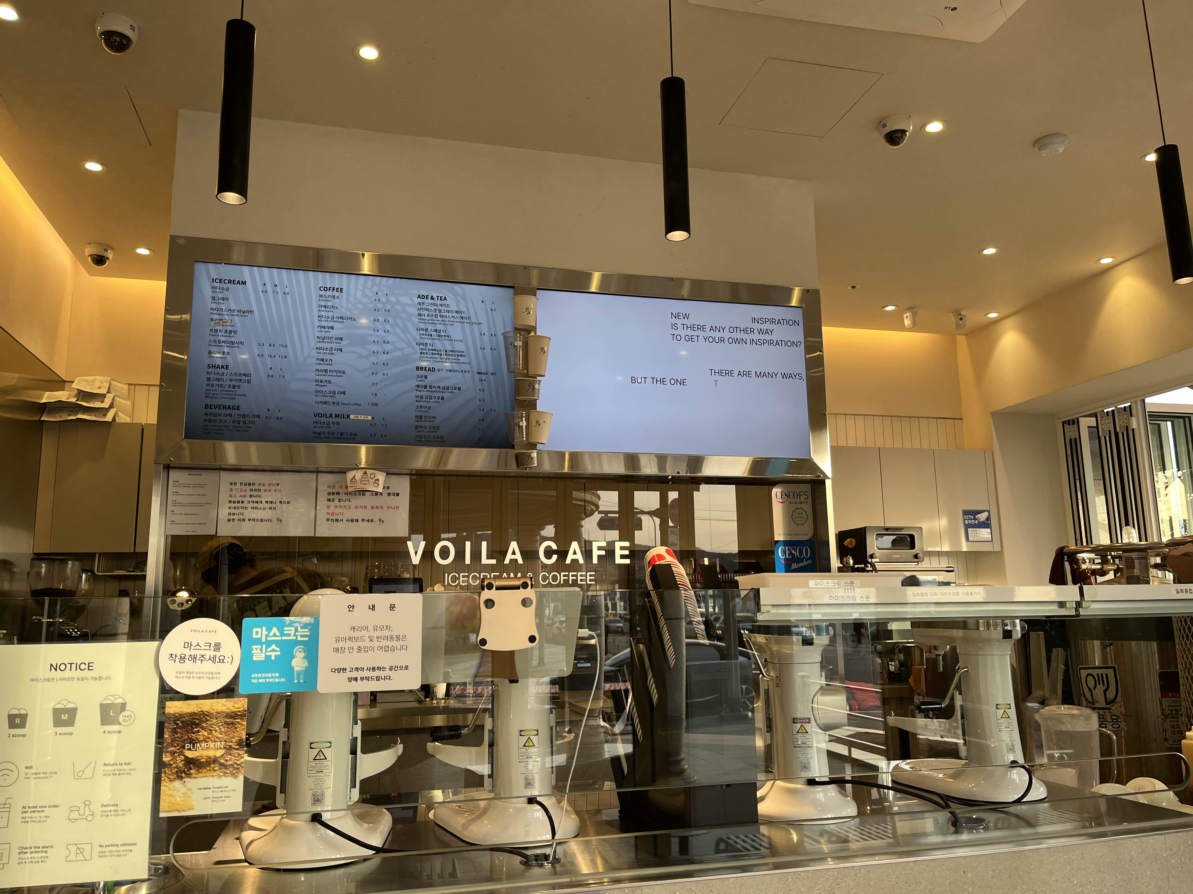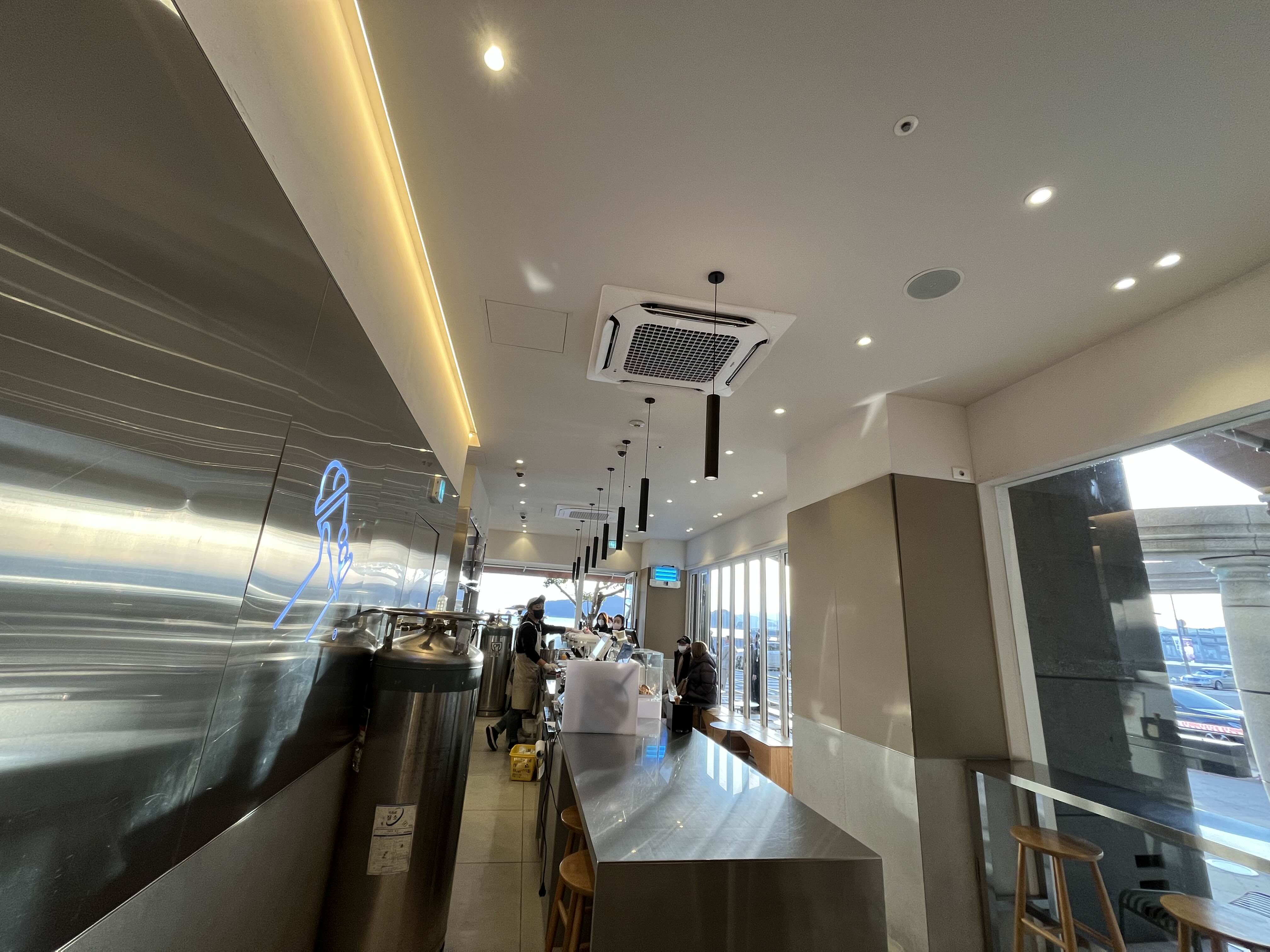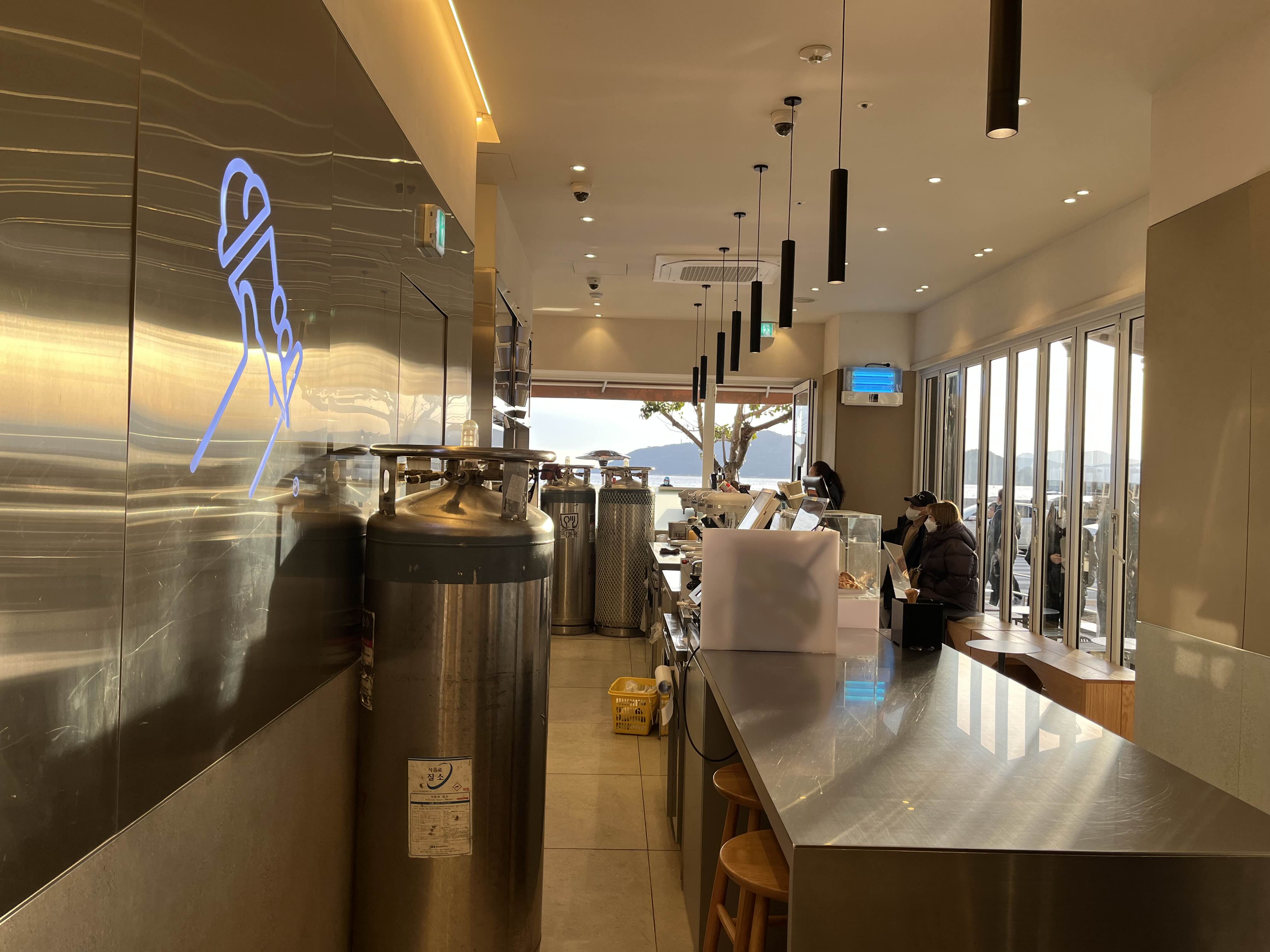 내부에는 테이블은 창가와 안쪽에 하나씩 있고 입구테라스에도 있다. 질소 탱크가 보인다