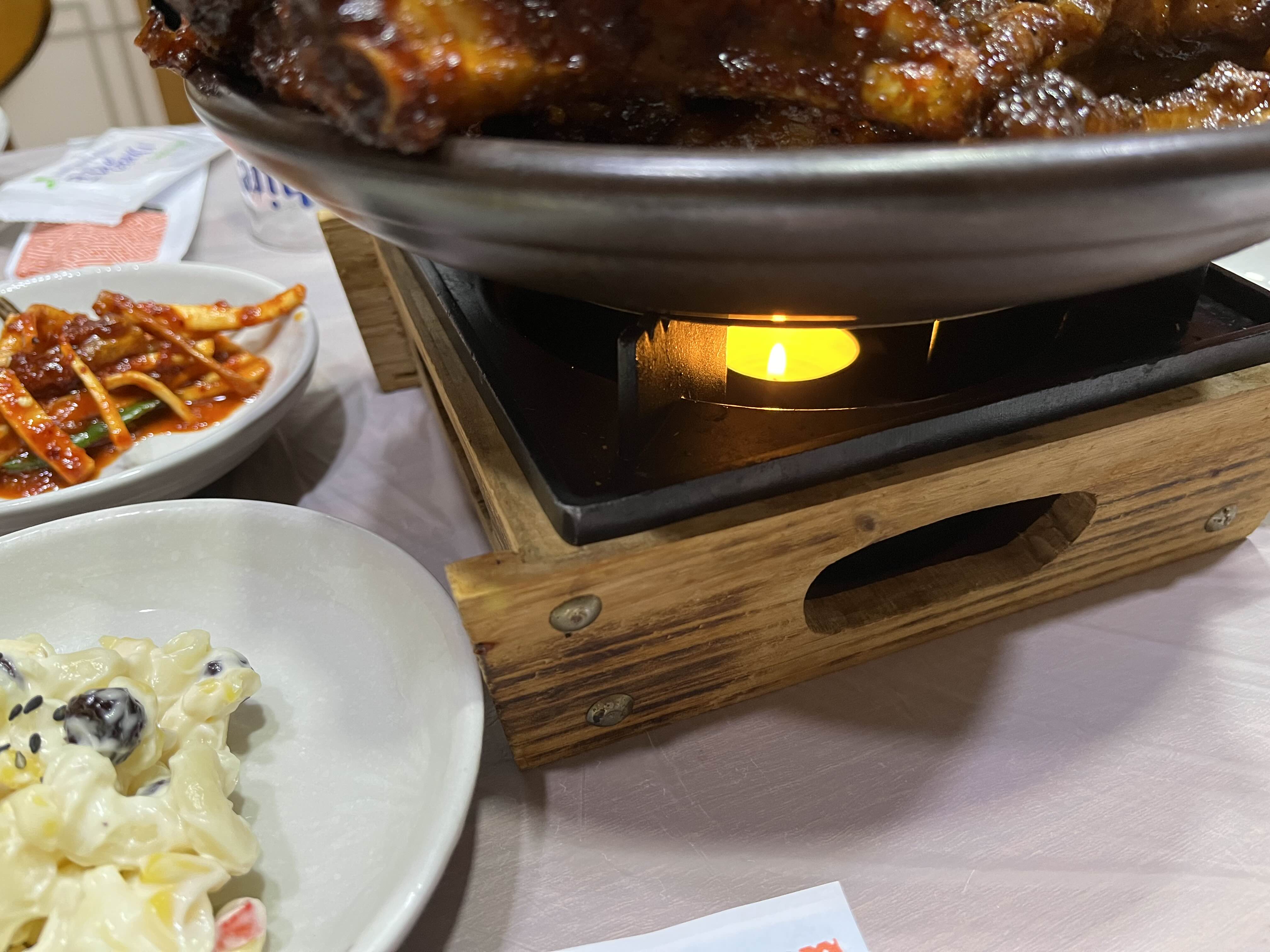 한상차림 우선 쪽갈비 부터 나오면 이렇게 온접시에ㅜ나오고 아래엔 초를 통해 계속 따뜻하게 먹을 수 있다.