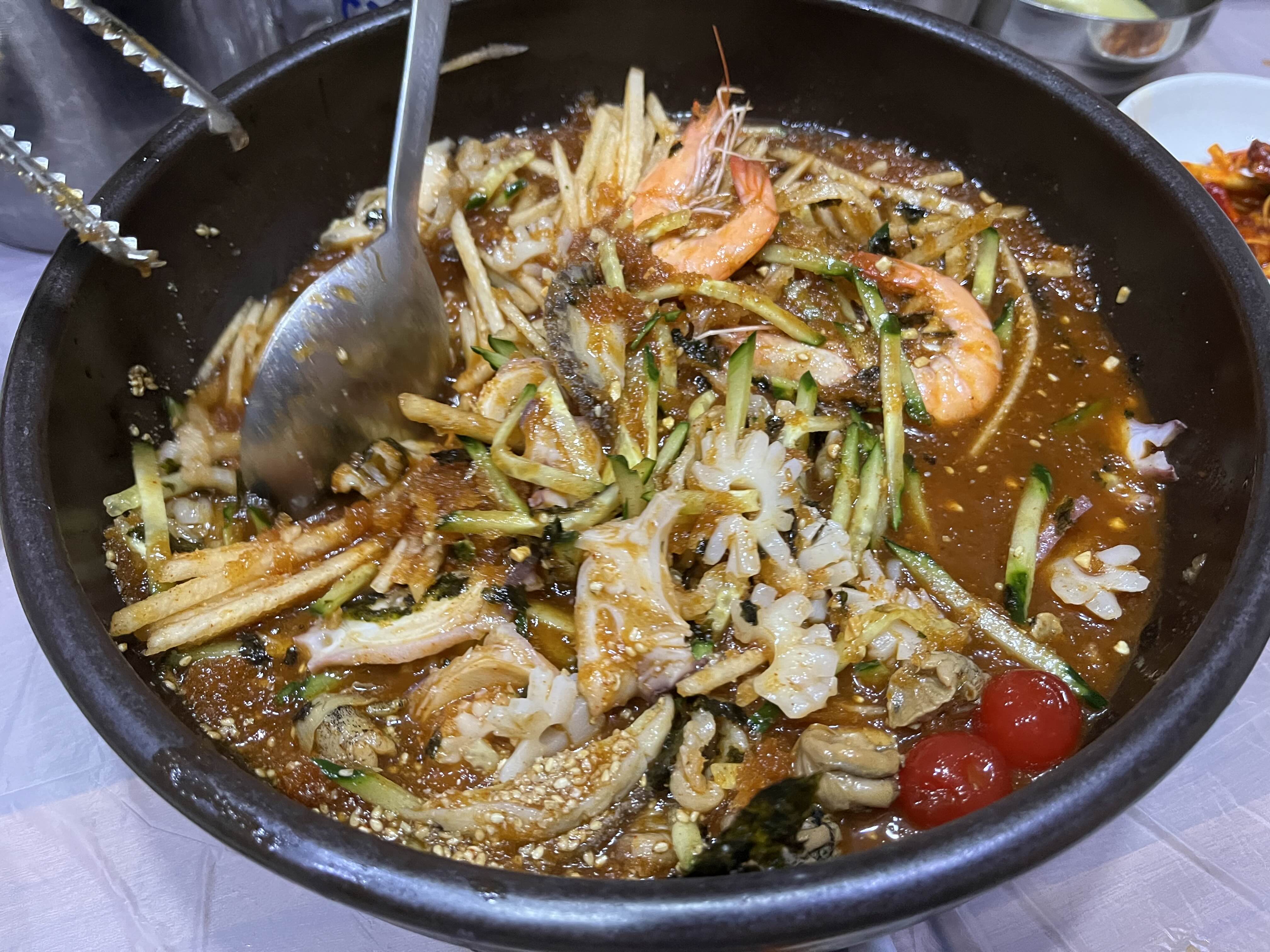 이렇게 쓱쓱 바벼서 한 그릇씩 해물가 시원한 해물비빔 물회