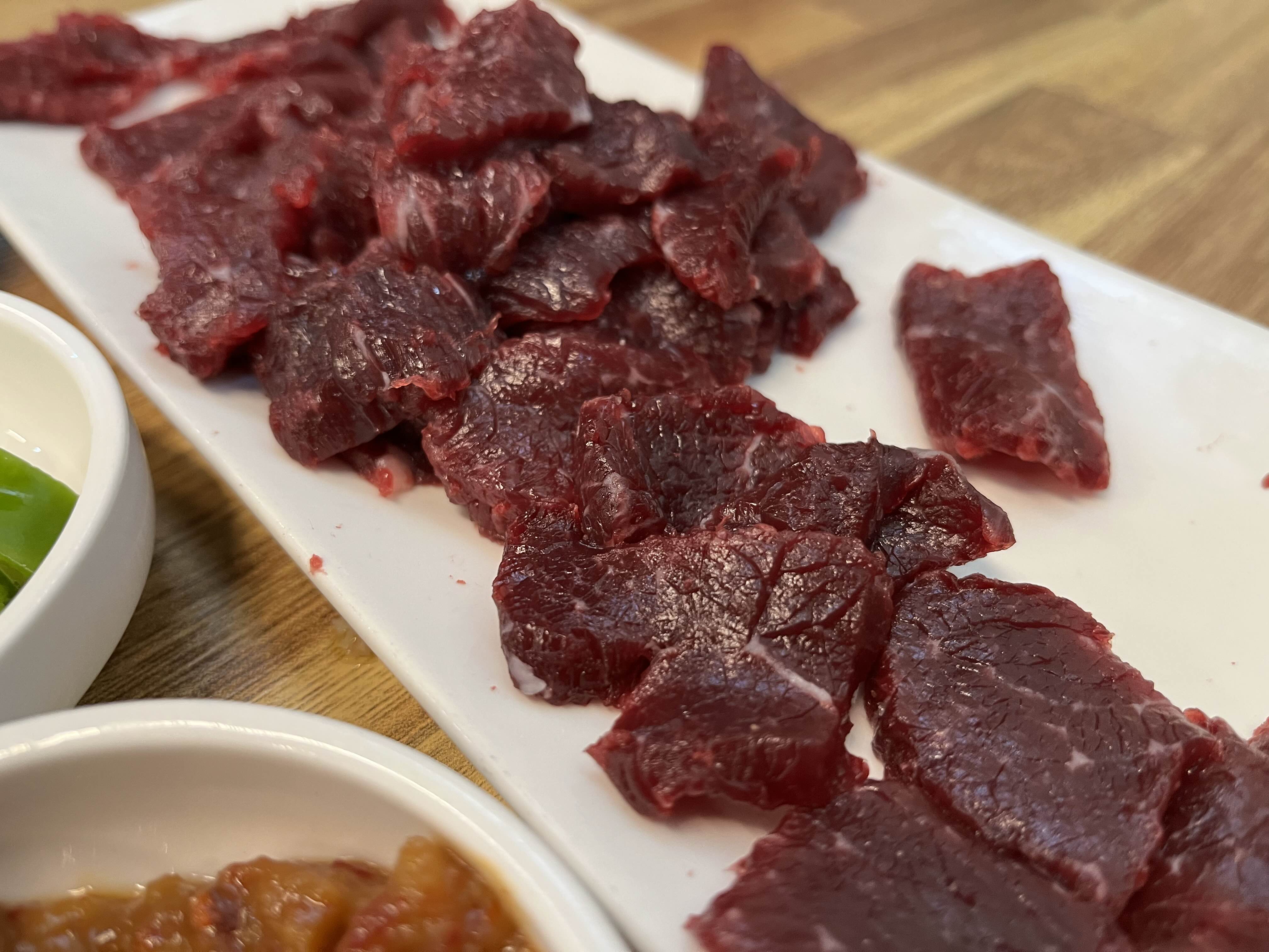 뭉티기 한접시 생고기가득 빛깔이 좋다 덩치큰 남자 3명이서 먹기엔 조금 부족할 수 있다!