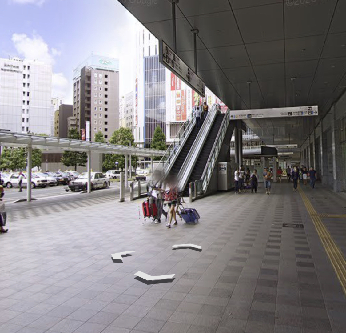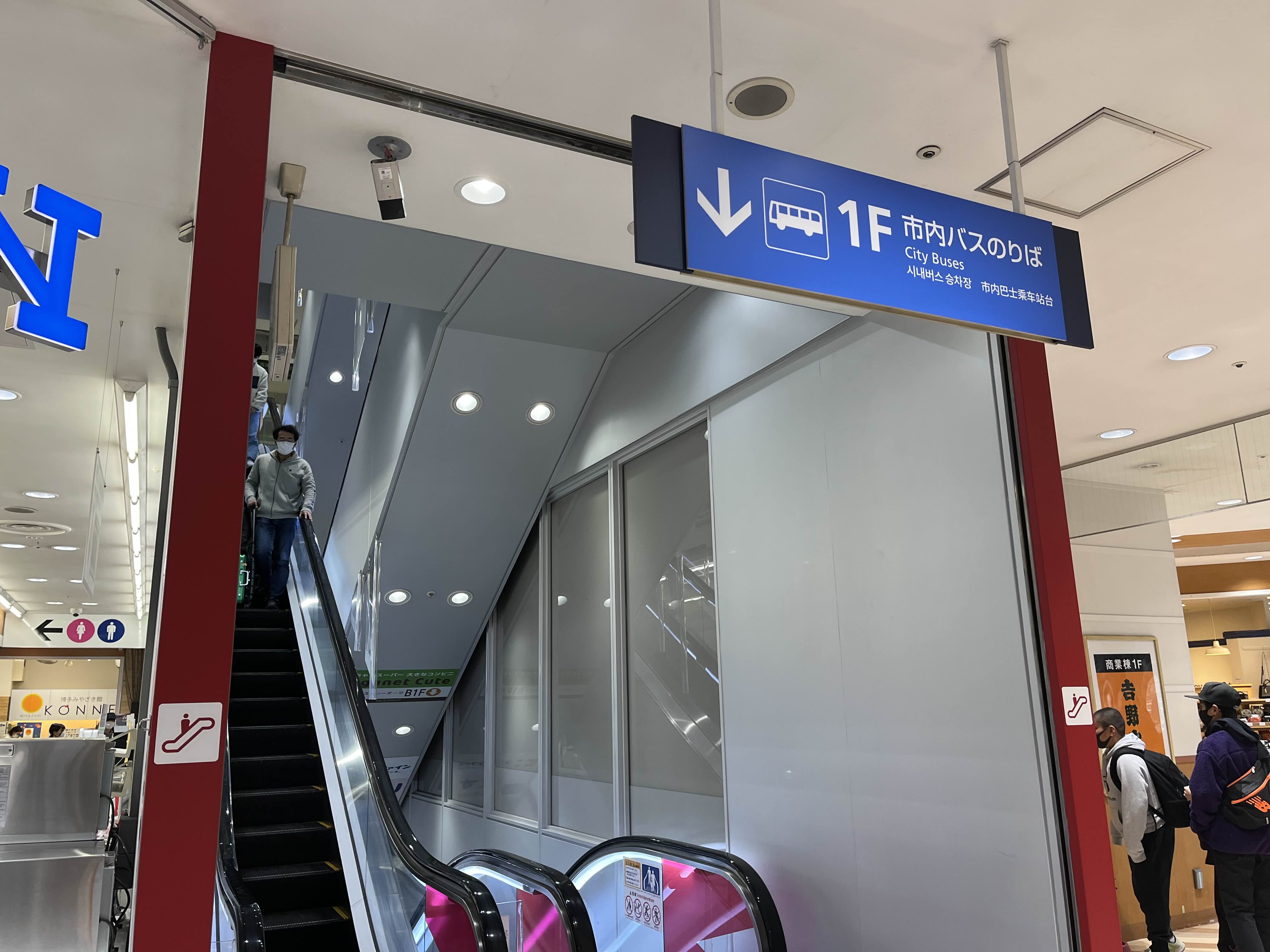 하카타역 입구 하카타역 건물 밖 로비로 나왔다면 아래 보이는 에스컬레이터를 이용해서 올라가자.(2층 으로 가지않고 그냥 1층으로 하카타 버스터미널로 걸어가도 된다)