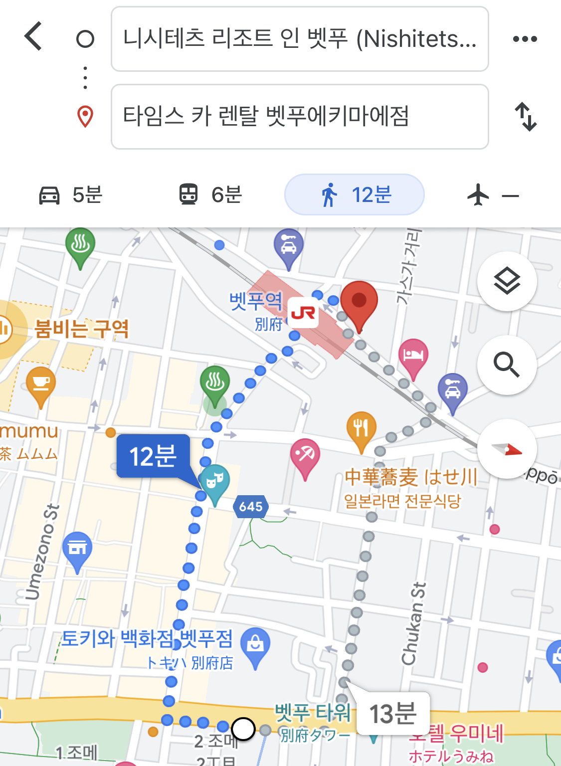 니시테츠 호텔에 내려서 벳부역으로 가보자 어차피 벳부역으로 가야지만 스기노이를 올라가는 셔틀을 탈수가 있다.! 벳부역 후문으로 가서 타임스 카 렌탈점 까지 가야한다! 도보 약 12분