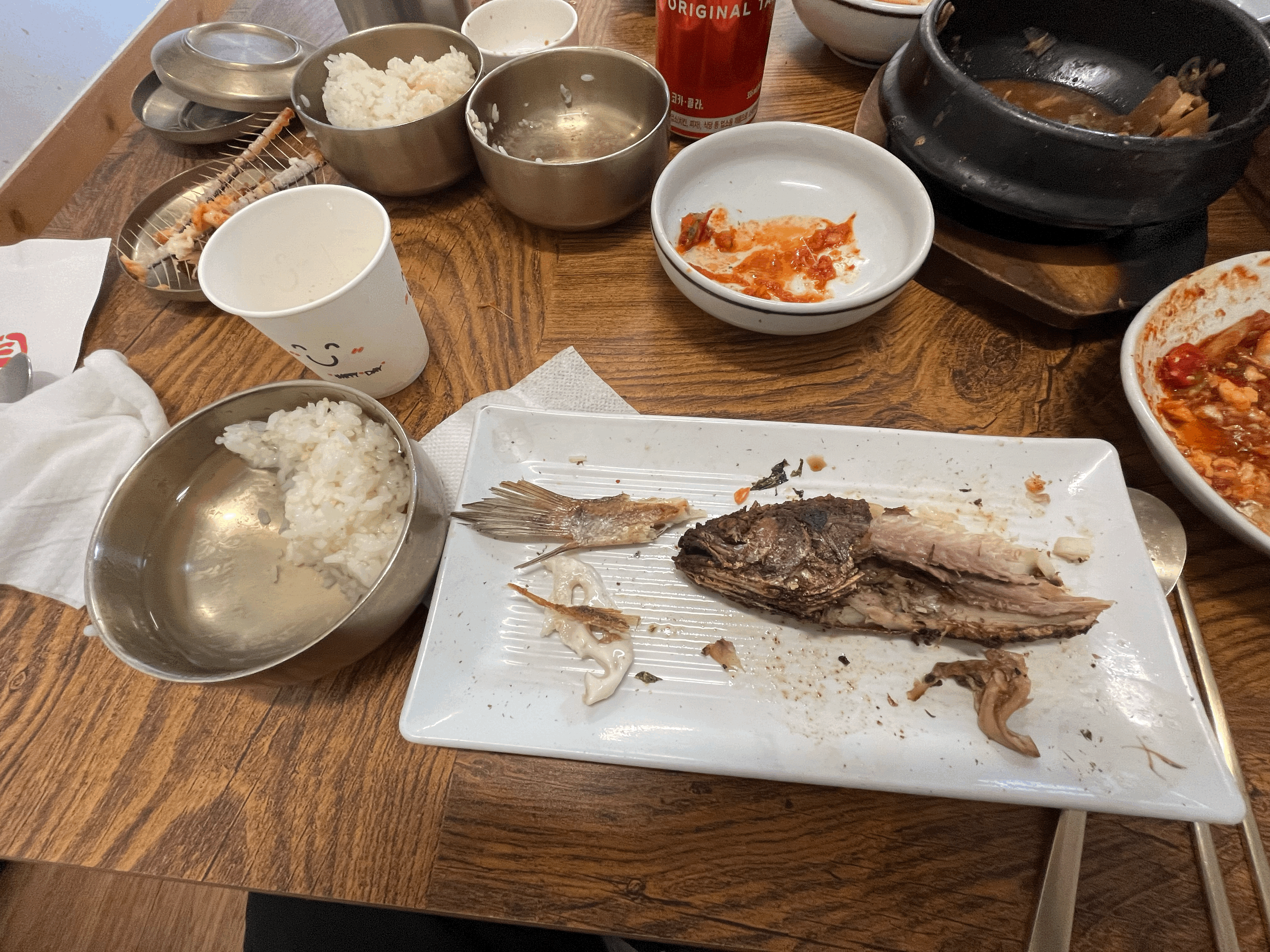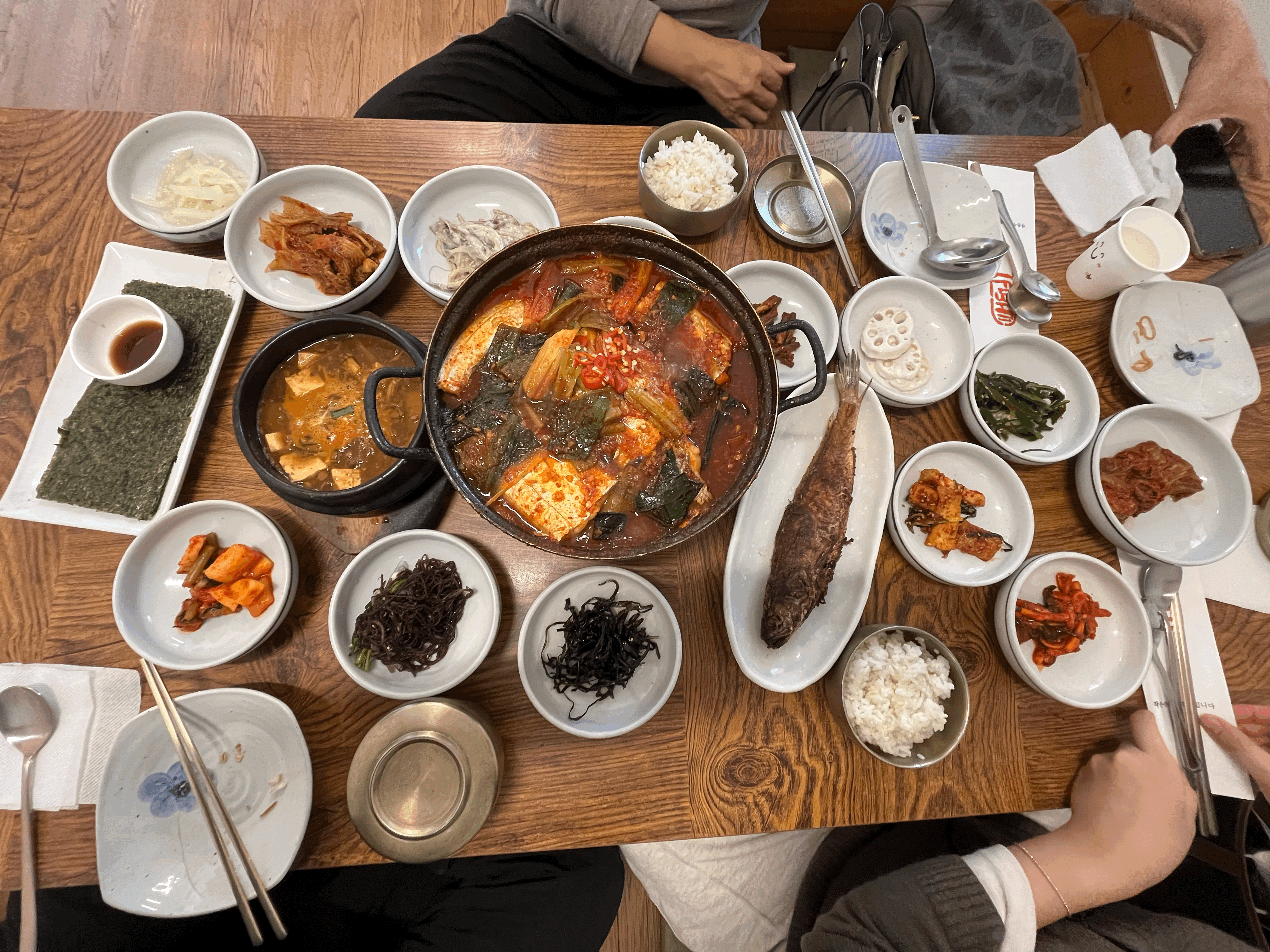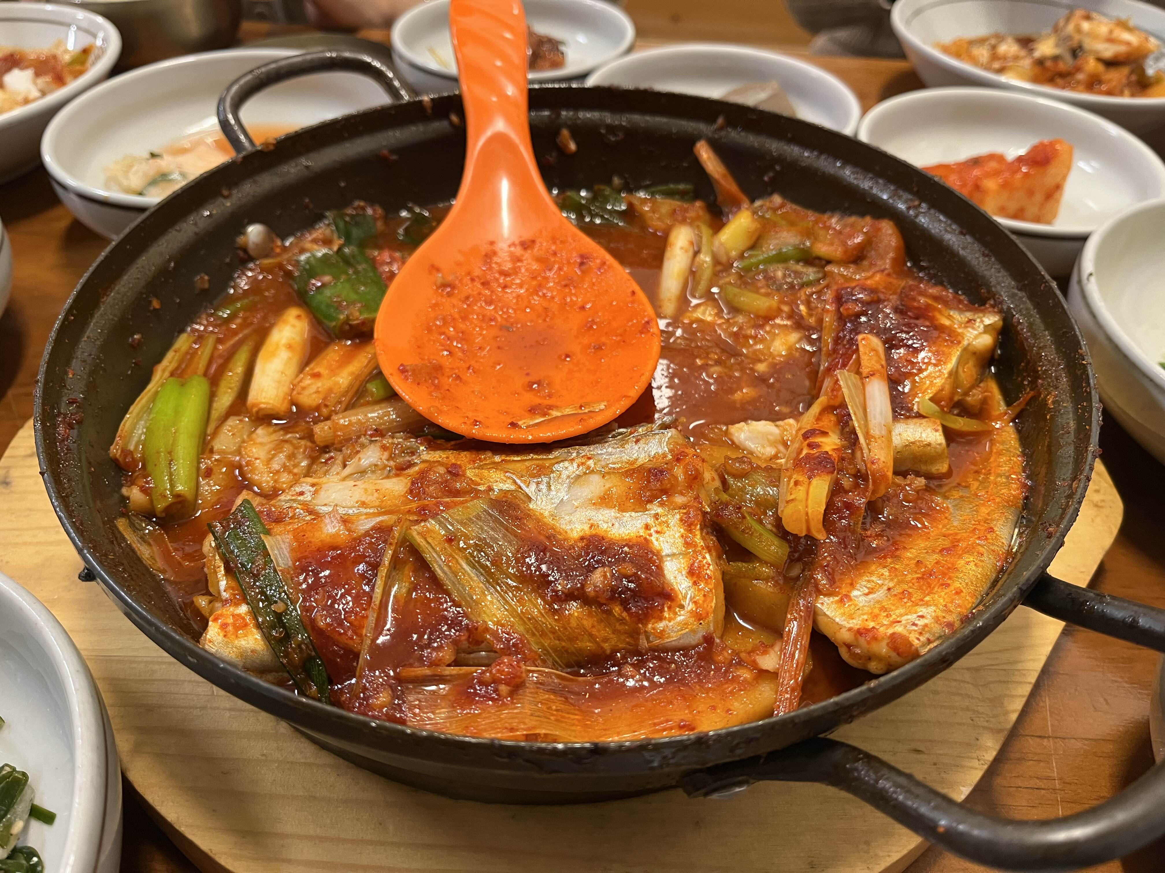 대기를 하면서 식당주위를 돌고나니 배가 고파질 즈음에 우리의 순서가 왔다. 식후에 봐도 좋고 식전에 봐도 좋을 듯하다. 예약을 하지 않아서 순서대로 입장하였고, 주문은 미리 되어 있어서 자리에 앉고 밑반찬이 나오고 난 뒤 바로 갈치찜이 나왔다. 갈치찜은 화로를 통해 계속 따뜻하게 먹을 수 있었다. 밑반찬은 전은 추가로 주문을 해야 하고, 특히 구운 김이 기가 막혔다. 구운조기(추가금액)도 아주 잘 익었다. 특히 밥이 무제한에 가까운데(5공기/1인당) 사실 조금 아쉬웠다. 솥밥이나, 누룽지를 해 먹을 수 있다면 더 좋았을 텐데.. 어디든 밥이 아쉽다. 다 먹어갈 때가 되면 후식으로 팥죽을 주시는데, 정말 맛난다.! 혹시나 빨리 가는 분들은 미리 요청을 하면 내어주신다 ^^