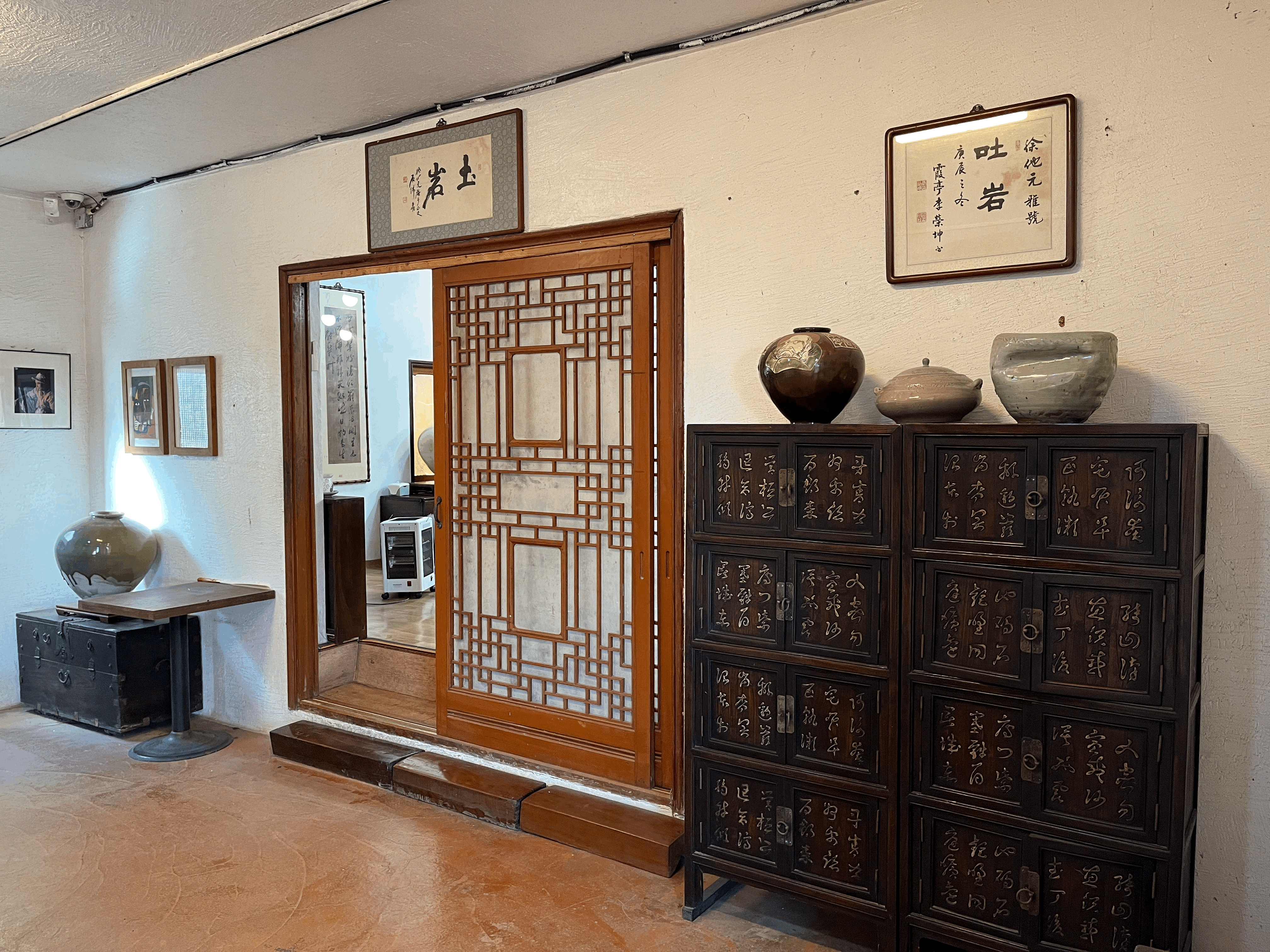 식당입구쪽에서 위로 가는 돌계단이 놓여있다 이곳으로 올라가면 옛날 기와집 입구 같은 나무로 된 문이 있고, 내부에는 테이블들이 가지런히 놓여있다. 입구에는 다양한 종류의 도자기와 오래된 물건 그리고 사진이 있는데, 아마도 토암선생님일 것이다. 나는 이곳에서 식사를 하지 않았지만 주차장에서 단체 인원을 보았는데, 상당한 인원이 머물렀다간 듯하다. 토암식당 단체석은 좌식으로 되어 있고, 좌석 주위로 도자기와 고가구들이 둘러져 있다. 밥맛이 절로 나는 배경이었다.