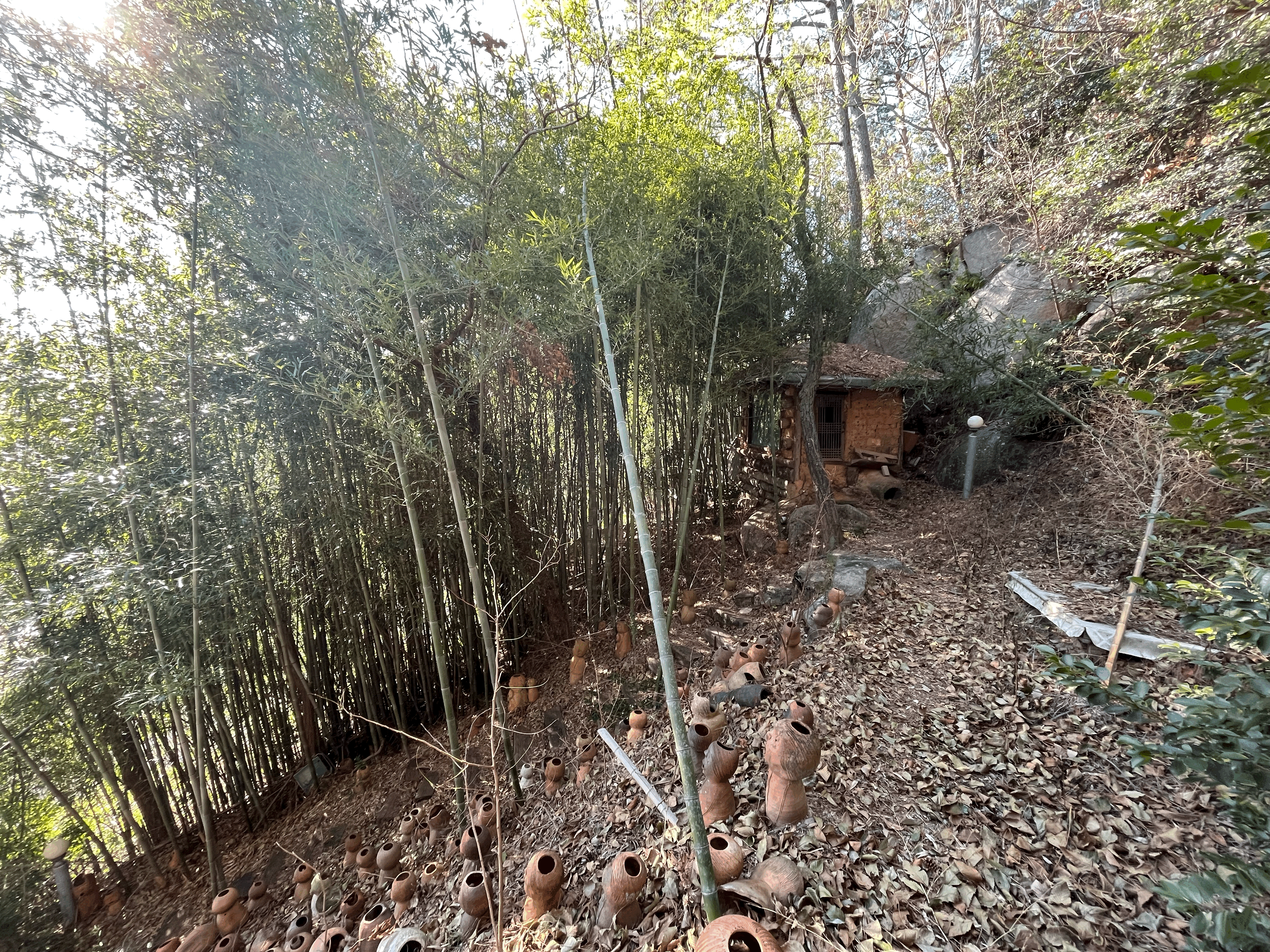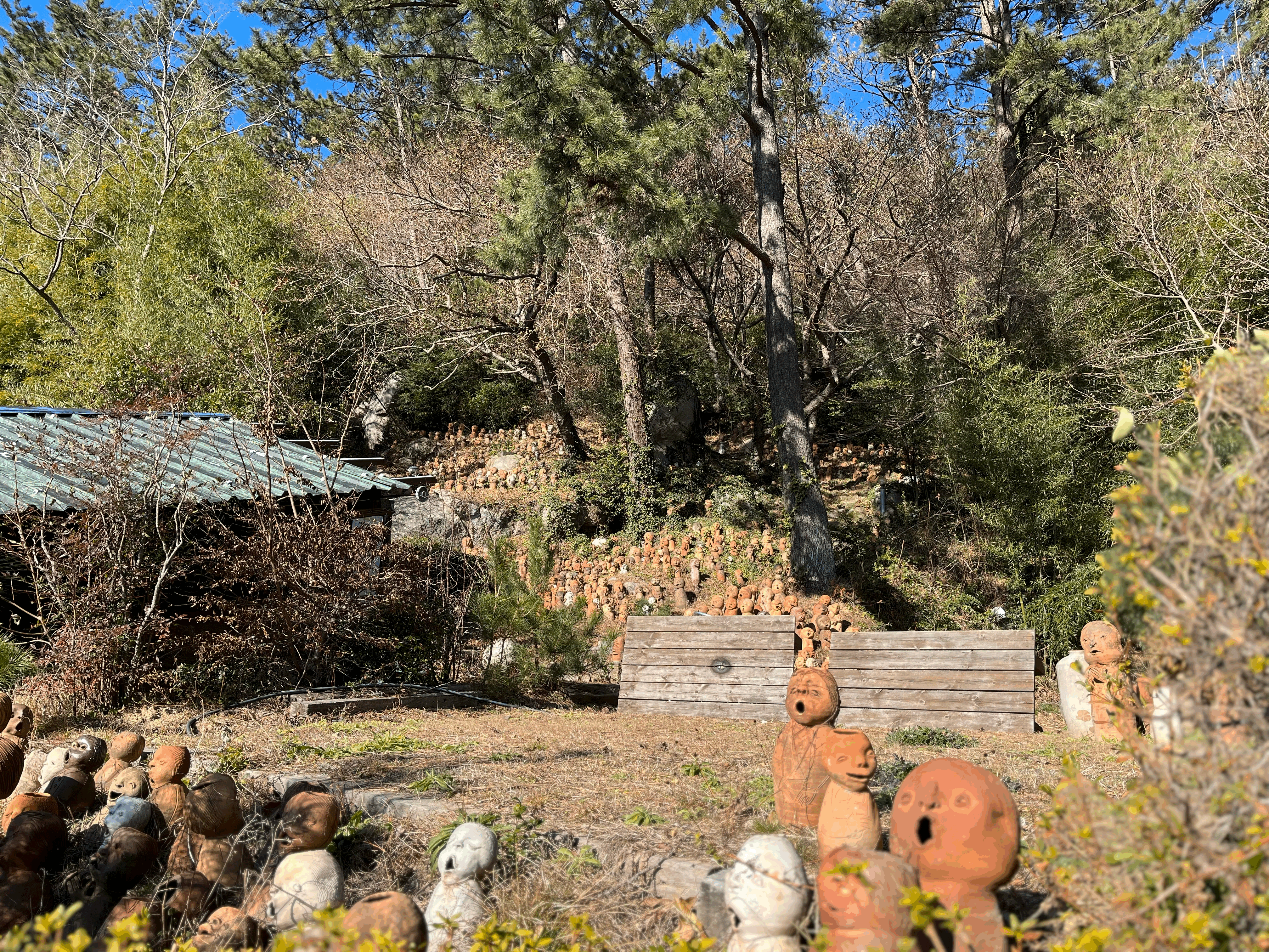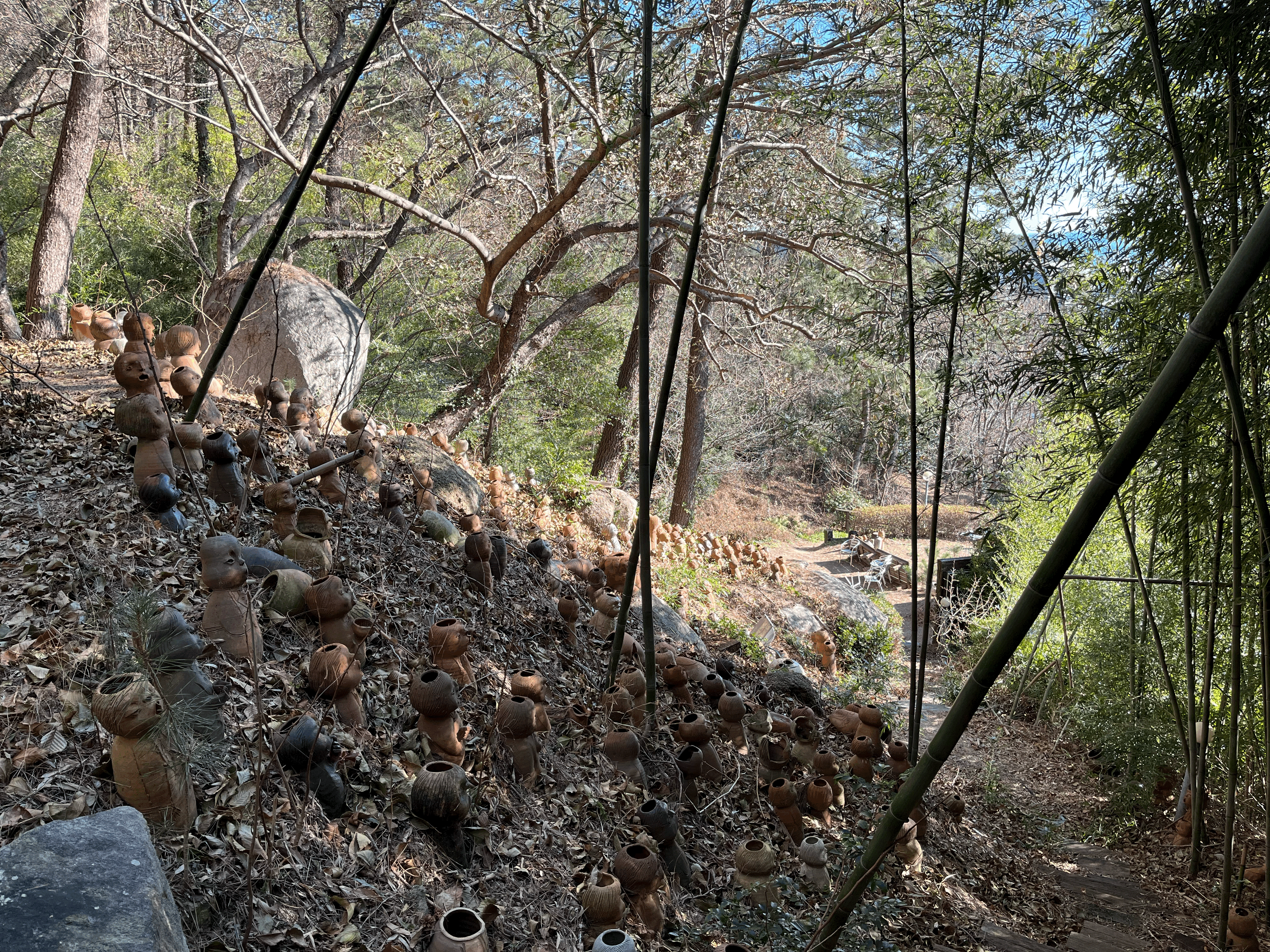 가마터를 입구로 산쪽으로 올라가면 새로운 세상이 펼쳐진다. 노래하는 듯한 입모양의 도자기들이 제멋대로 생긴 표정으로 노래를 하고 있다. 표정이 같은 게 하나도 없는 게 특징이고 심지어 크기도 다르고 몸통도 머리사이즈, 스타일도 모두 다르다. 수량도 엄청나서 하나 가져가도 모를 듯하다 ㅎㅎ 대나무로 둘러싼 작은 산길을 따라 아래에서부터 위까지 한 바퀴를 돌면서 토우들의 무리를 둘러 머리까지 보고 내려오는 산책길이다. 비 오는 날은 미끄러워 울 수도 있고, 나름 경사가 있으니, 주의하면서 둘러봐야 한다.