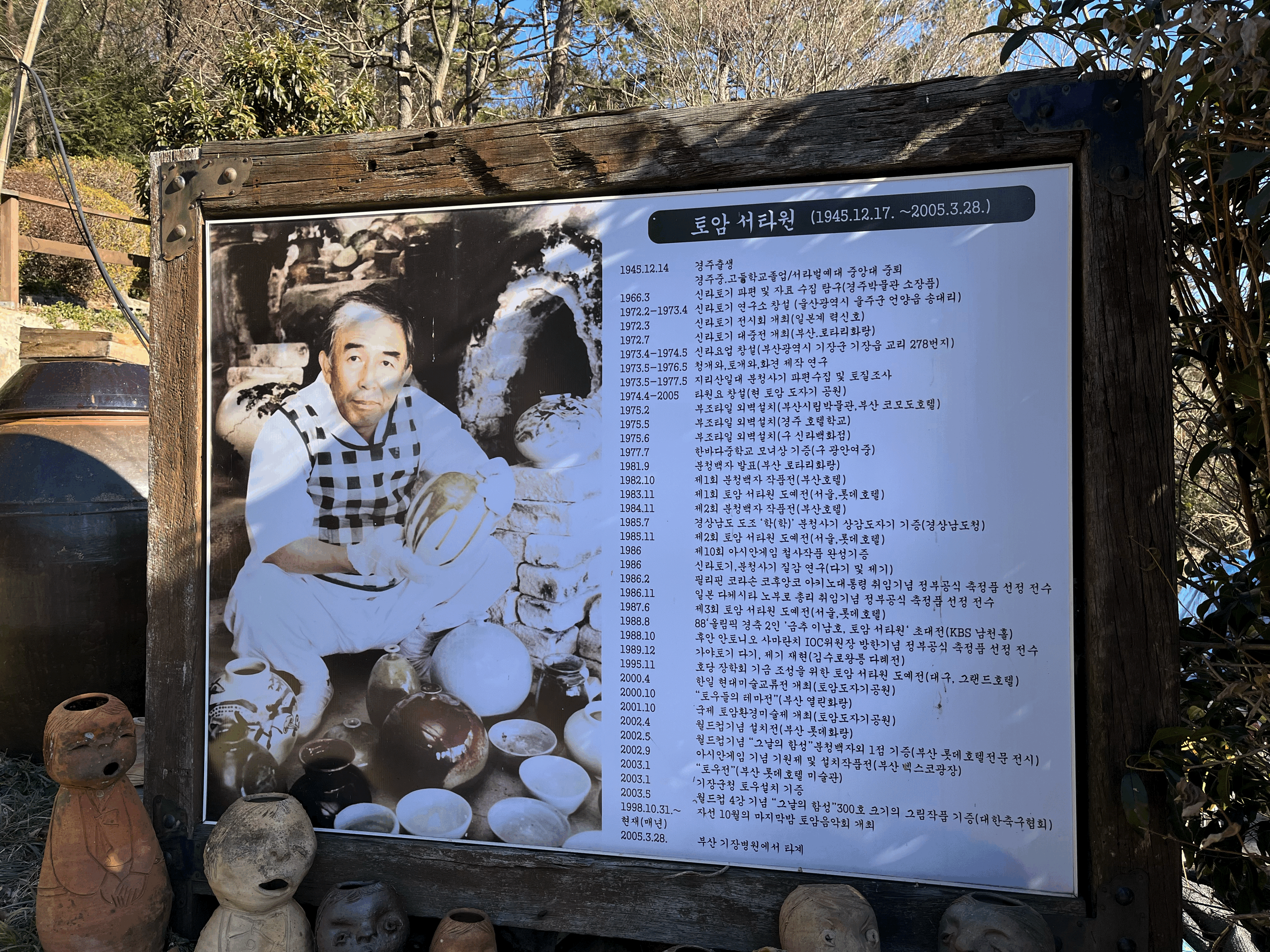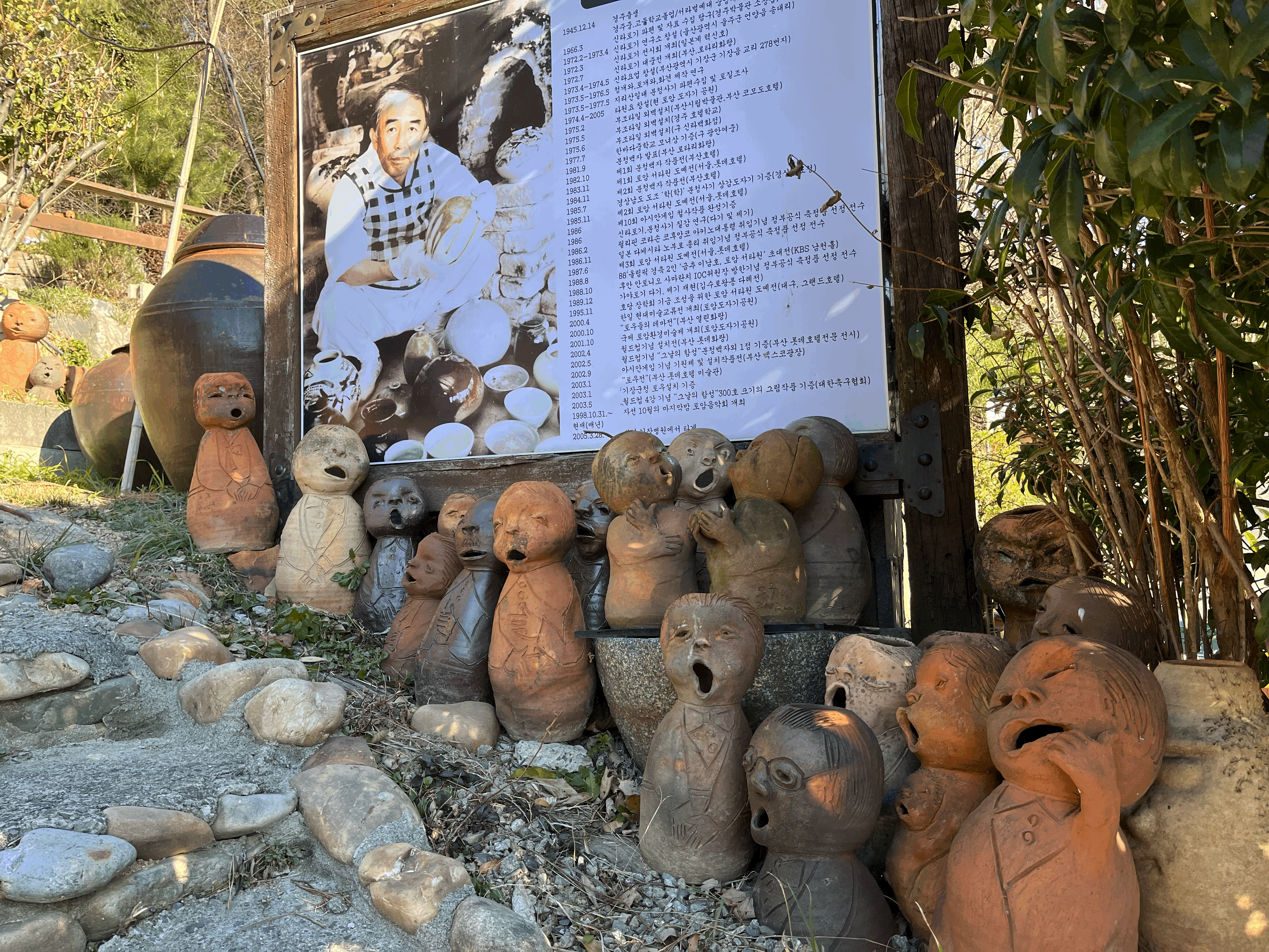 오늘은 손님이 많아서 기다리는 시간이 많아졌다 오히려 다행이다. 이곳을 더 많이 돌아 볼 수 있었다. 입구에는 벤치가 있었고, 토우들이 하나둘 모여 있었다. 도자기공원을 운영? 하신 토암 서타원 선생님의 일생이 기록된 사진과 작품 연혁이 세워져 있었다. 이때만 해도 " 이런 도자기 같은 녀석? 들을 만드셨구나.. " 정도였는데... 그리고, 자세히 보면 입모양만 다른 게 아니라, 머리모양, 생김새, 심지어 옷도 입고 있다.!