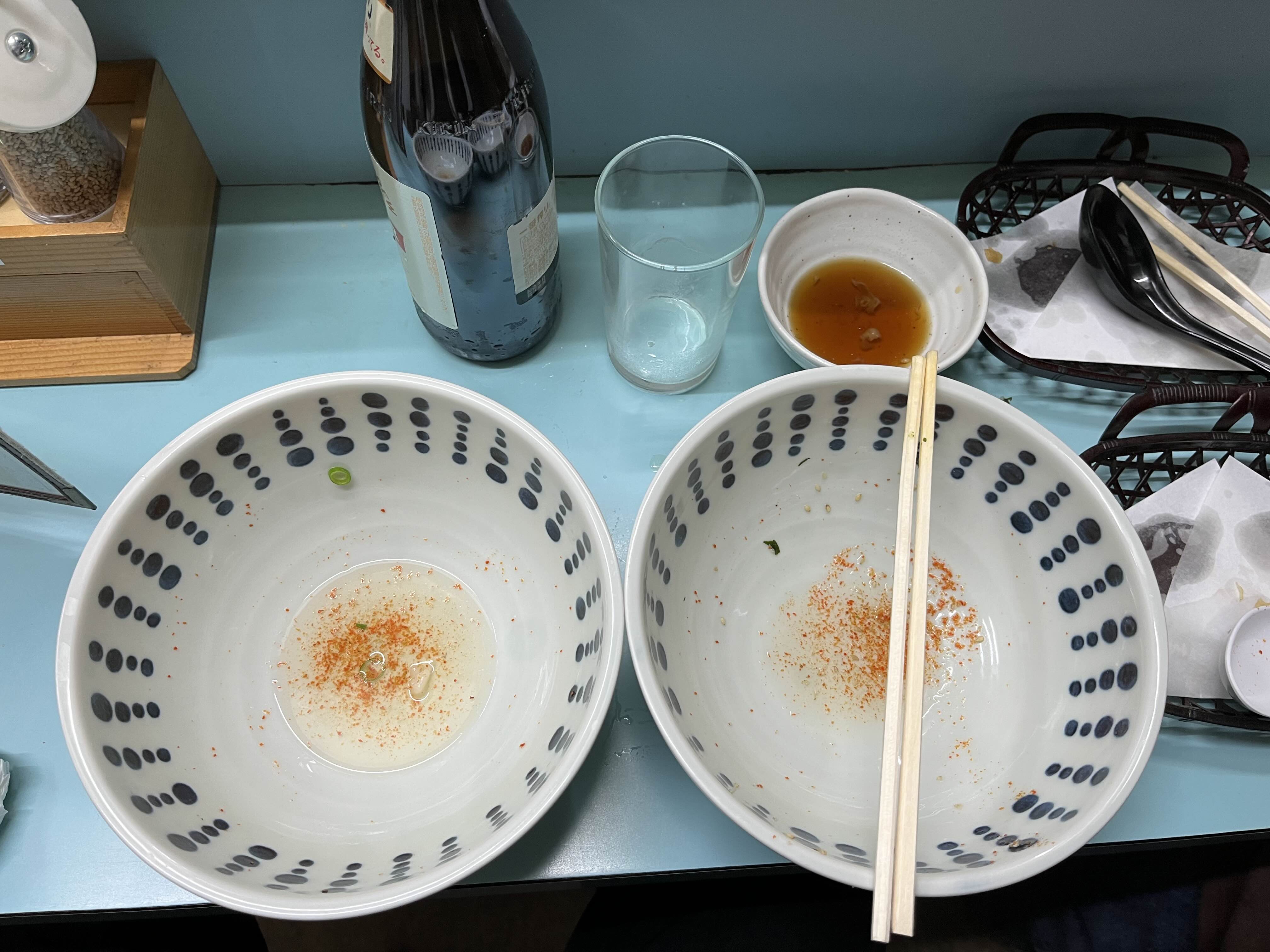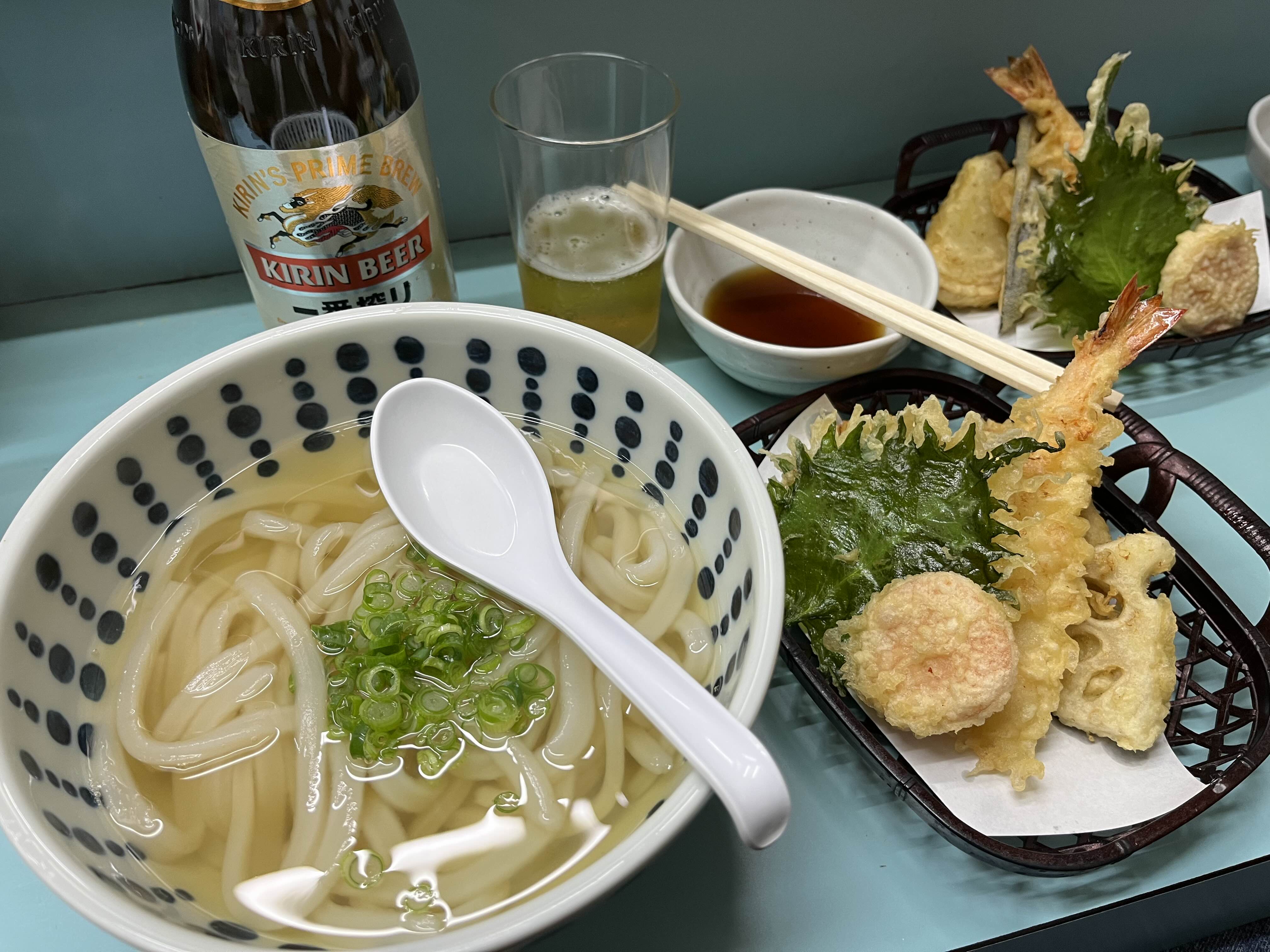 텅빈그릇.. 맥주도 우동도 튀김도 남은게 없었다.