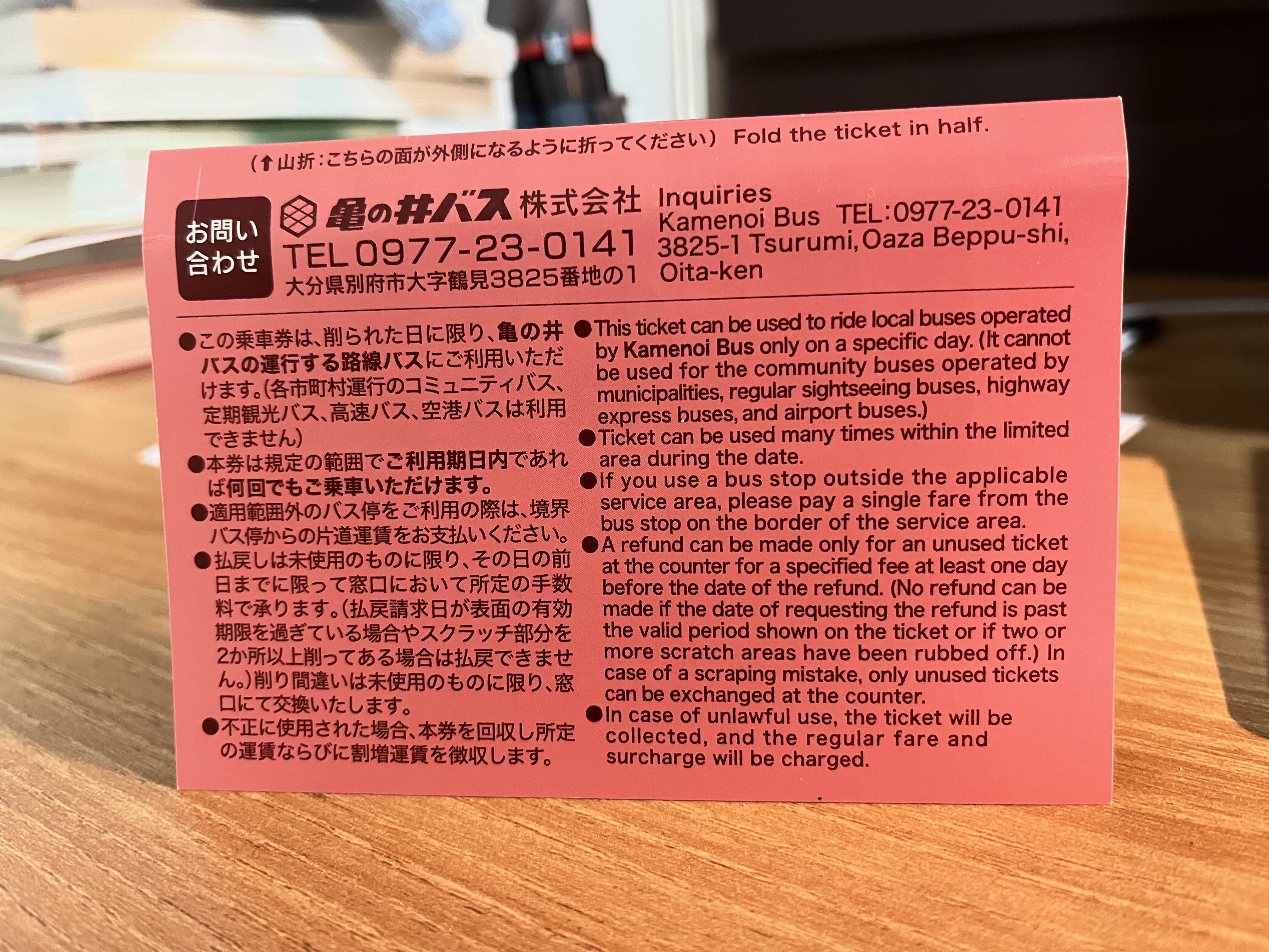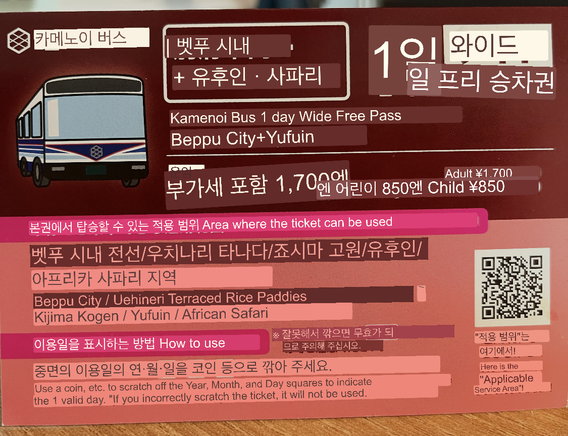 카메노이 일일 버스 무제한 이용권!그렇게 유후인 가는 방법을 문의하고 가격도 티켓도 알려주셨다.! 가능방법은 크게 “시내버스 / 기차 / 고속버스” 가 있는데 우리는 당일 무제한 티켓을 사서 당일치기 버스왕복 이용을 했다!