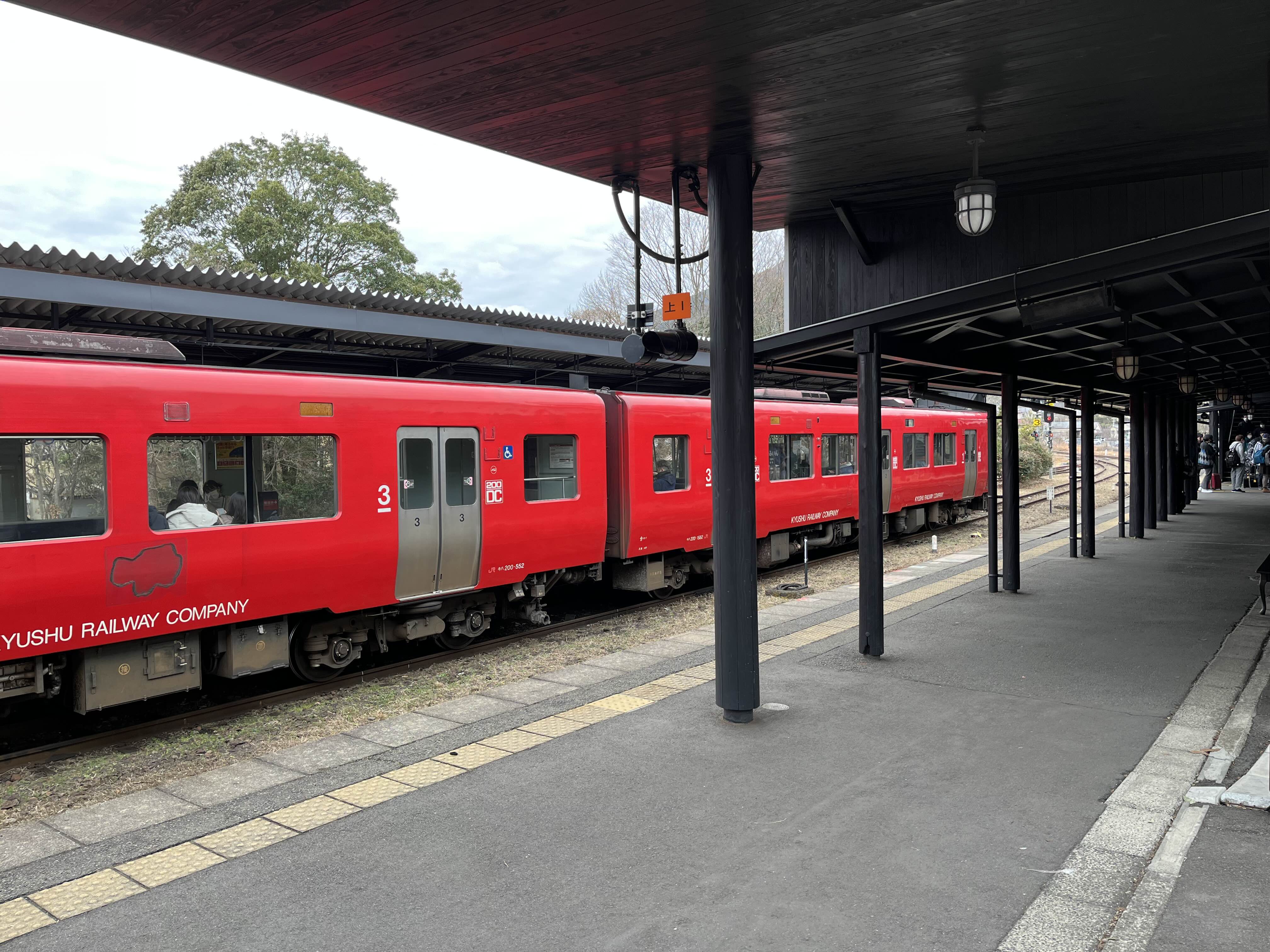 유후인 기차역 붉은 색 기차가 정차중이었다.