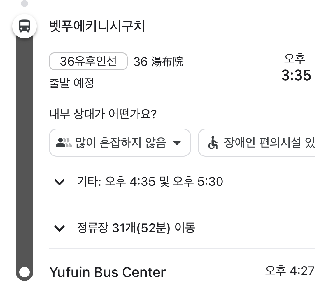 정류소와 안내소 위치 구글맵에서 검색을 하면 생각보다 많은 정류소를 거치고 정차를 한다(뱃부>유후인 31개정류장52분 소요)