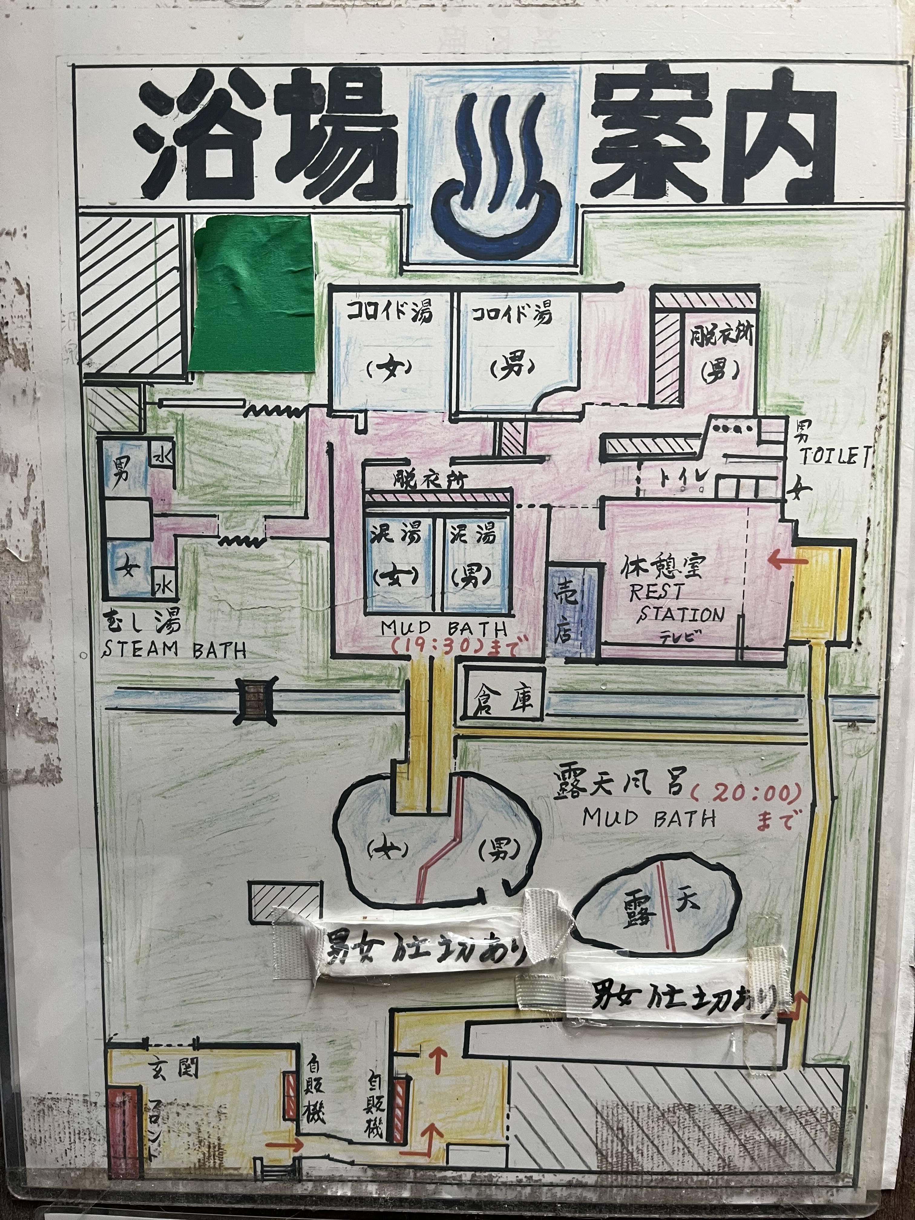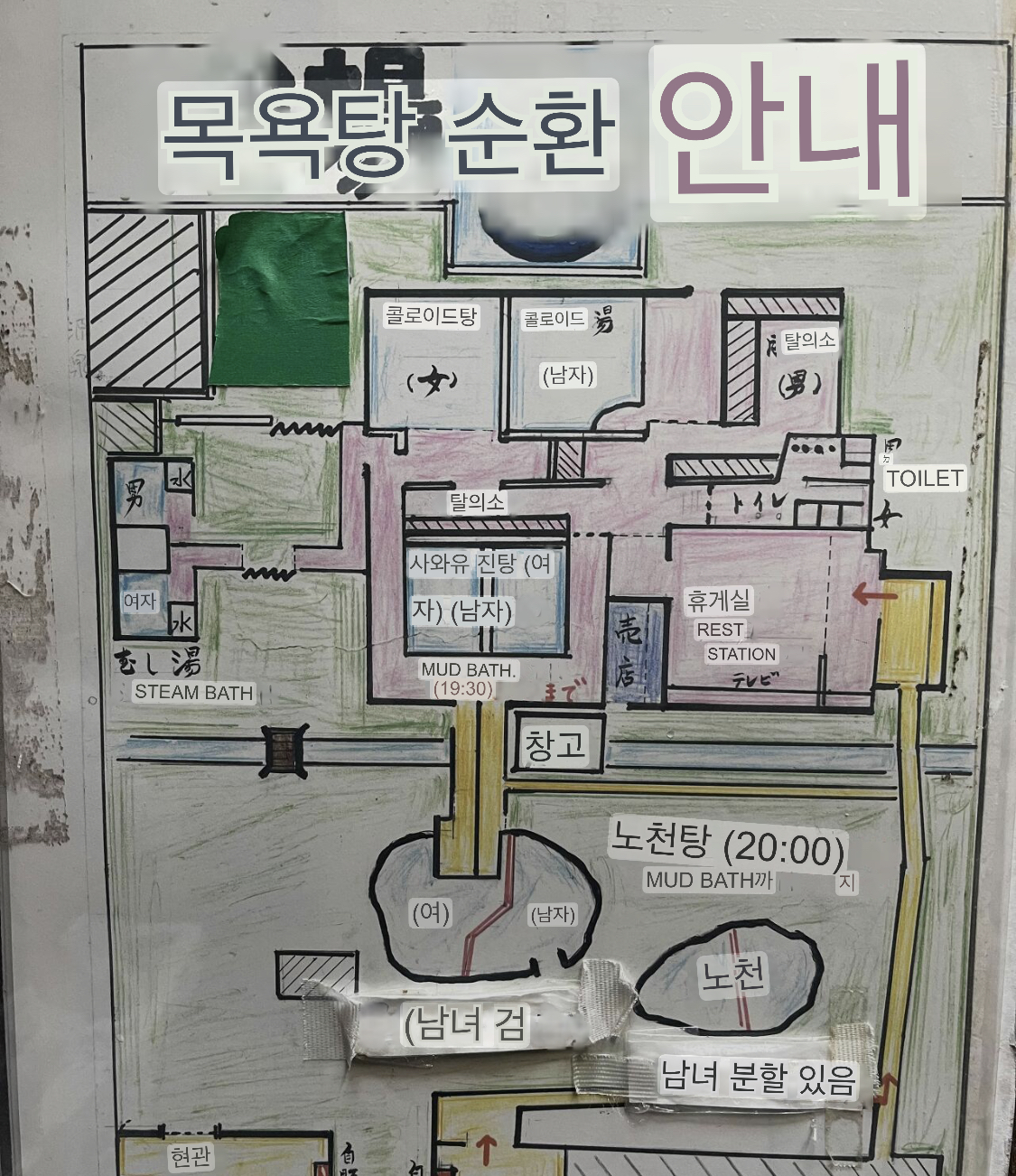 지도가 조금 헷갈릴수도 있다 아래 초록색 야외 길을 따라 걸어내려가야 탕이 있는곳이 나온다. 노랑색이 노천탕이고 위에 지도에서 말한 혼탕이지만, 남녀 구분이 길다란 나무 작대기로 되어있는(분할) 오리지널 머드 탕이다.! 야외가 꺼려지면 야외직전 머드탕도 있으니 이곳에서도 머드는 즐길 수 있다.!