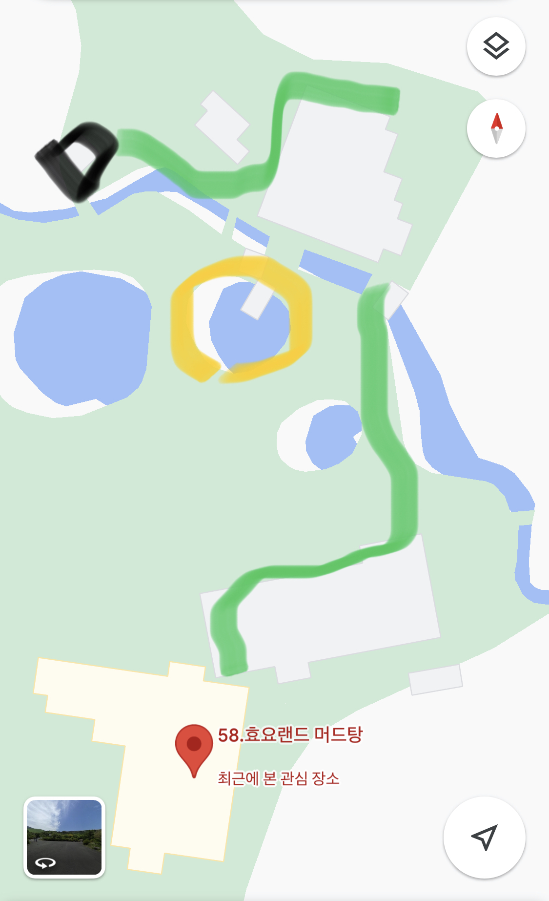 호요랜드 구글 맵에서 본 모습 초록색이 로비에서 탕까지 걸어가는 길, 노랑색이 노천 머드탕.! 아래는 로비 입구에 비치된, 각 장소를 설명한 사진인데 영상한방이면 이해가 쉽지만 장소를 쪼개 놓으니... 어렵다 ㅋㅋ