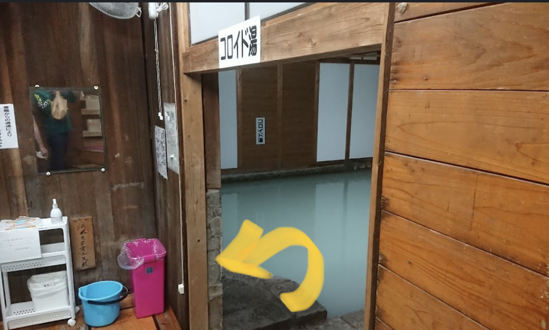 과거 사진 다시 앞에서 말한 온탕으로 와서 몸을 잠깐 담그고, 입구에서 좌측으로 틀면 내려가는길이 보인다. (노랑방향) 입구와 계단이 좁으니 조심해서 내려가면 머드체험탕이 나온다.