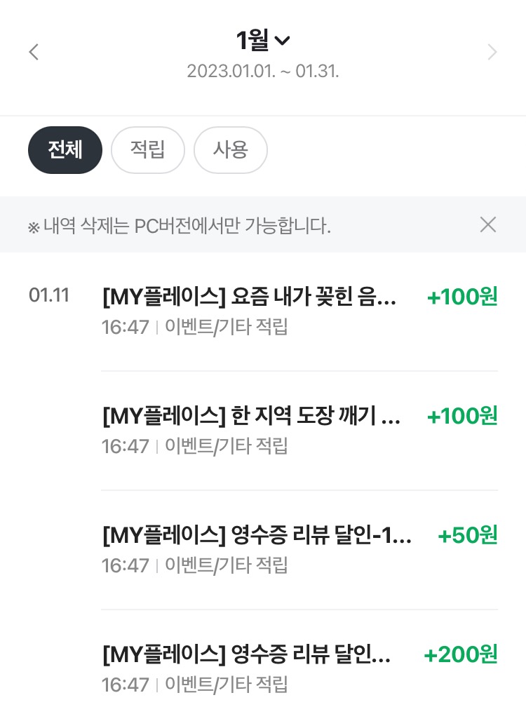 1월 적립된 내용 그리고 사용 내역