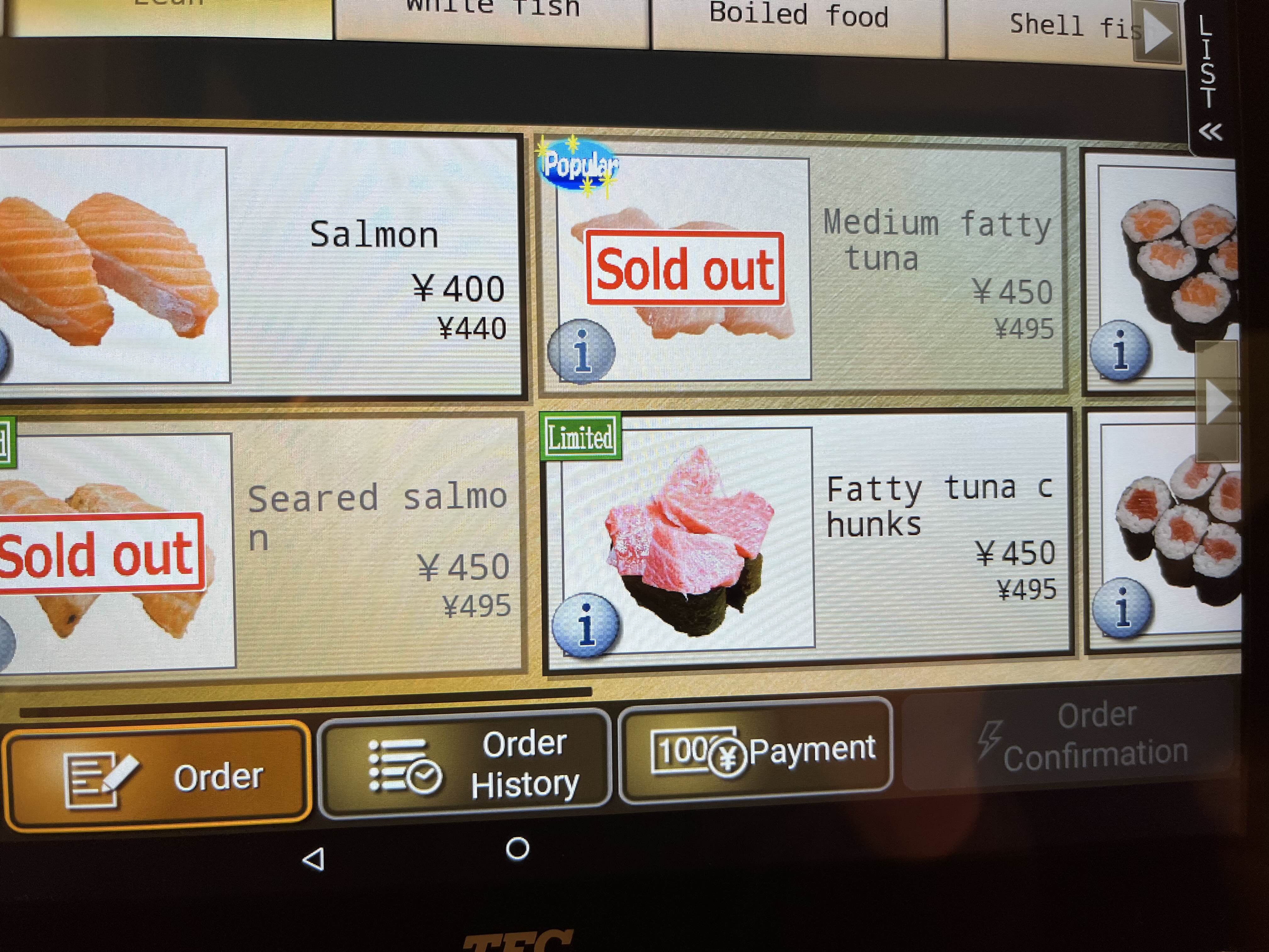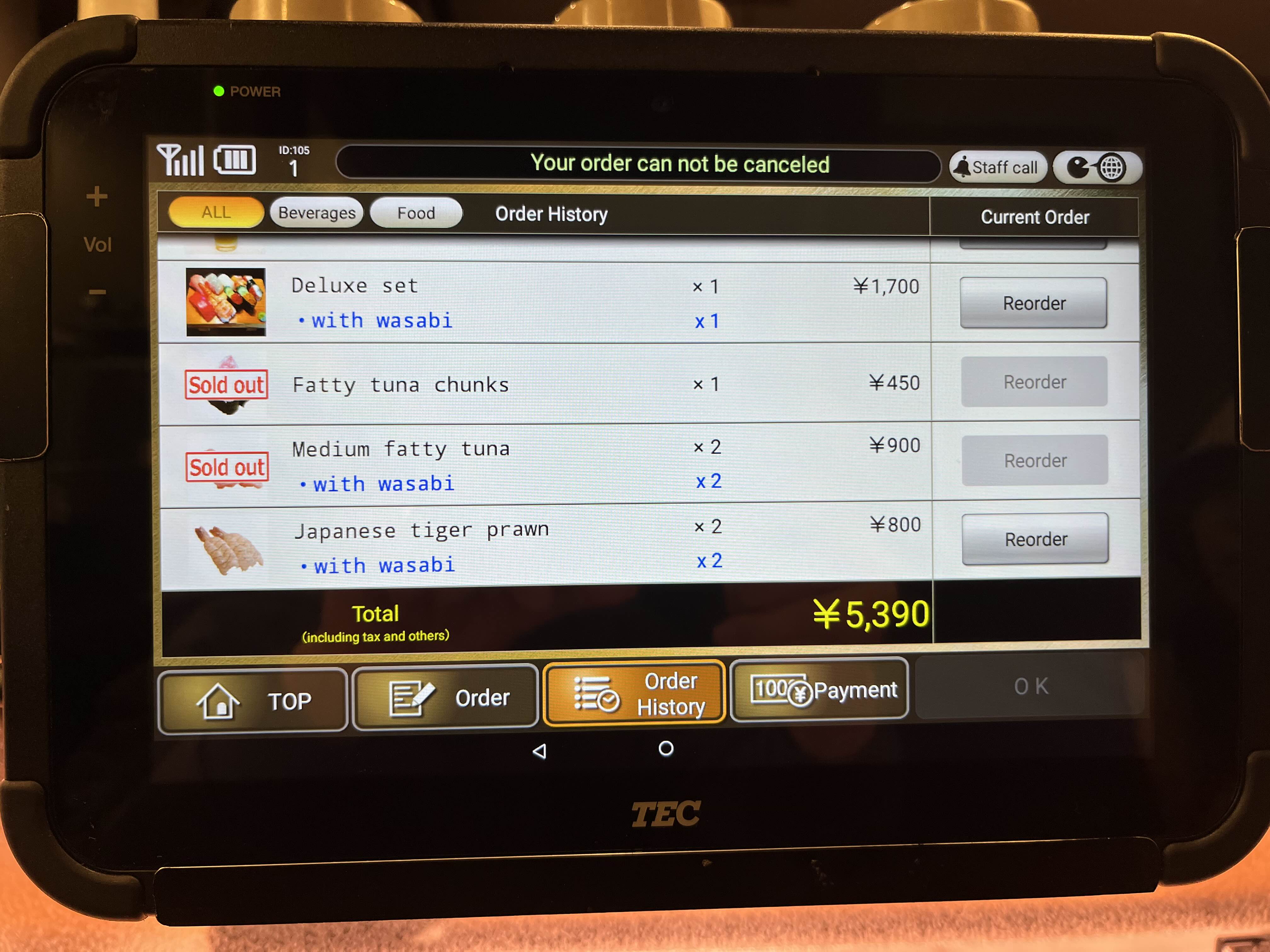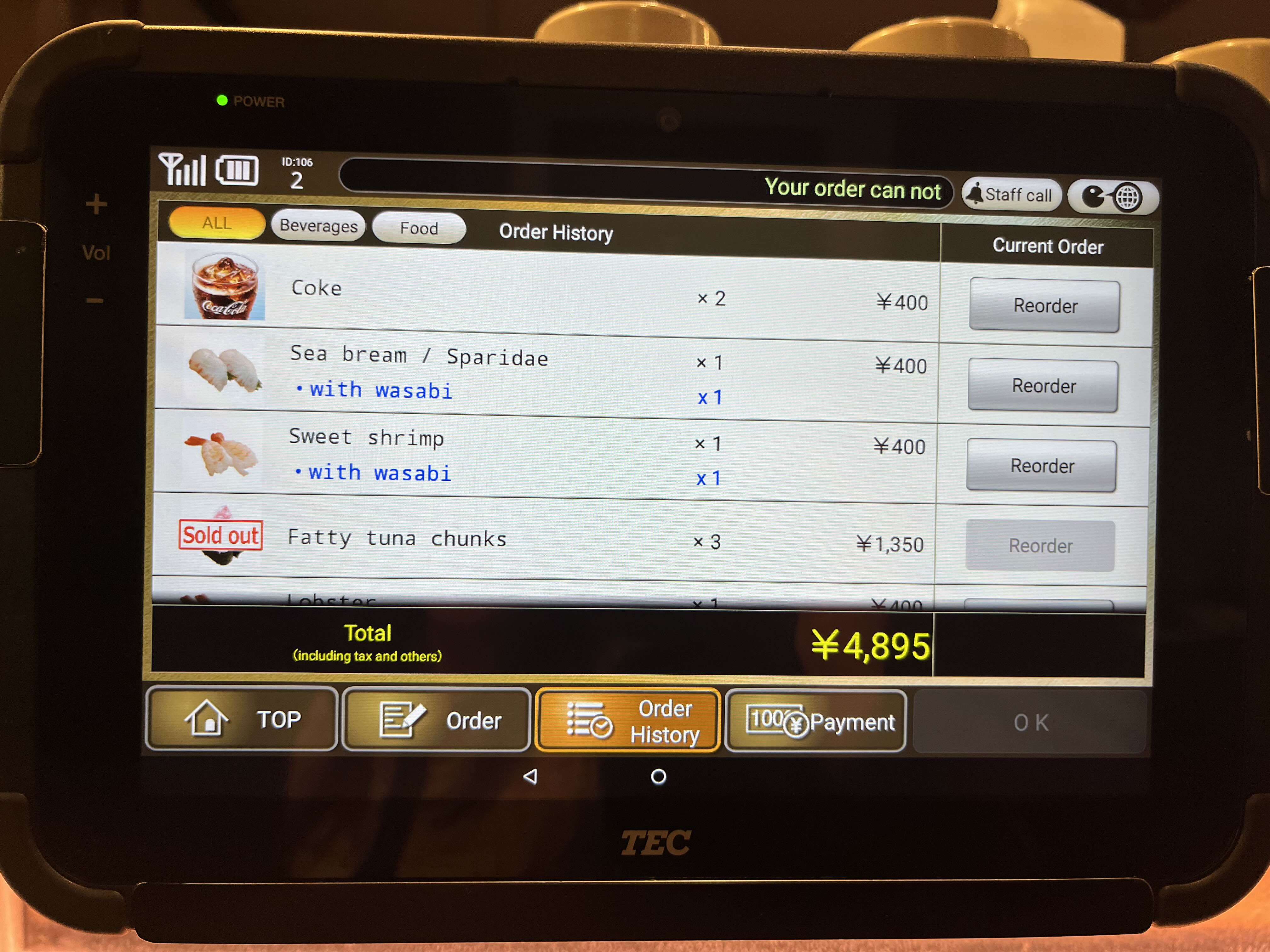 일단 이름을 쓰고, 호명되면 입장(입장후 자리 배정받고 바로앞에 놓인 패드로 주문하면 가져다 주신다. 회전초밥 구조이지만 변경된듯 하다.