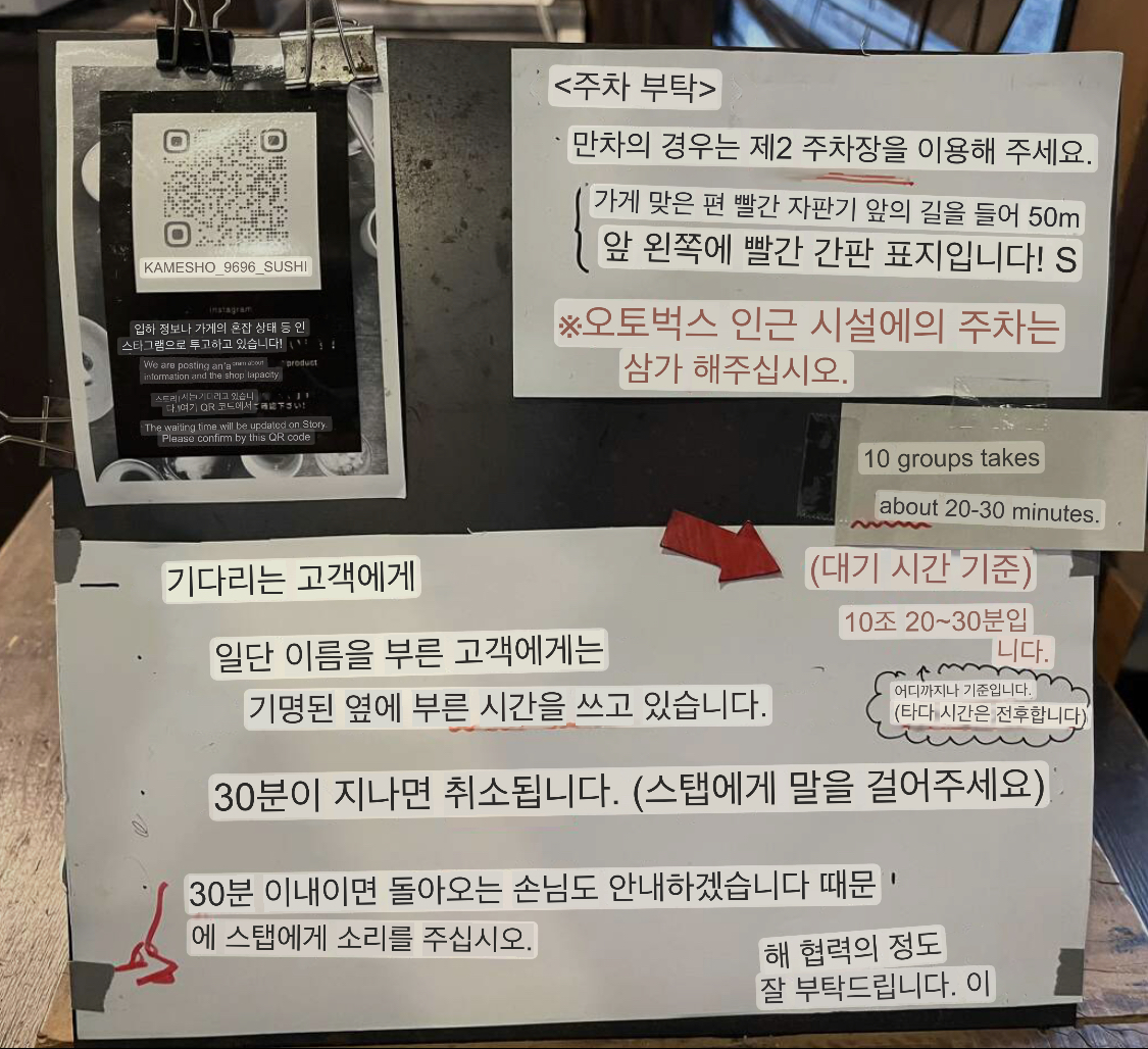 벳부 쿠루쿠루 스시 입구아무도 없어서 쉽게 내부를 볼수 있었다. 복잡해 보이지만 아마도 그날그날 알림을 주는곳. 나중에는 이곳이 대기공간 치고는 너무나 작다는것을 알았다. 특히 겨울에는 밖에서 대기가 너무 힘들었다. ㅠㅠ