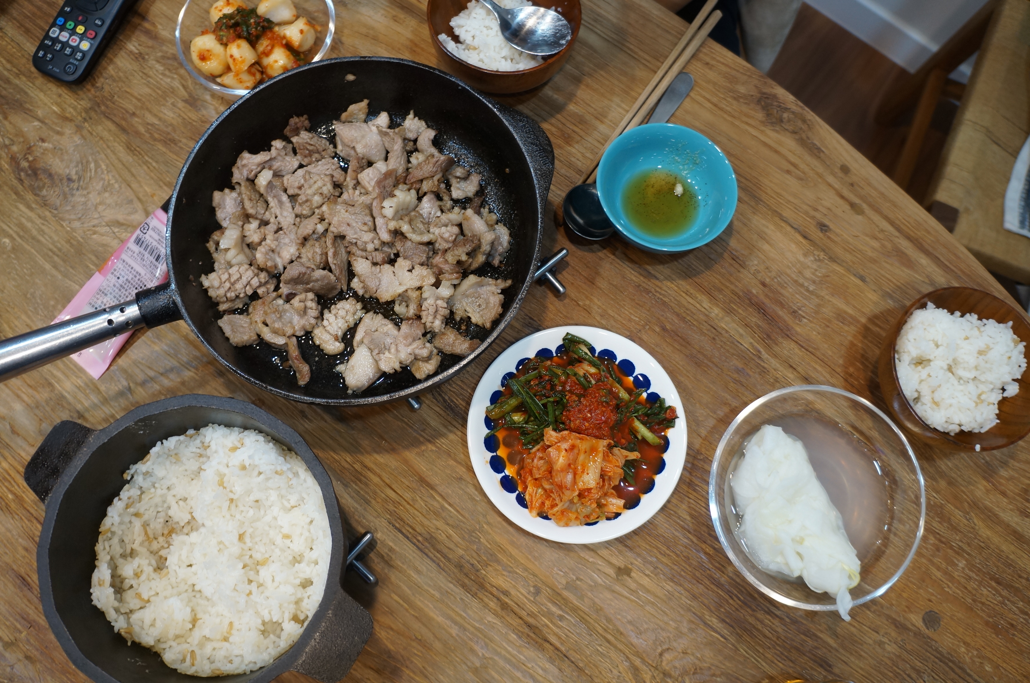 솥밥완성, 밑반찬 준비완료, 그리고 고기도 반반 잘 구어졌다. 스켑슐트 소테팬을 이용해서 고기를 구어주었고, 두툼한 무쇠로 인해 아주 맛깔나게 구워졌다.!