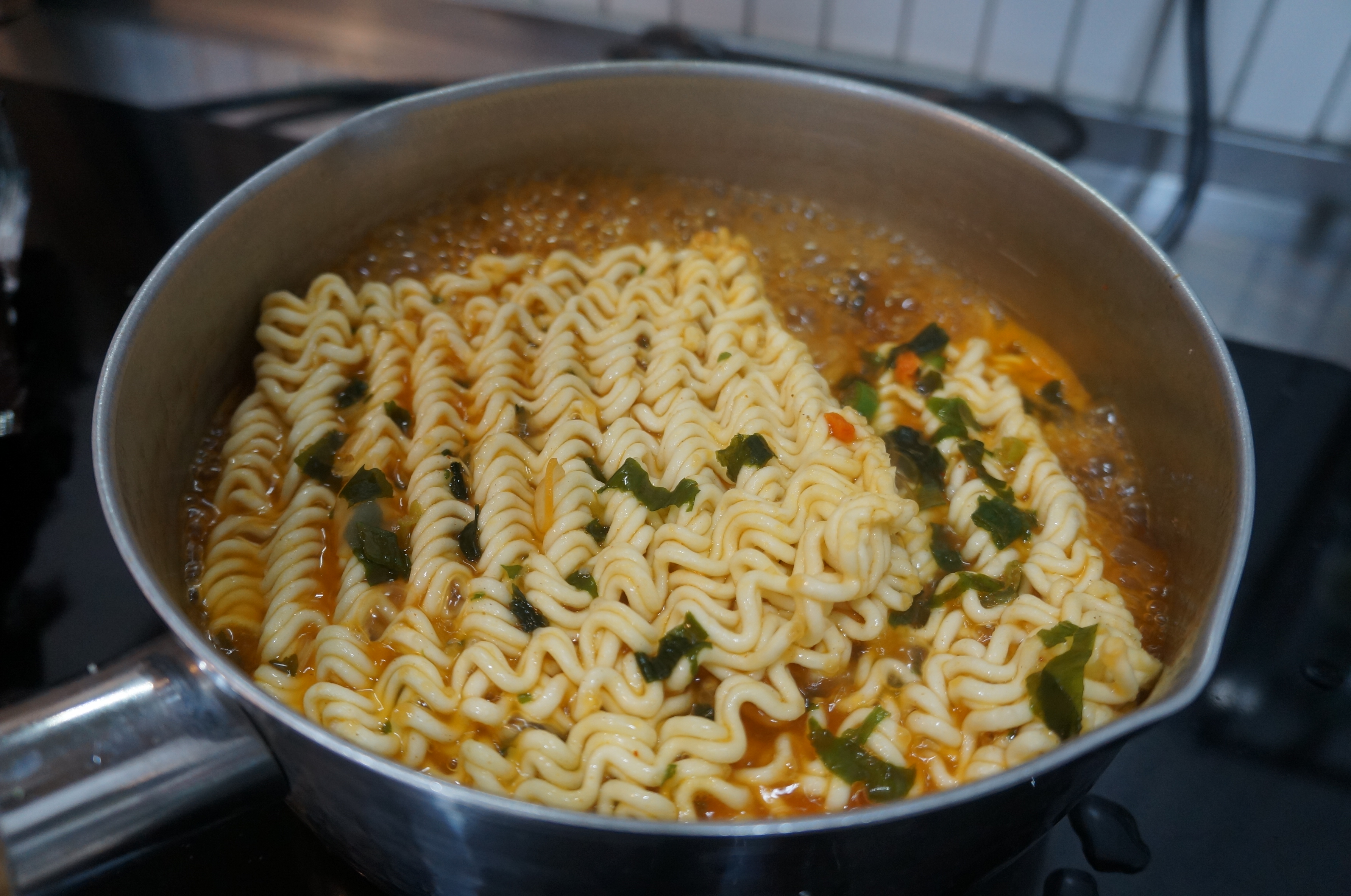 면을넣어주고면을 두개나 넣어준다. 보글보글 쎈불에 익혀줘야 맛난다!