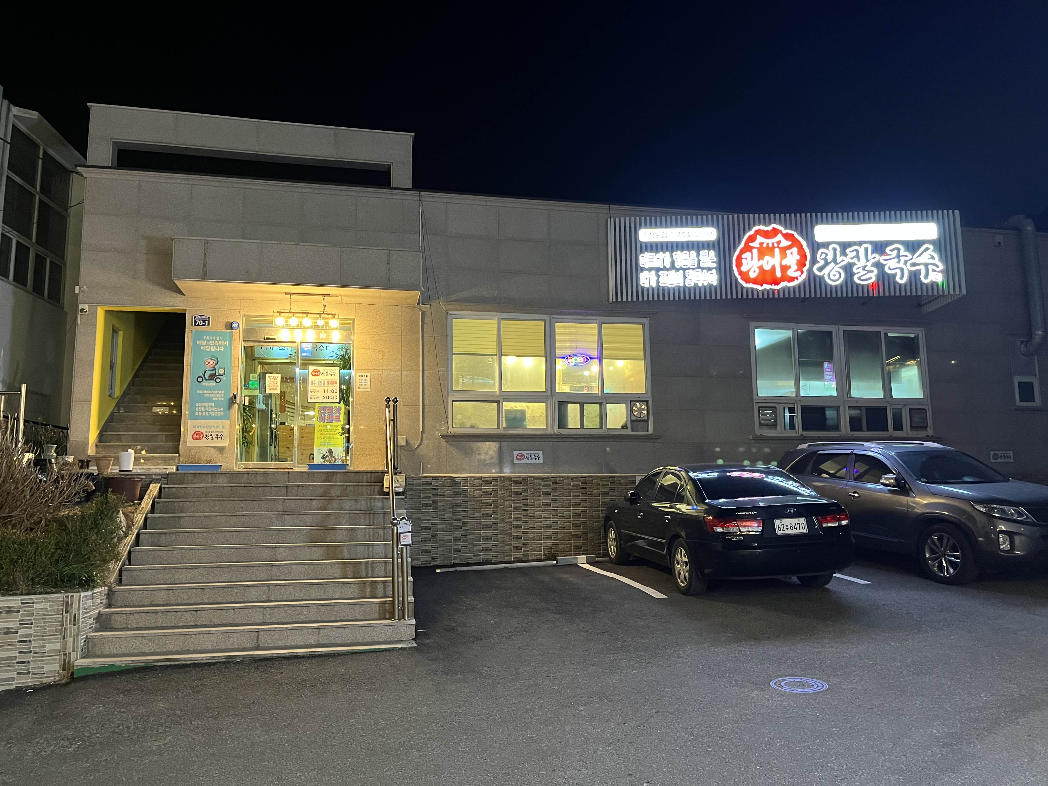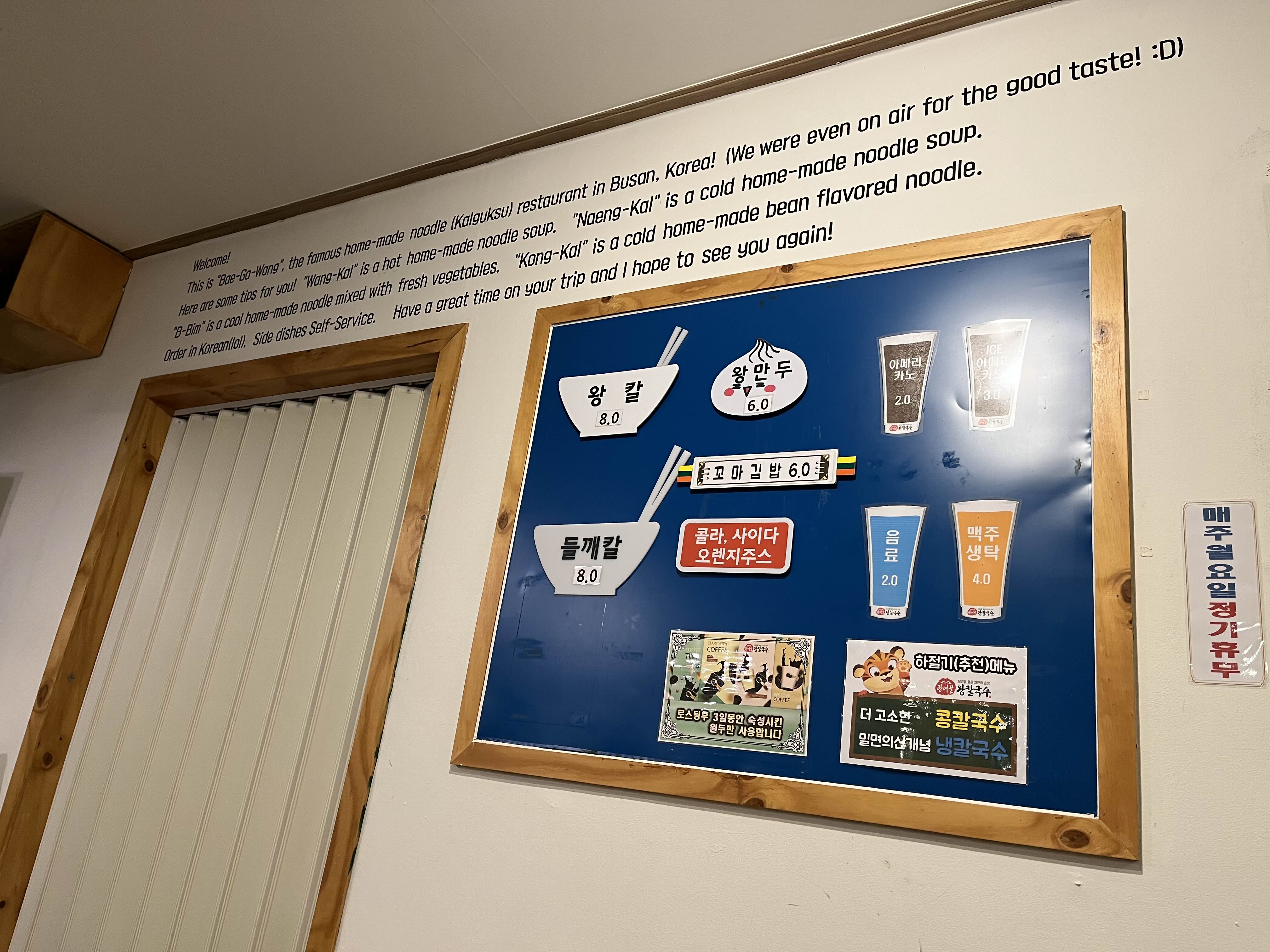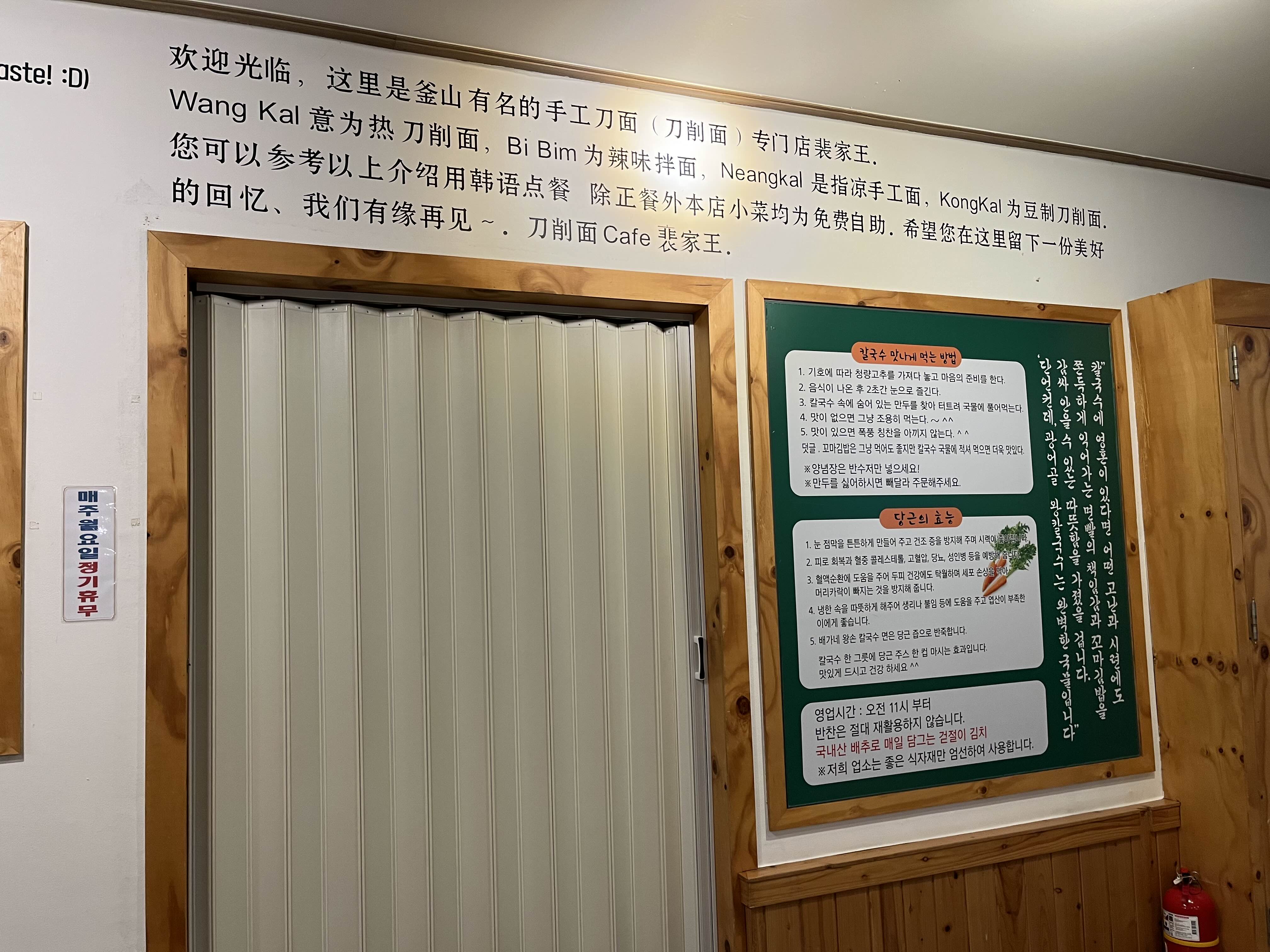 광어골 왕칼국수 내부모습계단을 올라서면 매장입구좌측 당근을 넣어빚은 반죽이 숙성되고 있고, 카운터옆으로 주방이 있다. 화장실은 창결하며, 국제적? 언어로 설명이 되어있다. 사장님이 DJ출신이라고 한듯하다.(그런데 추측이되는 부분이 배가왕 송정점만 판매되고, 나머지 매장은 운영되는듯 그래서 배가왕에서 광어골로 바뀐게 아닌지..)