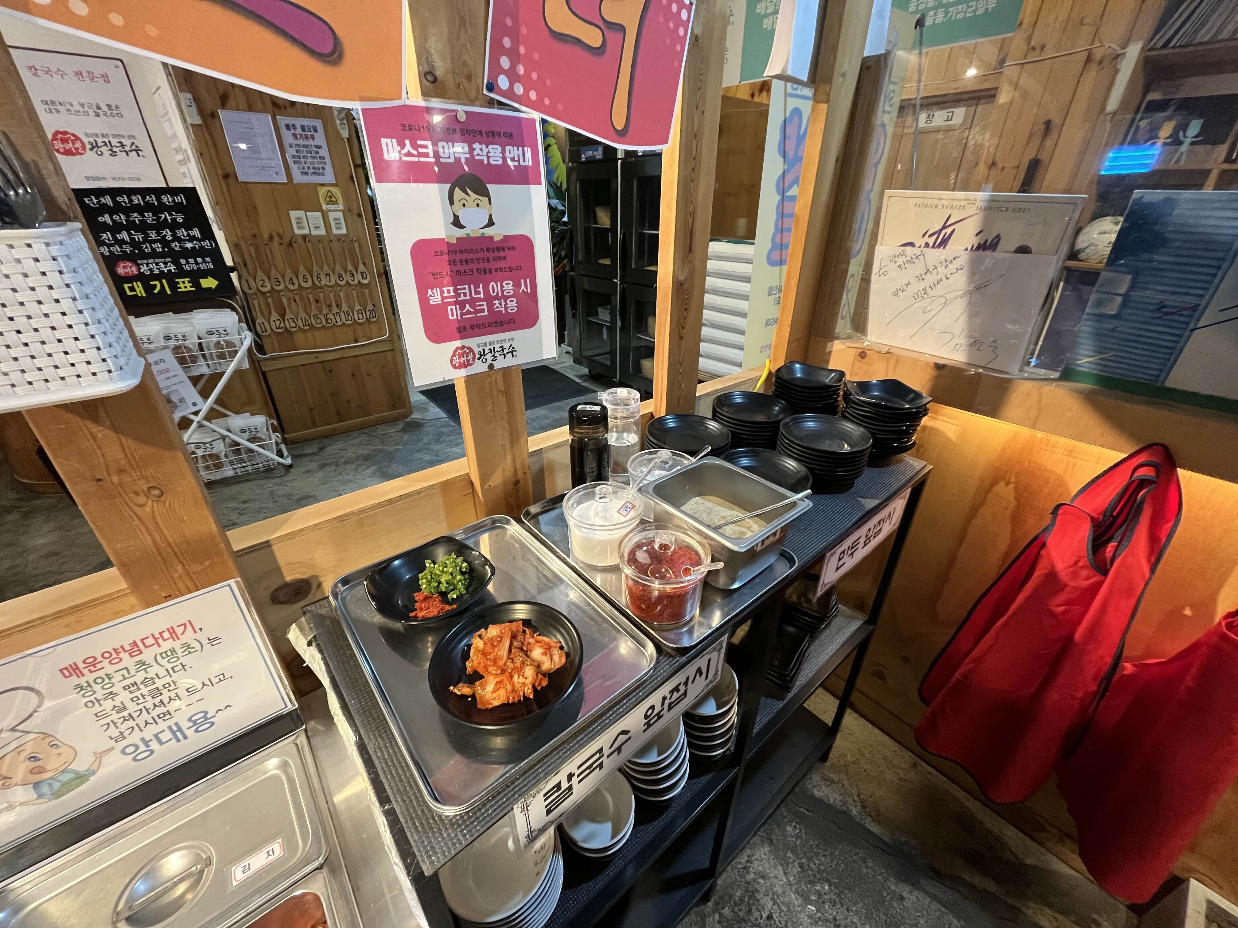 광어골 왕칼국수 셀프바이용일부 김치와 다대기는 셀프바를 이용해서 먹을 수 있다, 앞치마도 있으니 참고